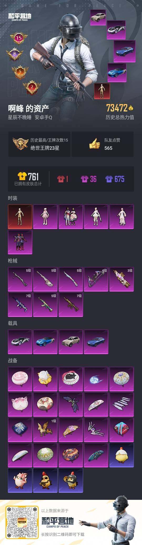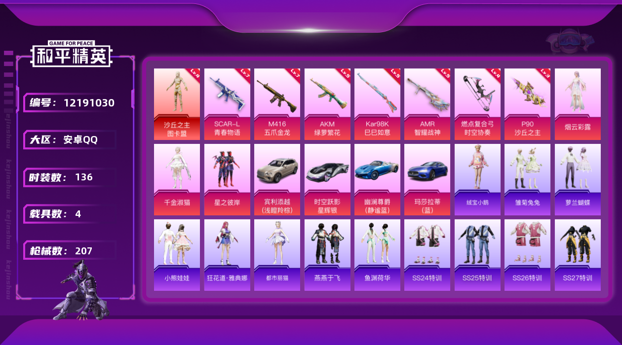 - PX_1985510- 苹果手Q-10王牌印记-7粉装-7特效枪-4载具-64135热力值-137套装-149枪皮-1卓越印记-0传奇印记 【7粉装】,雪国幻梦,梦幻火箭,蝶舞迷情,千金淑猫,金曜白虎,守护骑士,鸾凤武仙 【7特效枪】SCAR-L-梦幻火箭-6级 M416-五爪金龙-7级 M416-墨龙九天-3级 GROZA-镜光银凌-4级 Kar98K-巳巳如意-5级 P90-沙丘之主-3级 P