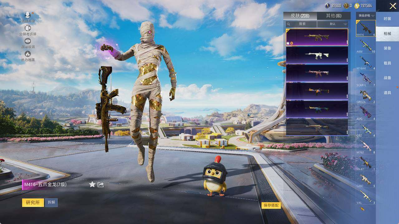 AKM-绿萝繁花,SCAR-L-青春物语,M416-五爪金龙,P90-沙丘之主,Kar98K-巳巳如意