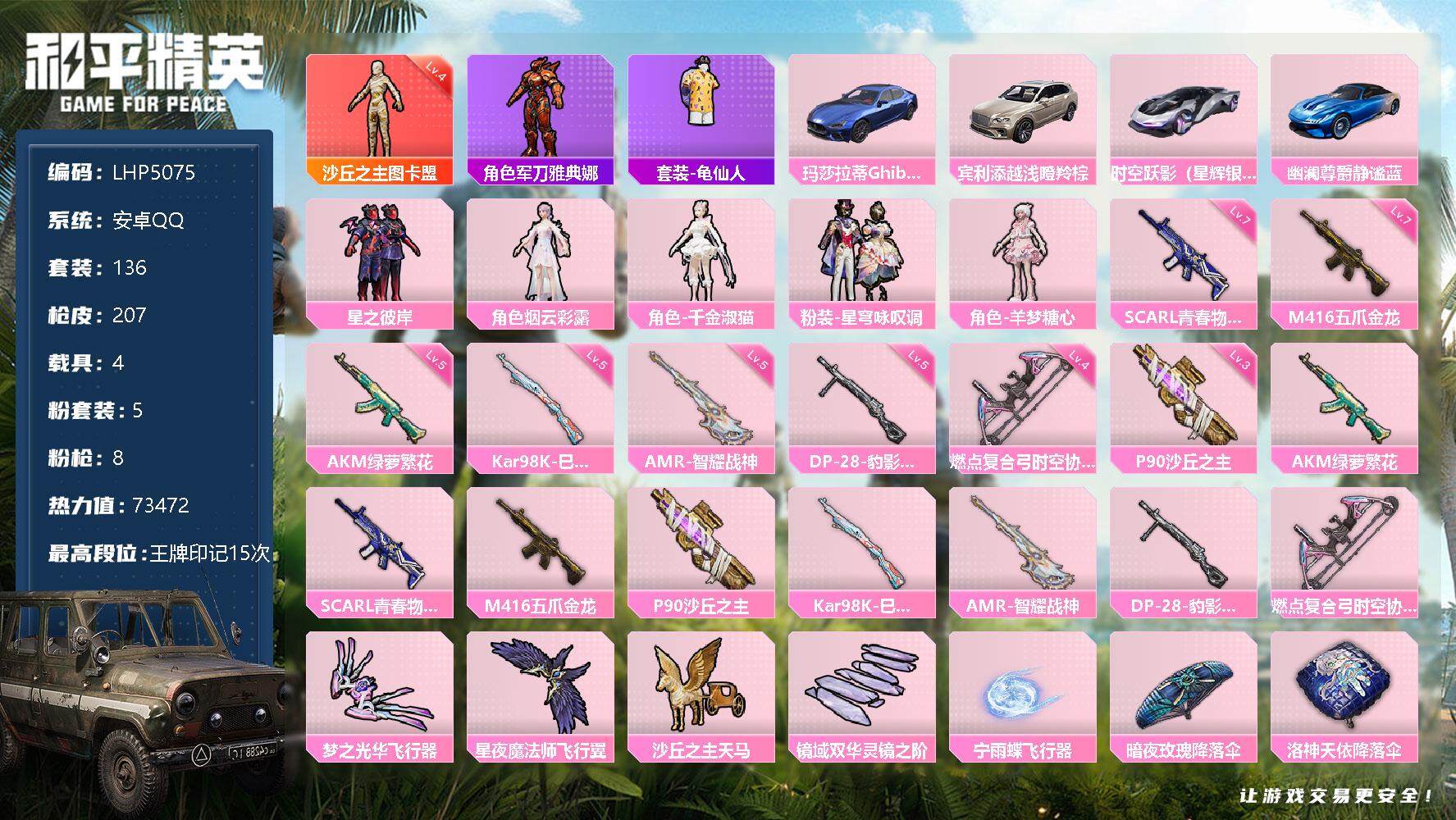 [12191030]素材身法号/绝世印记2【特价急出/详情看图】:安卓 手Q-1神装-5粉装-8特效枪-4载具-5粉色飞行器-7.3w热力值-15王牌印记-136套装-207枪皮【红色神装等级】:沙丘之主-图卡盟(四级)【热门品类】:角色-军刀雅典娜,套装-龟仙人【粉色载具】:玛莎拉蒂Ghibli(蓝),宾利添越(浅瞪羚棕),时空跃影(星辉银),幽澜尊爵(静谧蓝)【粉色套装】:粉装-星之彼岸,角色-烟云彩露,角色-千金淑猫,粉装-星穹咏叹调,角色-羊梦糖心【粉色枪皮等级】:AKM-绿萝繁花(五级),SCAR-L-青春物语(七级),M416-五爪金龙(七级),P90-沙丘之主(三级),Kar98K-巳巳如意(五级),AMR-智耀战神(五级),DP-28-豹影疾电(五级),燃点复合弓-时空协奏(四级)【粉色飞行器】:梦之光华飞行器,星夜魔法师飞行翼,沙丘之主天马,镜域双华-灵镜之阶,宁雨蝶飞行器