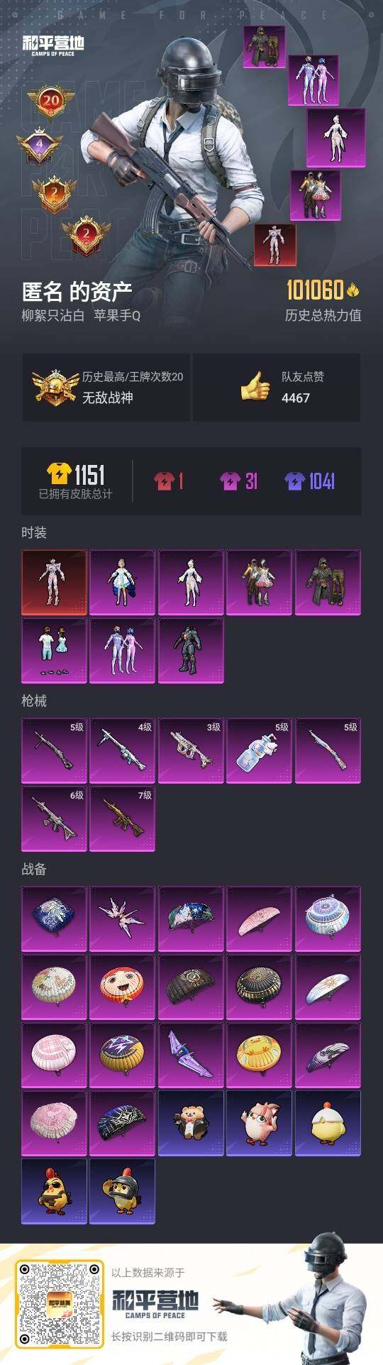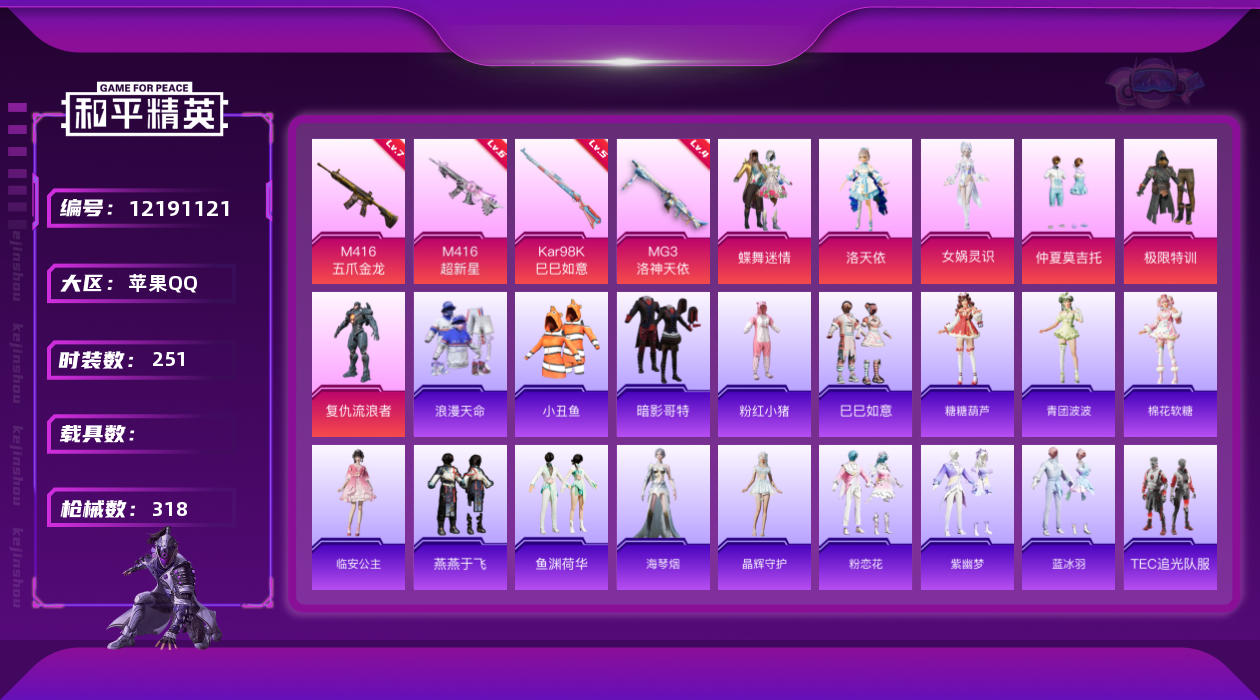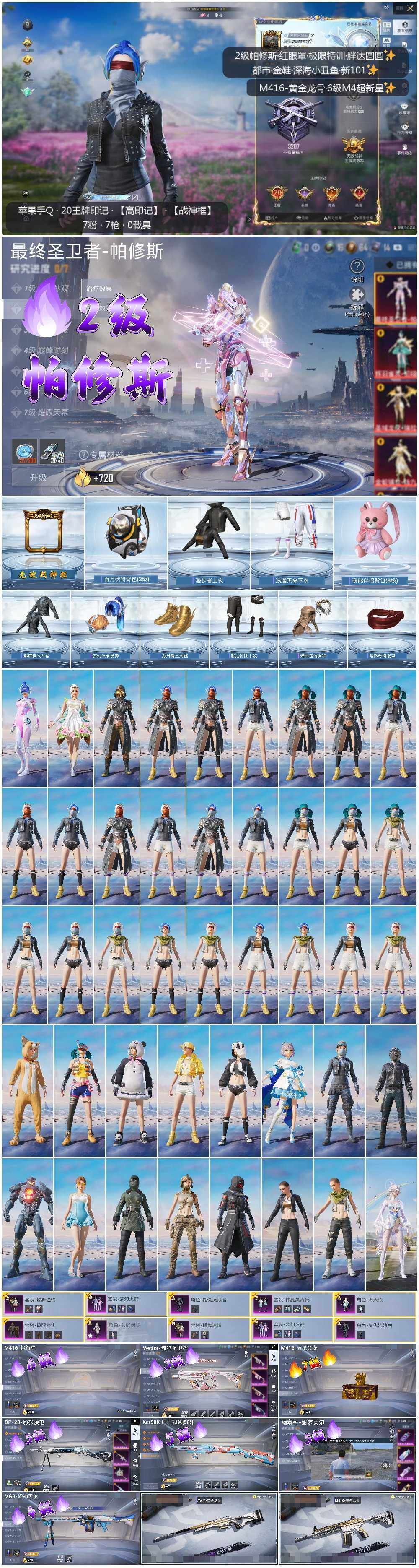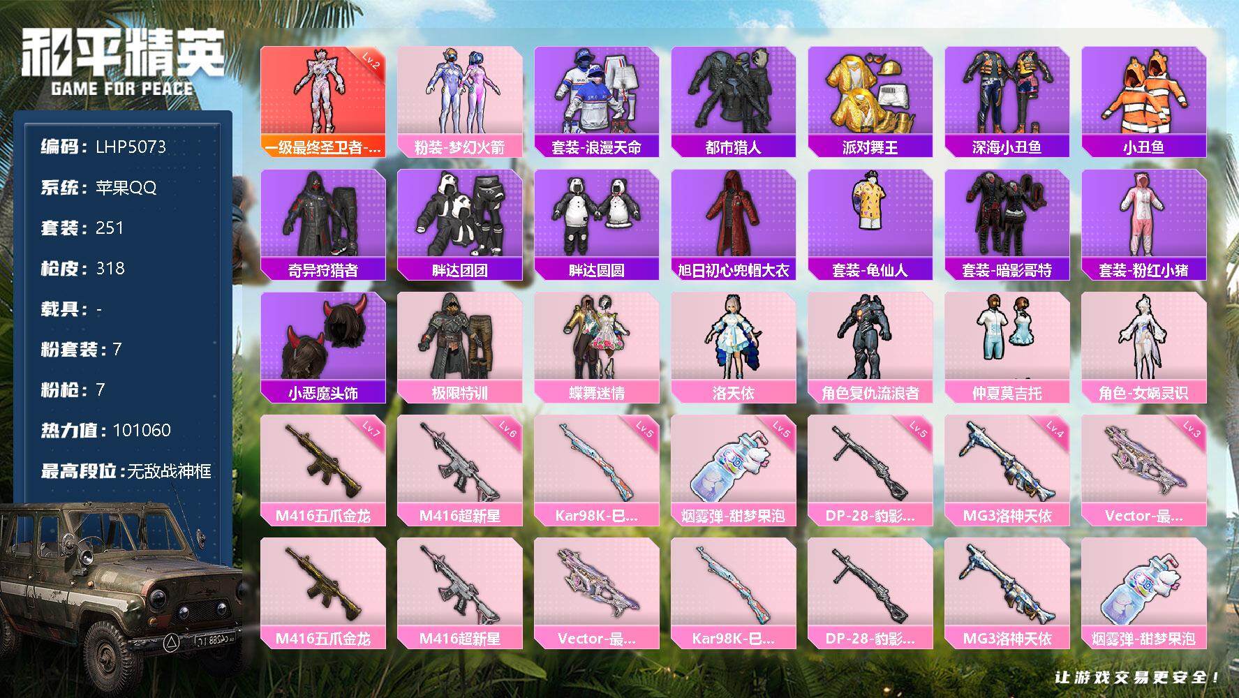 [12191121]素材身法号/无敌战神框1/绝世印记2【特价急出/详情看图】:苹果 手Q-无敌战神框-1神装-7粉装-7特效枪-0载具-2粉色飞行器-10.1w热力值-20王牌印记-251套装-318枪皮【红色神装等级】:最终圣卫者-帕修斯(二级)【热门品类】:粉装-梦幻火箭,套装-浪漫天命,套装-都市猎人,套装-派对舞王,套装-深海小丑鱼,套装-小丑鱼,套装-奇异狩猎者,套装-胖达团团,套装-胖达圆圆,旭日初心兜帽大衣,套装-龟仙人,套装-暗影哥特,套装-粉红小猪,小恶魔头饰【粉色套装】:粉装-极限特训,粉装-蝶舞迷情,粉装-梦幻火箭,角色-洛天依,角色-复仇流浪者,粉装-仲夏莫吉托,角色-女娲灵识【粉色枪皮等级】:M416-五爪金龙(七级),M416-超新星(六级),Vector-最终圣卫者(三级),Kar98K-巳巳如意(五级),DP-28-豹影疾电(五级),MG3-洛神天依(四级),烟雾弹-甜梦果泡(五级)【粉色飞行器】:梦幻火箭飞行器,终晖之翼飞行器