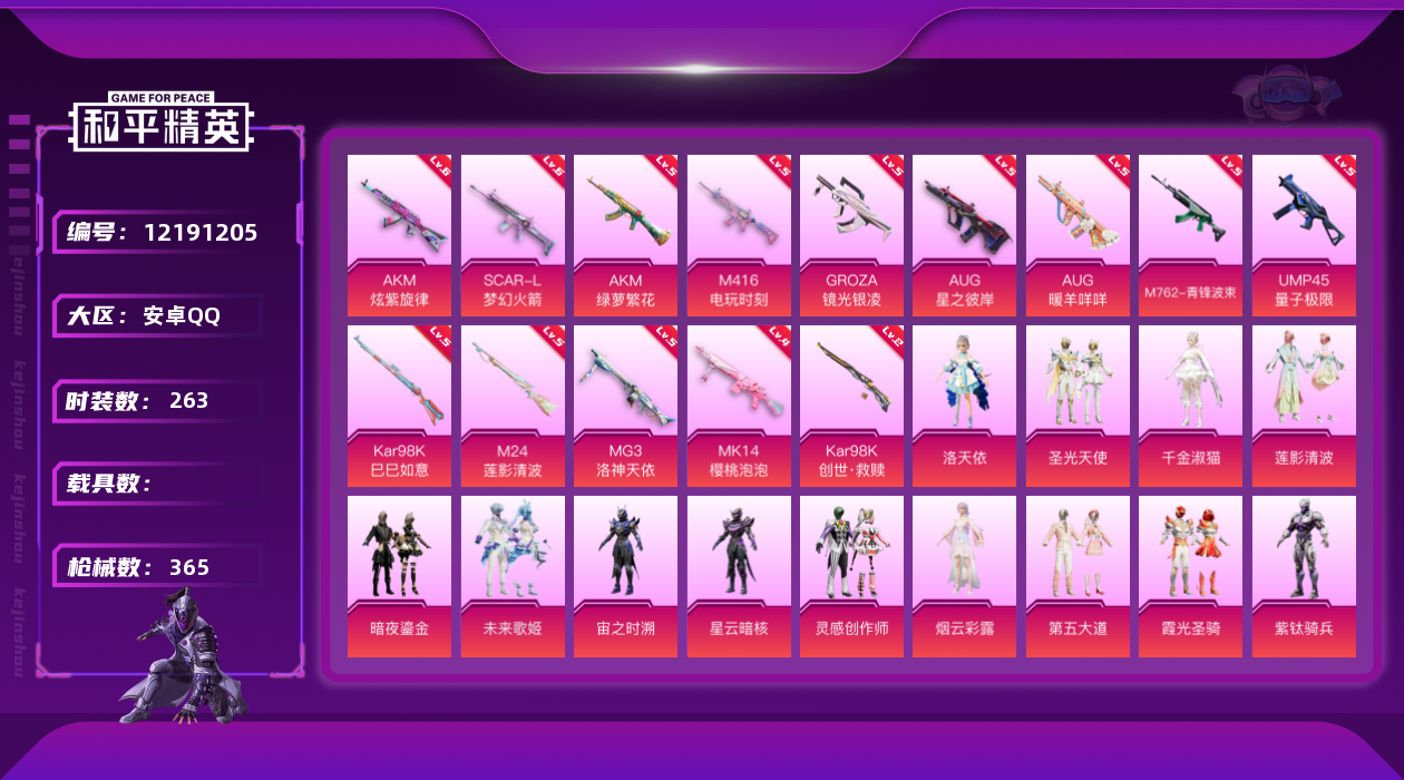 [12191205]【商品标题】:安卓 手Q-17粉装-14特效枪-3粉色飞行器-126739热力值-22王牌印记-263套装-365枪皮
