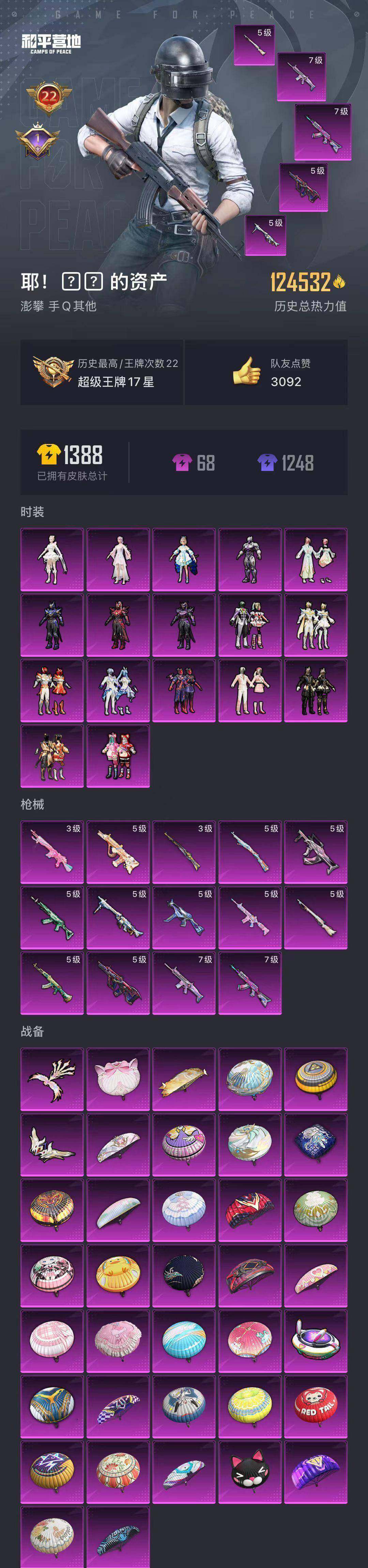 - [12218318]素材身法号/无敌战神框3/老木乃伊/地铁满天赋【特价急出/详情看图】:苹果 手Q-无敌战神框-1神装-8粉装-14特效枪-2载具-6粉色飞行器-7.4w热力值-13王牌印记-141套装-215枪皮【红色神装等级】:最终圣卫者-帕修斯(一级)【热门品类】:粉装-梦幻火箭,粉装-繁龙极客,套装-浪漫天命,套装-都市猎人,套装-冥河战士,套装-深海小丑鱼,套装-龟仙人,套装-浪漫波比,角色-Mark.06【粉色载具】:宝马M4(圣保罗黄),星梦玉骢【粉色套装】:粉装-天使彩虹糖,粉装-梦幻火箭,粉装-放客神游,角色-复仇流浪者,粉装-繁龙极客,角色-智耀战神,角色-狂魅哈莉,角色-异瞳寒姬【粉色枪皮等级】:AKM-梦之光华(五级),SCAR-L-梦幻火箭(五级),M416-心之恋语(六级),GROZA-巴啦啦小魔仙(三级),GROZA-镜光银凌(五级),AUG-星梦奇缘(六级),AUG-暖羊咩咩(五级),Vector-最终圣卫者(三级),AKS-74U-信仰神谕(五级),Kar98K-巳巳如意(五级),AMR-鸢尾晶梦(四级),DP-28-豹影疾电(五级),烟雾弹-甜梦果泡(五级),破片手榴弹-热量炸弹(七级)【粉色飞行器】:梦幻火箭飞行器,繁龙极客飞行器,星梦奇缘飞行器,终晖之翼飞行器,飞天猪飞行器