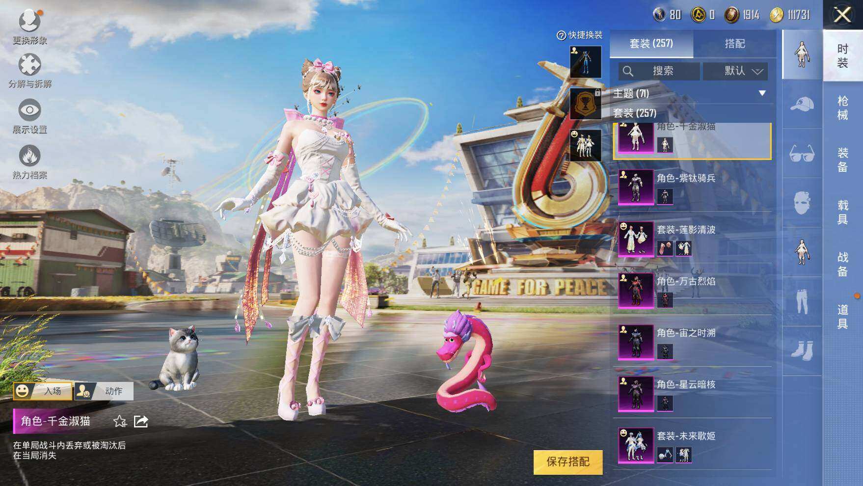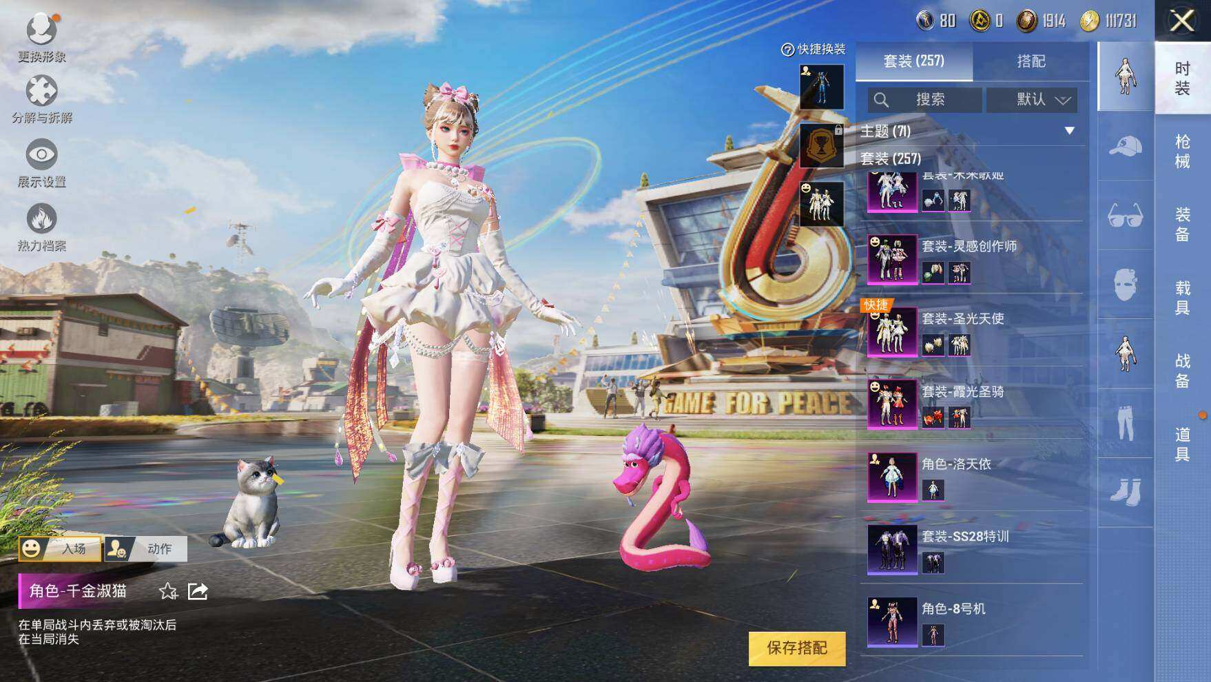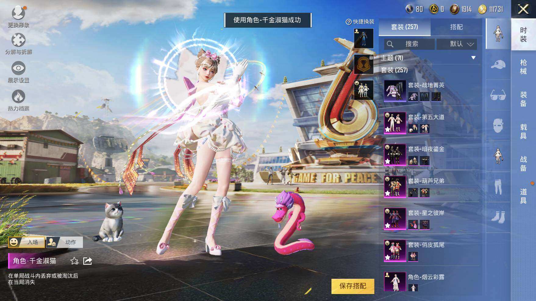 【粉色套装】:粉装-俏皮狐尾,粉装-星之彼岸,粉装-葫芦兄弟,角色-洛天依,粉装-圣光天使,粉装-灵感创作师,粉装-霞光圣骑,粉装-暗夜鎏金,粉装-第五大道,粉装-未来歌姬,角色-万古烈焰,角色-宙之时溯,角色-星云暗核,粉装-莲影清波,角色-紫钛骑兵,角色-烟云彩露,角色-千金淑猫