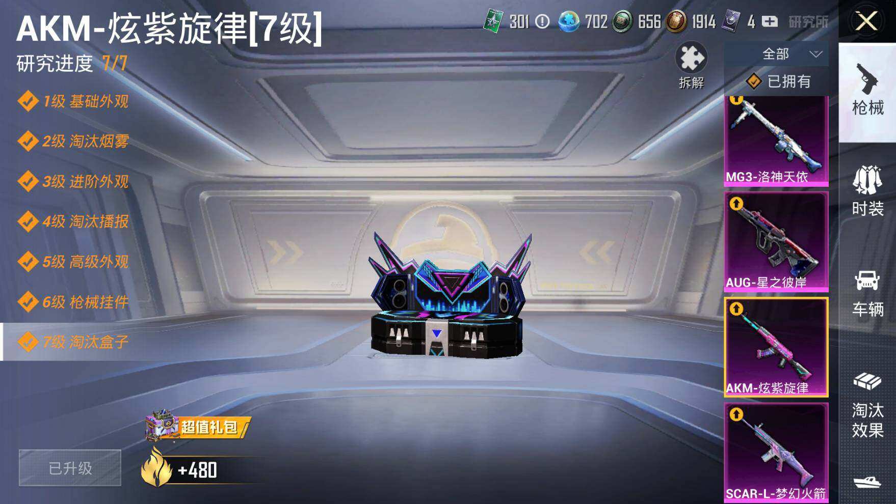 【粉色枪皮等级】:AKM-炫紫旋律(六级),AKM-绿萝繁花(五级),SCAR-L-梦幻火箭(六级),M416-电玩时刻(五级),GROZA-镜光银凌(五级),AUG-星之彼岸(五级),AUG-暖羊咩咩(五级),M762-青锋波束(五级),UMP45-量子极限(五级),Kar98K-创世·救赎(二级),Kar98K-巳巳如意(五级),M24-莲影清波(五级),Mk14-樱桃泡泡(四级),MG3-洛神天依(五级)