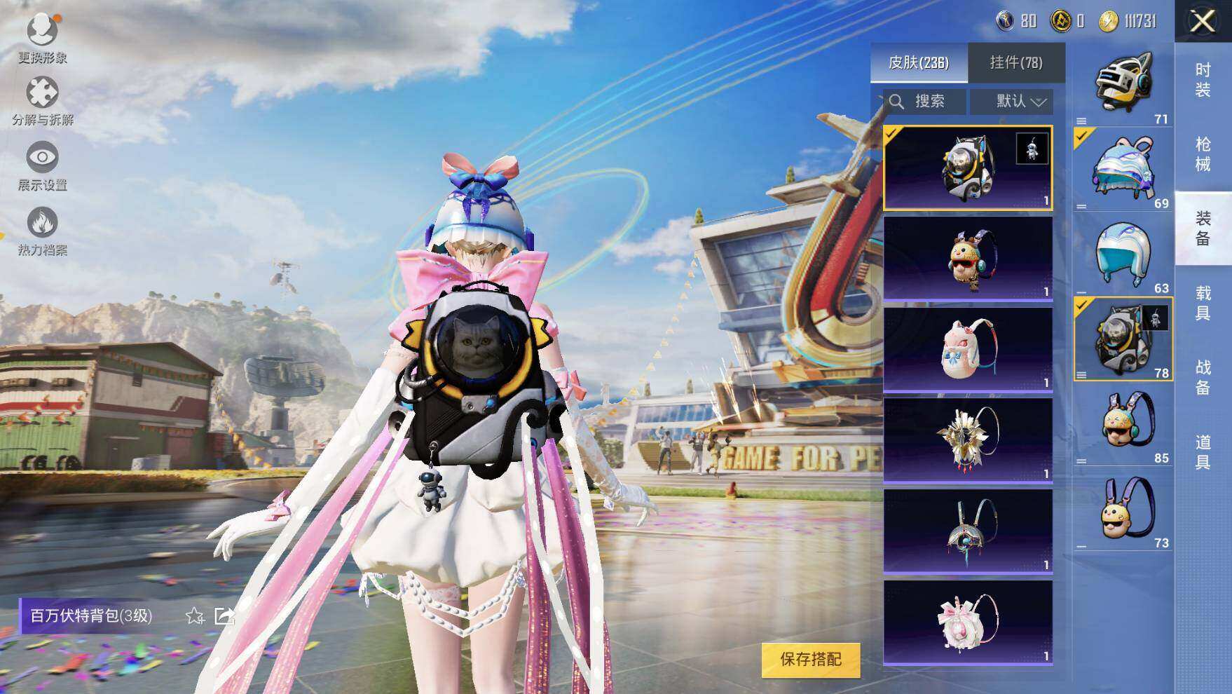【粉色枪皮】:AKM-炫紫旋律,AKM-绿萝繁花,SCAR-L-梦幻火箭,M416-电玩时刻,GROZA-镜光银凌,AUG-星之彼岸,AUG-暖羊咩咩,M762-青锋波束,UMP45-量子极限,Kar98K-创世·救赎,Kar98K-巳巳如意,M24-莲影清波,Mk14-樱桃泡泡,MG3-洛神天依