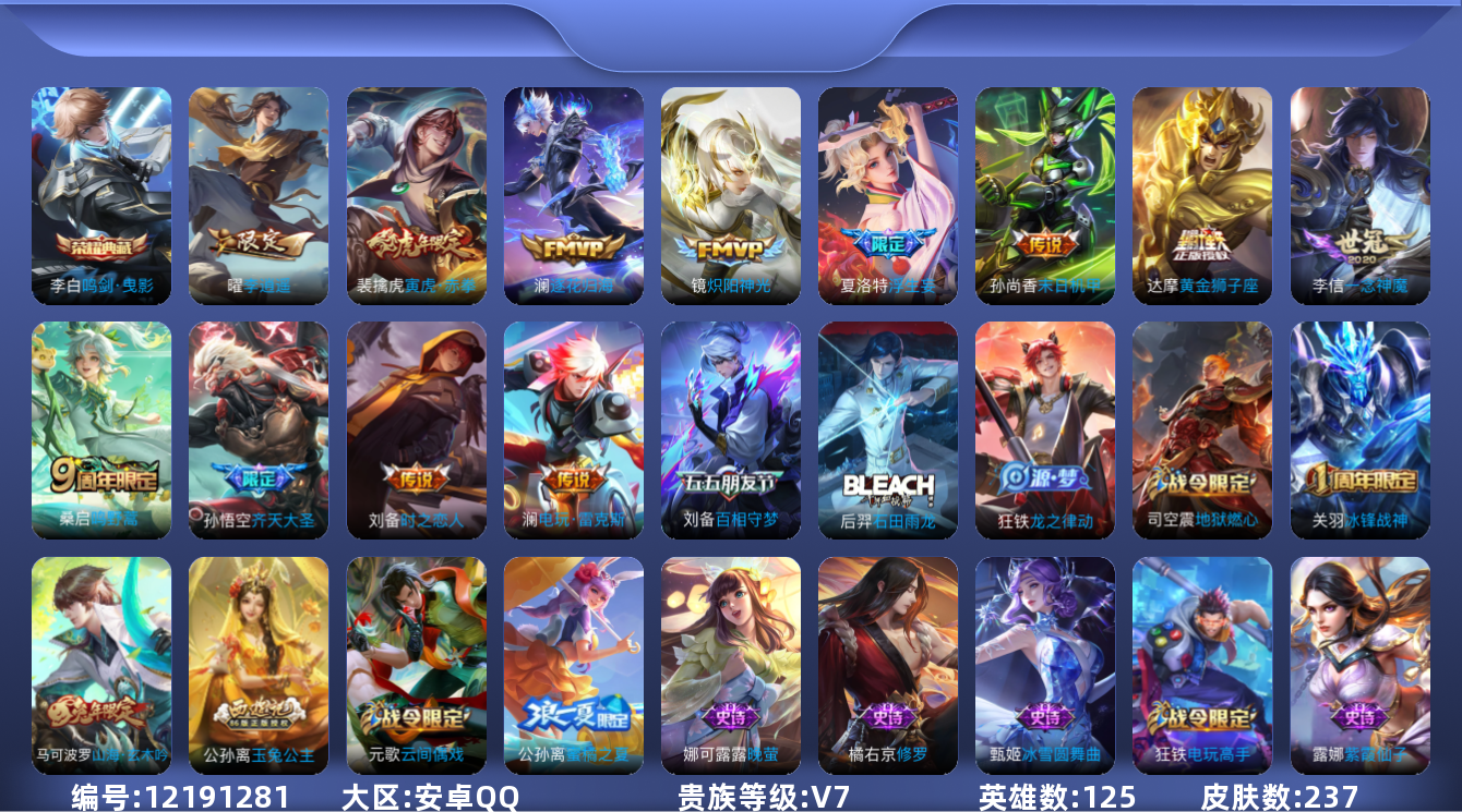 [12191281]V7 1典藏 12传说 125英雄 237皮肤 可修改实名 优质装备:鸣剑·曳影,黄金狮子座,炽阳神光,一念神魔,末日机甲-孙尚香(绿蚂蚱),李逍遥,时之恋人-刘备(电焊工),浮生妄,电玩·雷克斯,澜逐花归海 珍宝阁皮:胡桃夹子,蔷薇恋人,女武神 限定皮:鸣野蒿,齐天大圣,五谷丰年,冰锋战神,梁祝,李小龙,蜜橘之夏,寅虎·赤拳(老虎年限),玉兔公主,山海·玄木吟(马可年限) 史诗皮:龙之律动,石田雨龙,蔬乡物语(鲁班七号),紫霞仙子,苍穹之光,电玩小子(小书包),白龙吟,特工魅影,千年之狐,百相守梦(刘备),电玩·爆裂旋风,江河有灵,百解令(蒙犽),高渐离燃音魔法,蒙恬荣光圣徽,偶像歌手,晚萤,末日机甲-吕布,猫狗日记-孙策,猫狗日记-大乔,时之恋人-孙尚香,乱世虎臣,节奏热浪,修罗,女仆咖啡,水果甜心,天才门将,星夜王子,德古拉伯爵,暗隐猎兽者,幽灵船长,鬼剑武藏,心灵战警,舞动绿茵,纤云弄巧,拒霜思,乘风破浪,逐浪之夏,水晶猎龙者,热力回旋,金属风暴,原初追逐者,圣诞狂欢,圣诞恋歌,鹰眼统帅,暗夜贵公子,魅力维加斯,赏金猎手,无心,未来纪元-赵云