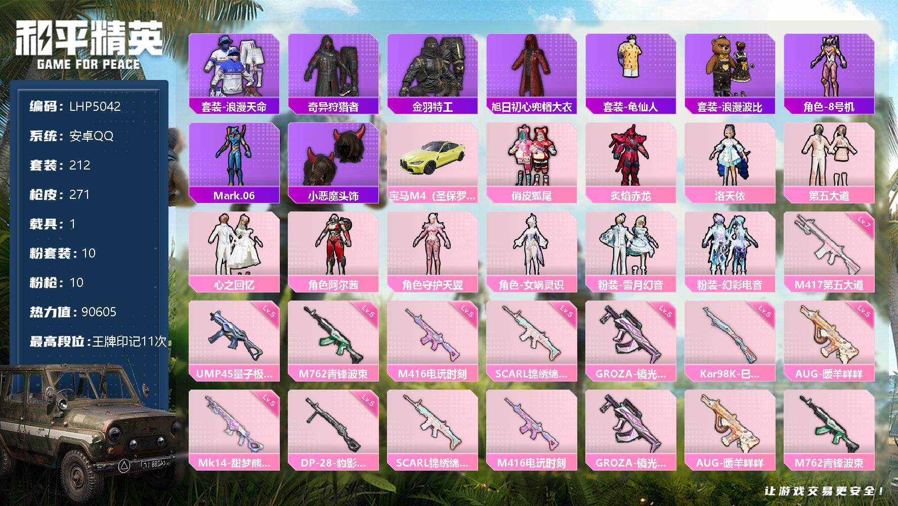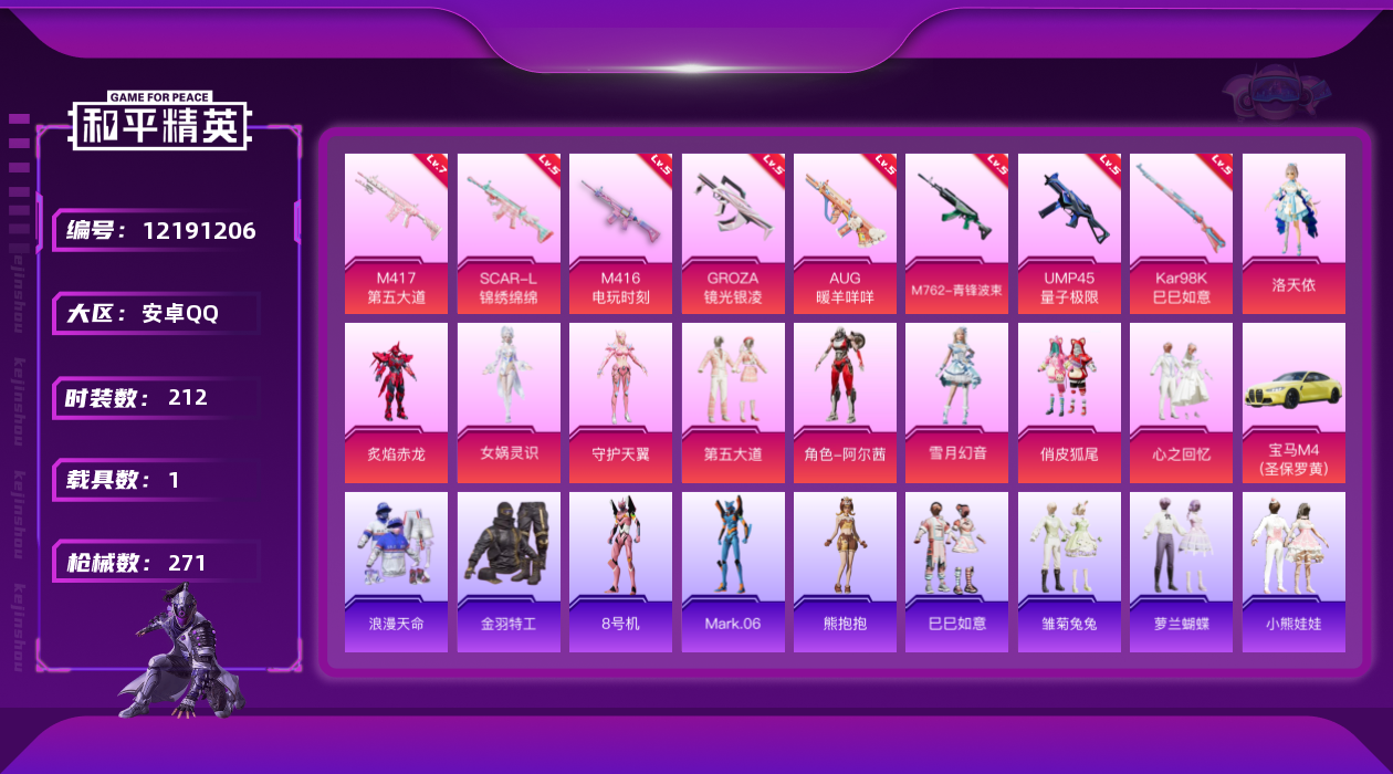 [12191206]素材身法号/地铁满天赋【特价急出/详情看图】:安卓 手Q-10粉装-10特效枪-1载具-7粉色飞行器-9w热力值-11王牌印记-212套装-271枪皮【热门品类】:套装-浪漫天命,套装-奇异狩猎者,套装-金羽特工,旭日初心兜帽大衣,套装-龟仙人,套装-浪漫波比,角色-8号机,角色-Mark.06,小恶魔头饰【粉色载具】:宝马M4(圣保罗黄)【粉色套装】:粉装-俏皮狐尾,粉装-炙焰赤龙,角色-洛天依,粉装-第五大道,粉装-心之回忆,角色-阿尔茜,角色-守护天翼,角色-女娲灵识,粉装-雪月幻音,粉装-幻彩电音【粉色枪皮等级】:SCAR-L-锦绣绵绵(五级),M416-电玩时刻(五级),GROZA-镜光银凌(五级),AUG-暖羊咩咩(五级),M762-青锋波束(五级),UMP45-量子极限(五级),Kar98K-巳巳如意(五级),Mk14-甜梦熊击(五级),M417-第五大道(七级),DP-28-豹影疾电(五级)【粉色飞行器】:酣梦熊熊飞行器,繁龙极客飞行器,脆鲨七海飞行器,万象金身飞行器,戏水时光飞行器,圣域金龙飞行器
