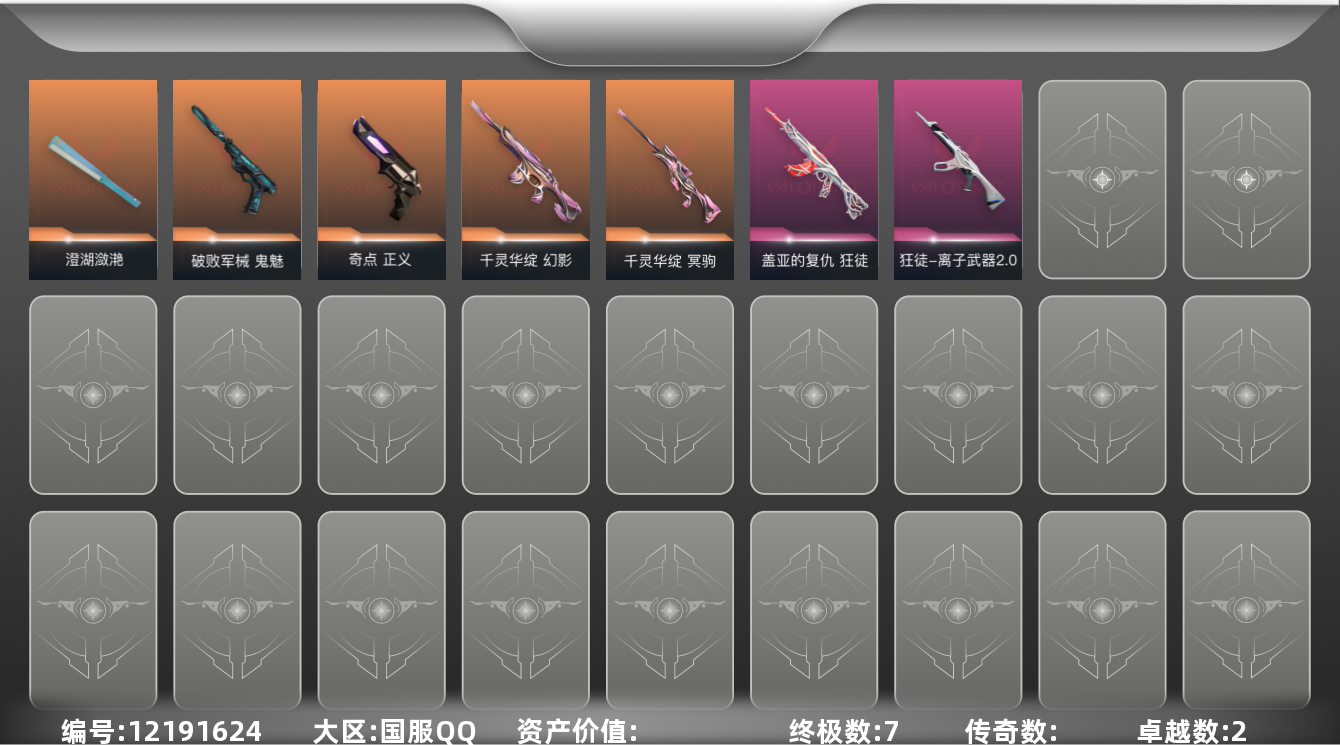 [12191624]【英雄】:炼狱,维斯,暮蝶,捷风,不死鸟,贤者,猎枭,芮娜,尚勃勒,霓虹,黑梦 【近战 武器】:近战武器-澄湖潋滟 【狂徒】:狂徒-2025全球冠军赛,狂徒-盖亚的复仇,狂徒-离子武器//2.0 【幻影】:幻影-千灵华绽 【冥驹】:冥驹-千灵华绽 【骇灵】:骇灵-无限竞技 【正义】:正义-奇点 【鬼魅】:鬼魅-破败军械 【卡面】:Clutch 卡面,暗枪 卡面,代号红色 卡面,新兵报到 卡面,V契约 卡面,无畏契约 卡面 【喷漆】:关门放狗 喷漆,暴走萝莉 喷漆,胜利属于无畏契约 喷漆,GLHF 喷漆,无畏契约 喷漆 【挂饰】:无畏契约 纪念币 挂饰