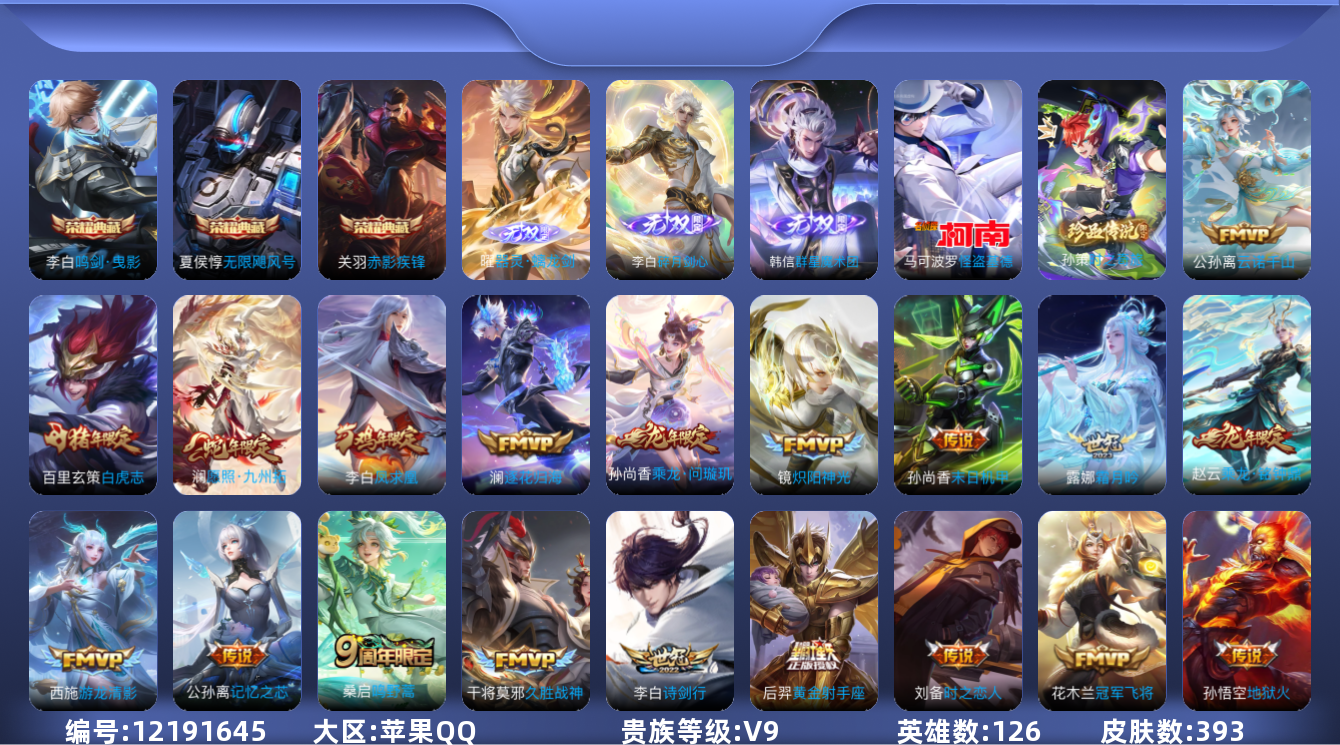 [12191645]V9 3典藏 3无双 2珍品传说 21传说 126英雄 393皮肤 可修改实名 优质装备:无限飓风号(高达),鸣剑·曳影,赤影疾锋,碎月剑心(李白无双),韩信群星魔术团(韩信无双),器灵·螭龙剑,怪盗基德,黄金射手座,冠军飞将,久胜战神,炽阳神光,末日机甲-孙尚香(绿蚂蚱),地狱火,时之恋人-刘备(电焊工),游龙清影(小青龙),音你闪耀(rap皮),记忆之芯(机甲兔),霜月吟,澜逐花归海,涂山容容 珍品传说:时之奇旅-孙策 传说皮:乘龙·问璇玑(孙尚香年限),乘龙·铭钟鼎(赵云年限),云诺千山 珍宝阁皮:胡桃夹子,蔷薇恋人,女武神 限定皮:愿照·九州拓(澜年限),逐霄战戟,鸣野蒿,至尊宝,白虎志(电光耗子),凤求凰(白切鸡),飞衡(韩信年限),瑞麟志(木兰年限),遇见飞天,高山流水,诗剑行,五谷丰年,幽恒(沐浴露),游园惊梦,梁祝,龙胆,逐梦之星,逐梦之音,李小龙,逐梦之影,默契交锋-花木兰,猪悟能,青春决赛季,蜜橘之夏,山海·玄木吟(马可年限) 史诗皮:器灵·浮梦炉,灵蛊蚀心,琥珀纪元伽罗,星界战将,石田雨龙,百相守梦-黄忠,谪仙醉月,星界特工,撼地雄心,破空之剑,战舞者,东方月初,蒙犽顽岩魄,百相守梦-百里守约,遇见神鹿,紫霞仙子,苍穹之光,白龙吟,黄金分割率,特工魅影,千年之狐,永昼,冰冠公主,白蛇,江河有灵,青蛇,蒙恬荣光圣徽,魅语,电玩·爆裂旋风,无限星赏官,晚萤,末日机甲-吕布,猫狗日记-孙策,猫狗日记-大乔,时之恋人-孙尚香,乱世虎臣,节奏热浪,修罗,女仆咖啡,摇滚巨星,水果甜心,绅士熊喵,天才门将,星夜王子,心灵骇客,功夫厨神,德古拉伯爵,暗隐猎兽者,幽灵船长,鬼剑武藏,心灵战警,天秀·启明,舞动绿茵,地狱岩魂,诗语江南,纤云弄巧,拒霜思,缤纷独角兽,乘风破浪,逐浪之夏,月团寄思,水晶猎龙者,曙光守护者,箭羽风息,金属风暴,原初追逐者,圣诞狂欢,圣诞恋歌,鹰眼统帅,王者之锤,暗夜贵公子,魅力维加斯,黎明之约,未来纪元-赵云