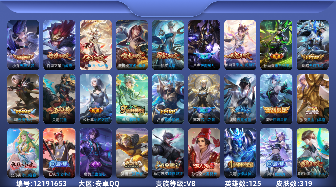 [12191653]V8 1典藏 17传说 125英雄 319皮肤 可修改实名 优质装备:天鹅之梦(小乔典藏),云鹰飞将(小将军),黄金白羊座,云霓雀翎,末日机甲-孙尚香(绿蚂蚱),无双飞将,记忆之芯(机甲兔),涂山容容 传说皮:乘龙·问璇玑(孙尚香年限) 珍宝阁皮:妄想食味,蔷薇恋人,女武神 限定皮:愿照·九州拓(澜年限),鸣野蒿,白虎志(电光耗子),太华(伽罗年限),遇见飞天,高山流水,怒海麟威,五谷丰年,冰锋战神,武圣,梁祝,御风骁将(吕布年限),逐梦之星,虎魄,奔雷神使(牛魔年限),李小龙,逐梦之光,玄武志(苏烈年限),默契交锋-花木兰,孙行者,一生所爱,大圣娶亲,引擎之心,天魔缭乱,青春决赛季,蜜橘之夏,美猴王,匿光追影者,寅虎·御盾(廉颇年限),寅虎·赤拳(老虎年限),启示之音,山海·玄木吟(马可年限) 史诗皮:器灵·浮梦炉,化蝶舞,灵蛊蚀心,星界战将,龙之律动,紫霞仙子,电玩小子(小书包),黄金分割率,特工魅影,千年之狐,永昼,江河有灵,魅语,蒙恬荣光圣徽,无限星赏官,冰冠公主,晚萤,电玩·爆裂旋风,龙骑士(小龙虾),末日机甲-吕布,猫狗日记-孙策,猫狗日记-大乔,乱世虎臣,节奏热浪,女仆咖啡,摇滚巨星,水果甜心,绅士熊喵,天才门将,星夜王子,心灵骇客,功夫厨神,德古拉伯爵,暗隐猎兽者,幽灵船长,鬼剑武藏,暗渊魔法,心灵战警,天秀·启明,舞动绿茵,地狱岩魂,纤云弄巧,繁星吟游(呼啦呼啦),拒霜思,缤纷独角兽,乘风破浪,逐浪之夏,龙鼓争鸣,水晶猎龙者,曙光守护者,箭羽风息,金属风暴,原初追逐者,圣诞狂欢,圣诞恋歌,鹰眼统帅,王者之锤,暗夜贵公子,魅力维加斯,黎明之约,赏金猎手,寅虎·御盾,无心,未来纪元-赵云