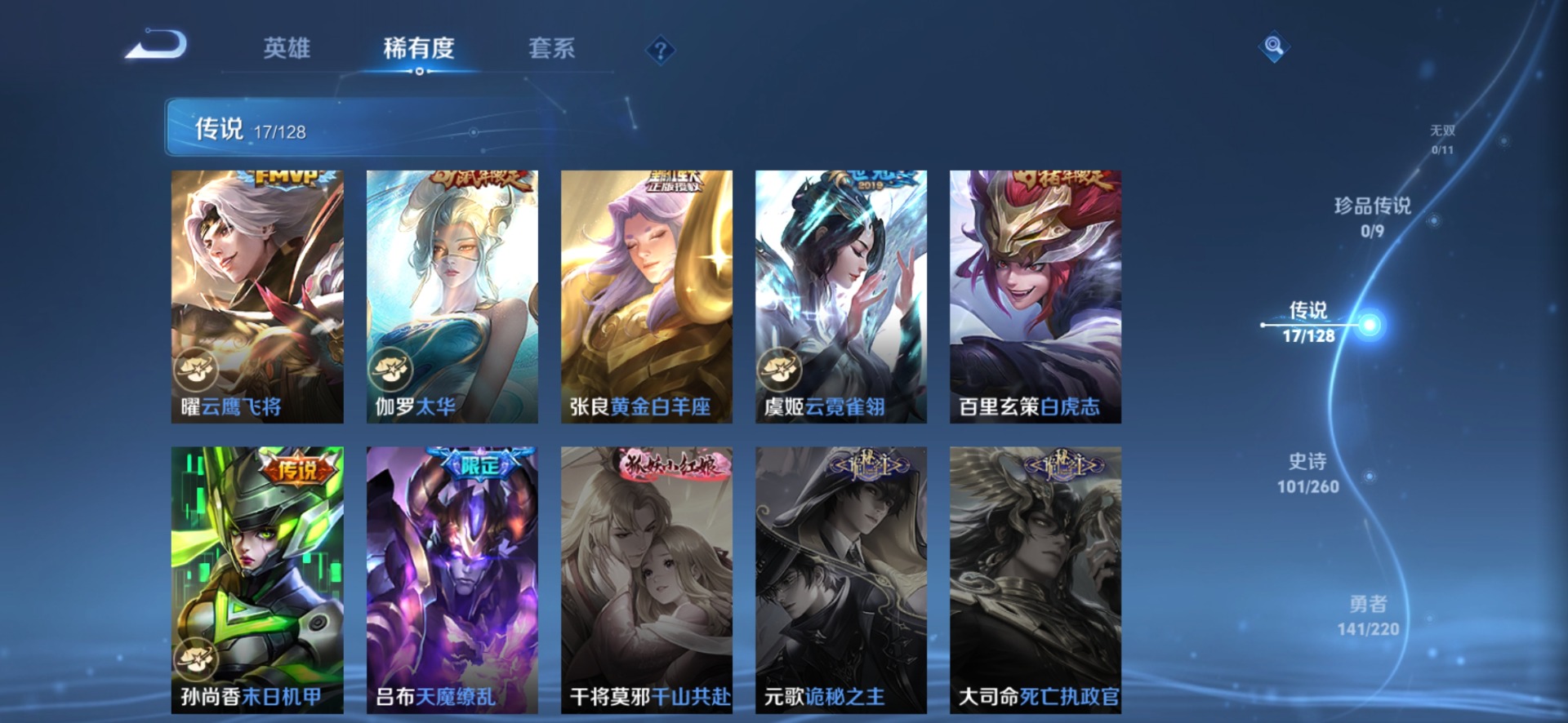 廉颇寅虎·御盾,伽罗太华,苏烈玄武志,张飞虎魄,牛魔奔雷神使,吕布御风骁将,露娜启示之音,露娜一生所爱,镜匿光追影者,公孙离蜜橘之夏,裴擒虎李小龙,裴擒虎寅虎·赤拳,东皇太一逐梦之光,上官婉儿梁祝,花木兰默契交锋,花木兰青春决赛季,马可波罗逐梦之星,马可波罗山海·玄木吟,桑启鸣野蒿,孙悟空孙行者,孙悟空大圣娶亲,孙悟空美猴王,百里玄策白虎志,赵云引擎之心,澜愿照·九州拓,关羽武圣,关羽冰锋战神