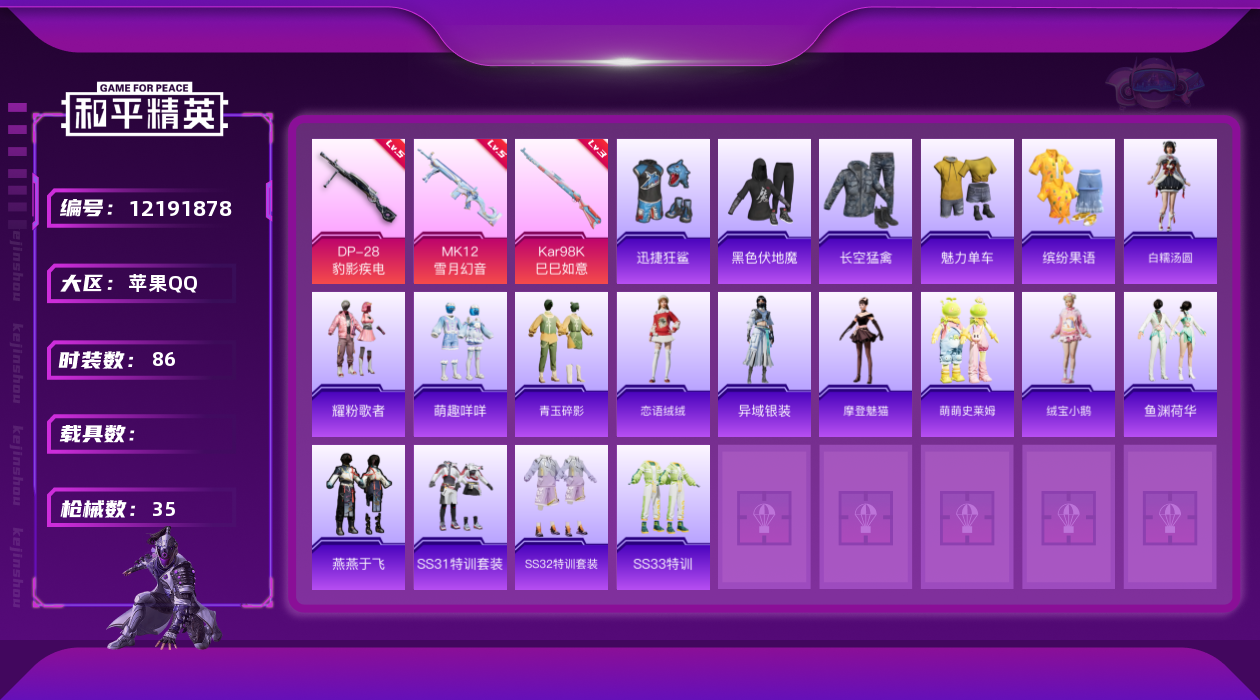 [12191878]3特效枪 2印记 可二次 可修改实名 优质装备:MK12-雪月幻音,Kar98K-巳巳如意 热门装扮:迅捷狂鲨 稀有枪皮:DP-28-豹影疾电 五级特效枪:五级DP-28-豹影疾电,五级MK12-雪月幻音 三级特效枪:三级Kar98K-巳巳如意 紫色装扮:SS31特训套装,SS33特训套装,萌趣咩咩,魅力单车,黑色伏地魔,长空猛禽,缤纷果语,鱼渊荷华,燕燕于飞,绒宝小鹅,摩登魅猫,异域银装,耀粉歌者,白糯汤圆,青玉碎影,萌萌史莱姆,SS32特训服(SS32特训套装),恋语绒绒 优质战备:冷漠罗丽降落伞