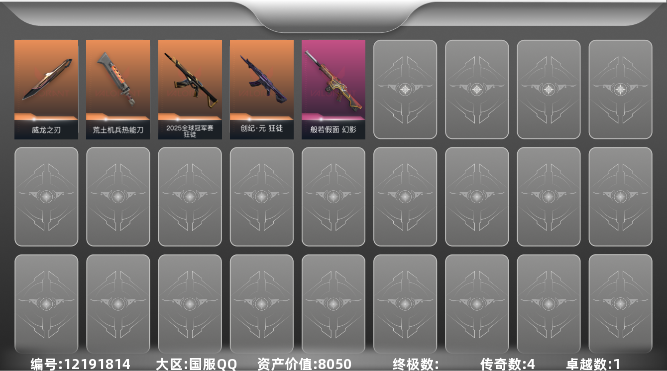 [12191814]4橙皮 1紫皮 20皮肤 27英雄 48卡面 370已用源晶 白银 优质装备:幻影-般若假面,威龙之刃,荒土机兵热能刀,2025全球冠军赛 狂徒 步枪皮肤:狂徒-创·纪元
