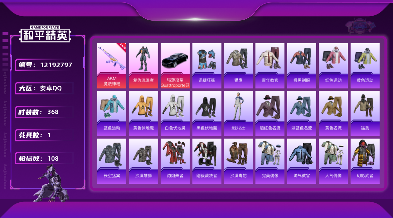 [12192797]1粉装 1特效枪 1载具 4印记 可二次 可修改实名 优质装备:玛莎拉蒂Quattroporte(夜幕蓝),AKM魔法神域 热门装扮:复仇流浪者,迅捷狂鲨 三级特效枪:三级AKM-魔法神域 紫色装扮:SS22特训,SS23特训,萌趣咩咩,SS21特训,人气偶像,冰川特警,刚毅裁决者,SS20特训,SS15特训,SS16特训,快乐星愿,SS13特训,SS14特训,萌趣颜团子,飞驰魅影,音速流光,SS19特训,吉莉礼服,雪兔飞飞,瑞龙福将,团圆交子,SS17特训,SS18特训,酒红色名流,长空猛禽,青年教官,耀眼新星,荣耀,蓝色运动,虎虎生威吉莉,街头潮人,魅力单车,鹤鸣,麻辣教官,黄色伏地魔,黄色名流,黄色运动,黑色伏地魔,龙的传人,龟仙人,冰河战士,龙魂突击队,沙漠毒蛇,极速红龙,柠萌假日,格斗先锋,橘黑制服,沙漠雄狮,涂山之恋,深蓝色名流,幻影武者,夏日音浪,完美偶像,帅气教官,幻世战舞者,怒火燎原,探宝勇士,湖蓝色名流,绮丽涂鸦,白色伏地魔,破晓战魂,破蛋小黄鸡,碟中谍A款,福星高照,空投萌叽,竞技达人朋克,红色运动,牛气冲天,灼焰舞者,炫蓝之夏,热血青春,牛气满满,猛禽,猎鹰,粉日山川,SS28特训,竞技名士,神气柴柴,懵萌河马,SS24特训(SS24特训套装),绚紫流光,SS25特训,元气发射,粉红小猪,焰鹰斗篷,幻羽潜行,SS27特训,明鸳圣池,SS26特训,春光漫游,快闪甜心,贝斯之夜,SS12特训,耀粉歌者,青玉碎影,绯格组合,萌黄之夏 优质战备:星之彼岸降落伞,橘柚倾心降落伞,繁龙极客飞行器,彩虹甜喵降落伞,天星战神降落伞,焰龙焚天降落伞,暗夜玫瑰降落伞