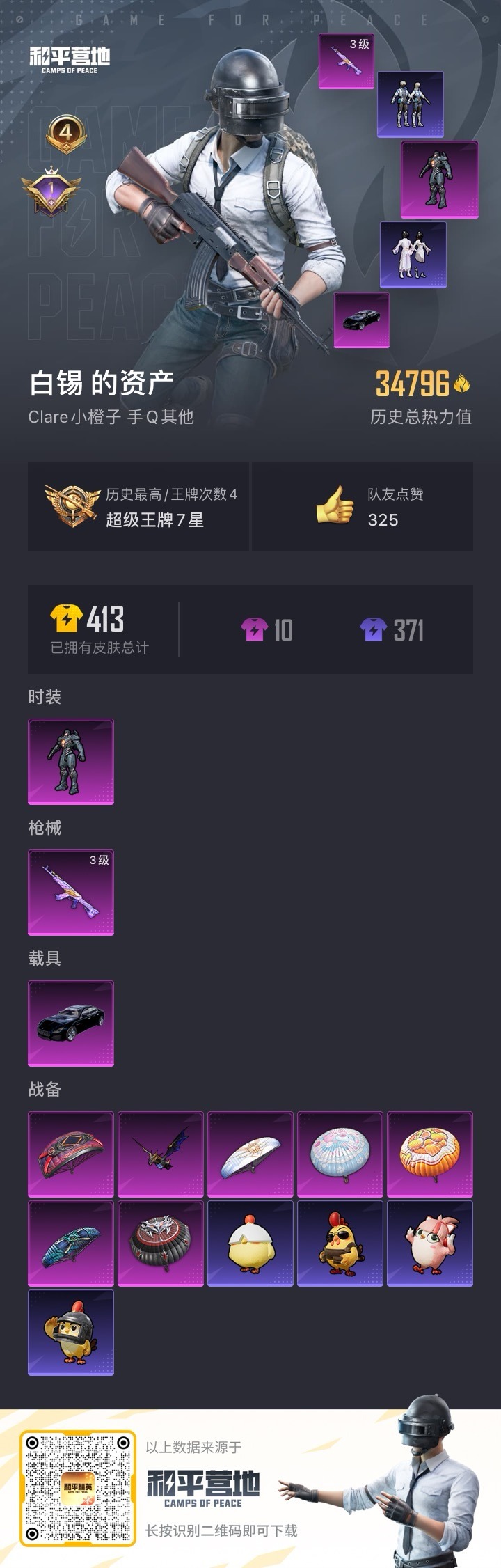 - PX_2105698- 安卓手Q-2王牌印记-4粉装-5特效枪-0载具-36205热力值-90套装-125枪皮-0卓越印记-0传奇印记 【4粉装】,桃粉嫣然,圣堂之誓,冰川幽秘,冰川红玫 【5特效枪】AKM-绿萝繁花-5级 SCAR-L-锦绣绵绵-5级 M416-风花雪月-4级 GROZA-镜光银凌-5级 Kar98K-巳巳如意-5级 【2稀有紫装】,暗影哥特,龟仙人, 【90稀有时装】,SS3