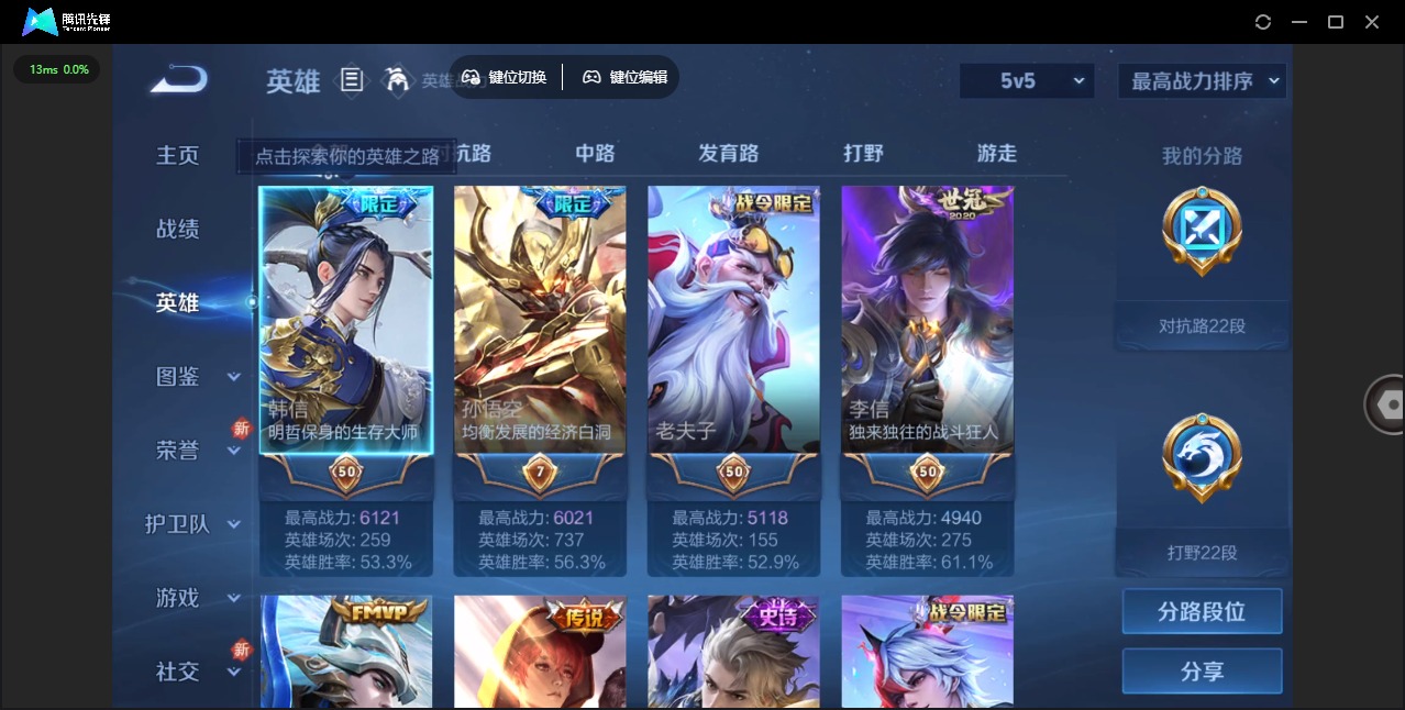 - [12116990]V9 2典藏 17传说 125英雄 352皮肤 典藏英雄武则天 可修改实名 优质装备:杀手不太冷,弑枪猎影(韩信典藏),黄金射手座,冠军飞将,猫影幻舞,云霓雀翎,末日机甲-孙尚香(绿蚂蚱),地狱火,仲夏夜之梦(大飞蛾),海洋之心,涂山容容 传说皮:幻光神枪 珍宝阁皮:妄想食味 限定皮:鸣野蒿,白虎志(电光耗子),凤求凰(白切鸡),凤凰于飞,梅西,武陵仙君(小桃花),神威(电光马子),飞衡(韩信年限),遇见飞天,高山流水,冰锋战神,游园惊梦,梁祝,龙胆,逐梦之翼,天狼征服者,李小龙,朱雀志(守约年限),永曜之星,圣诞老人,孙行者,猪悟能,一生所爱,引擎之心,天魔缭乱,青春决赛季,冰霜恋舞曲,蜜橘之夏,热情桑巴,启示之音 史诗皮:琥珀纪元伽罗,星界战将,茶境仙,百相守梦-黄忠,芈月浮光幕影,百相守梦-百里守约,紫霞仙子,电玩小子(小书包),白龙吟,黄金分割率,特工魅影,千年之狐,永昼,冰冠公主,真我赫兹(镜),江河有灵,青蛇,高渐离燃音魔法,蒙恬荣光圣徽,魅语,无限星赏官,偶像歌手,龙骑士(小龙虾),暗夜猫娘,末日机甲-吕布,猫狗日记-孙策,猫狗日记-大乔,乱世虎臣,节奏热浪,修罗,女仆咖啡,摇滚巨星,水果甜心,绅士熊喵,天才门将,星夜王子,心灵骇客,时之奇旅-安琪拉,功夫厨神,德古拉伯爵,暗隐猎兽者,幽灵船长,鬼剑武藏,心灵战警,天秀·启明,舞动绿茵,地狱岩魂,诗语江南,繁星吟游(呼啦呼啦),拒霜思,缤纷独角兽,乘风破浪,逐浪之夏,水晶猎龙者,曙光守护者,箭羽风息,金属风暴,原初追逐者,圣诞狂欢,圣诞恋歌,鹰眼统帅,王者之锤,暗夜贵公子,魅力维加斯,黎明之约,未来纪元-赵云