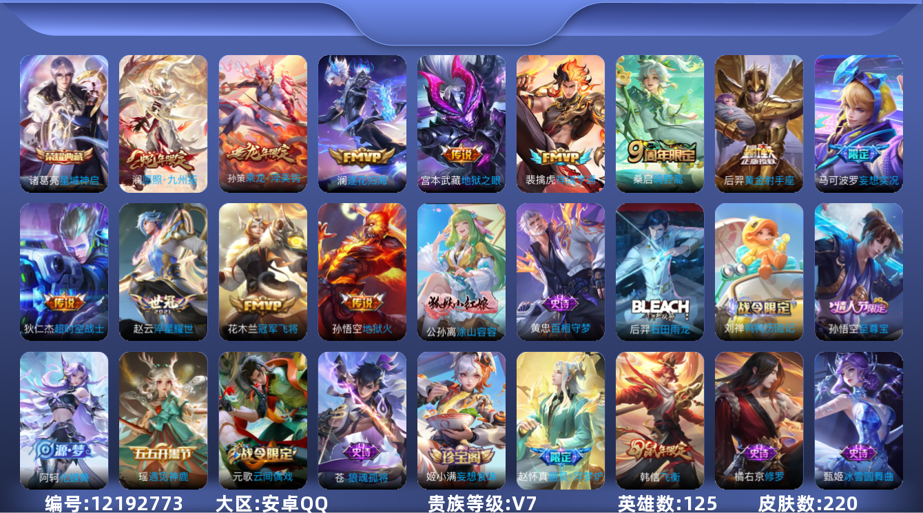 [12192773]V7 1典藏 12传说 125英雄 220皮肤 可修改实名 优质装备:星域神启(倪克斯贼亮),黄金射手座,冠军飞将,地狱火,地狱之眼,淬星耀世,超时空战士-狄仁杰,妄想实况,澜逐花归海,涂山容容 传说皮:乘龙·淬吴钩(孙策年限),祥瑞亨通 珍宝阁皮:妄想食味 限定皮:愿照·九州拓(澜年限),逐霄战戟,鸣野蒿,至尊宝,飞衡(韩信年限),李小龙 史诗皮:鸭鸭历险记-刘禅,器灵·浮梦炉,狼魂孤将,化蝶舞,星界战将,石田雨龙,茶境仙,破空之剑,蒙犽顽岩魄,蔬乡物语(鲁班七号),百相守梦-百里守约,星界特工,百相守梦-黄忠,遇见神鹿,千年之狐,江河有灵,冰冠公主,猫狗日记-孙策,时之恋人-孙尚香,修罗,水果甜心,天才门将,暗隐猎兽者,幽灵船长,鬼剑武藏,暗渊魔法,天秀·启明,繁星吟游(呼啦呼啦),逐浪之夏,水晶猎龙者,曙光守护者,箭羽风息,原初追逐者,圣诞狂欢,圣诞恋歌,鹰眼统帅,暗夜贵公子,魅力维加斯,天秀·音浪,无心,未来纪元-赵云
