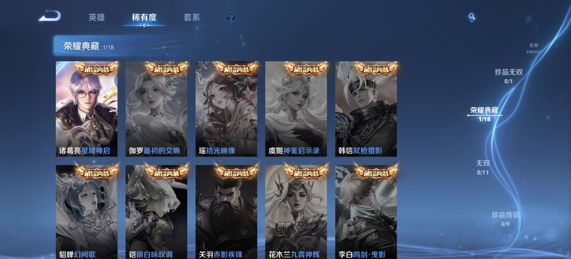 高渐离天秀·音浪,铠曙光守护者,曹操幽灵船长,伽罗箭羽风息,孙尚香时之恋人,孙策猫狗日记,赵怀真器灵·浮梦炉,吕布圣诞狂欢,司马懿暗渊魔法,刘禅天才门将,宫本武藏鬼剑武藏,兰陵王暗隐猎兽者,貂蝉圣诞恋歌,苍狼魂孤将,花木兰水晶猎龙者,李白千年之狐,杨戬天秀·启明,嬴政暗夜贵公子,百里玄策原初追逐者,雅典娜冰冠公主,李元芳逐浪之夏,瑶遇见神鹿,橘右京修罗
