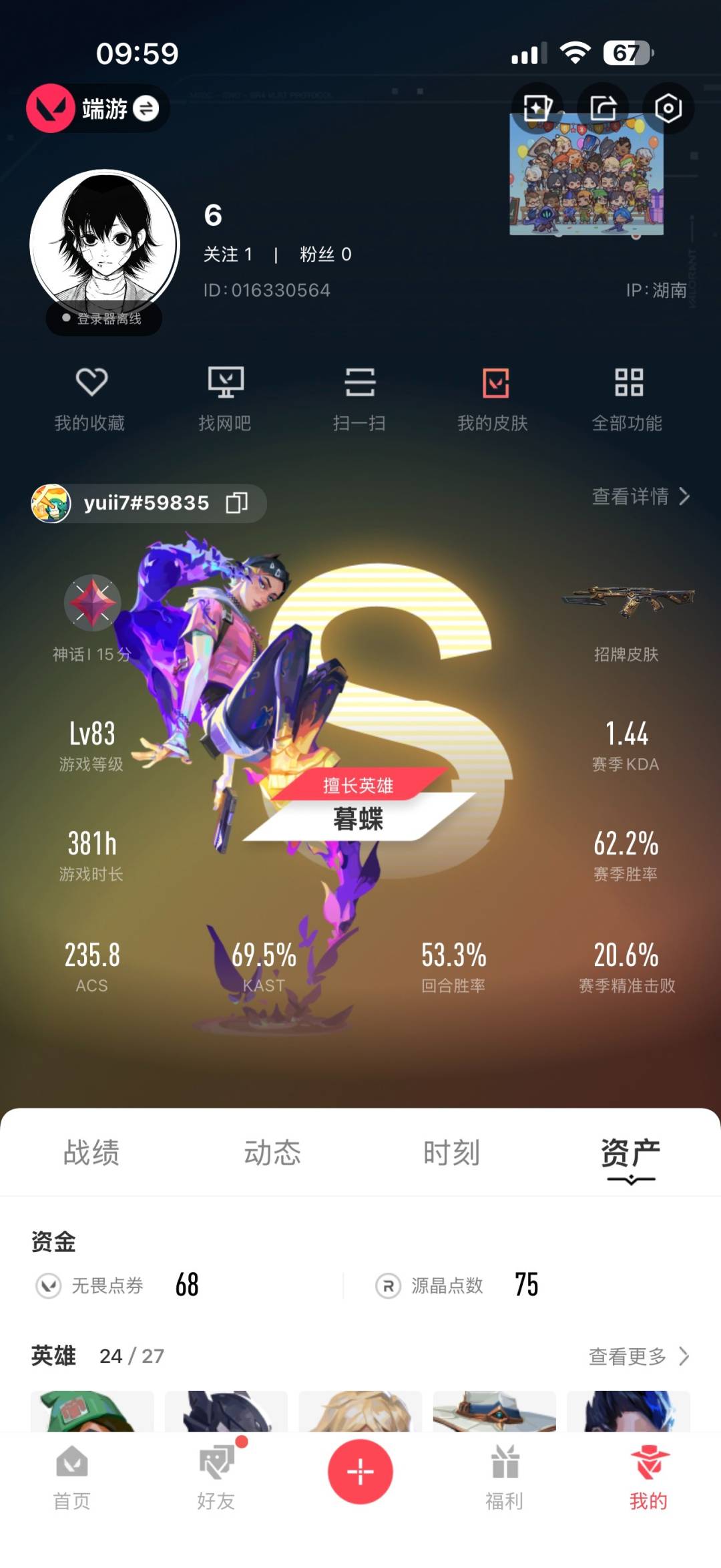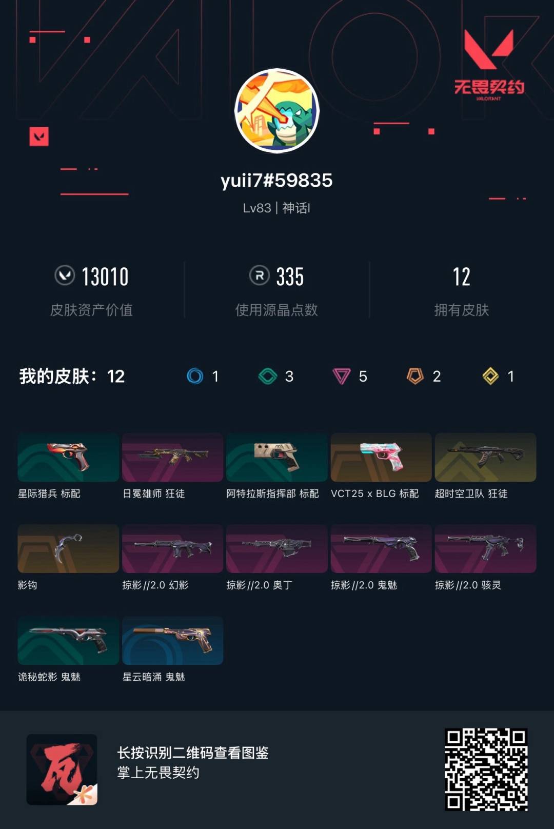 [12193001]2橙皮 1金皮 5紫皮 12皮肤 24英雄 43卡面 335已用源晶 神话 优质装备:狂徒-日冕雄师,影钩 套装:掠影2.0套装 佩枪皮肤:标配-VCT25xBLG,鬼魅-掠影2.0 冲锋枪皮肤:骇灵-掠影2.0 步枪皮肤:幻影-掠影2.0,狂徒-超时空卫队 机枪皮肤:奥丁-掠影2.0