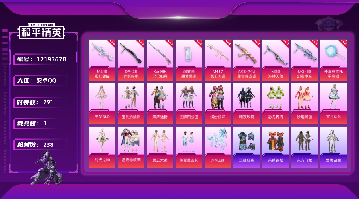 [12193678]13粉装 10特效枪 1载具 13印记 可二次 可修改实名 优质装备:MG3洛神天依,蝶舞迷情,宝贝奶油派,缤纷油彩(猪妹猪脸妹),王牌四分卫,M249彩虹甜喵(M249-彩虹甜喵),M417第五大道,雪月幻音,星穹咏叹调,AKS-74U-星穹咏叹调,烟雾弹-甜梦果泡,MG-36-幻彩电音,时光之吻,羊梦糖心,Kar98K-巳巳如意 热门装扮:恐龙拽拽,妙趣可丽,仲夏莫吉托,第五大道,暗夜玫瑰,软萌银虎,迅捷狂鲨,呆萌铁蟹,爱崽白熊,东方飞龙,暗夜魅影 载具:冰绡玉鳞 稀有枪皮:DP-28-豹影疾电,平底锅仲夏莫吉托 六级特效枪:六级M249-彩虹甜喵 五级特效枪:五级Kar98K-巳巳如意,五级烟雾弹-甜梦果泡,五级DP-28-豹影疾电 四级特效枪:四级AKS-74U-星穹咏叹调,四级M417-第五大道,四级MG3-洛神天依 三级特效枪:三级MG-36-幻彩电音 二级特效枪:二级平底锅-仲夏莫吉托 紫色装扮:SS31特训套装,云朵鹅,彩虹兔,雪绒豹,SS33特训套装,青涩时光,旭日情侣,诡诞巡游,SS21特训,摩登艾咪,SS22特训,莱茵河畔,香榭午后,白兰地假日,顶瓜瓜,圣诞大吉,冷焰舞者,凛冬战士,刚毅裁决者,北国孤狼,千禧之恋,坚韧舞者,夏日音浪,完美偶像,帅气教官,幻世战舞者,冰川特警,兰香蝶语,萌趣咩咩,,SS5特训,人气偶像,伏击者,军械专家,冰原使者,暖心熊熊,娇憨猪猪,时空追击者,暴风机械师,星辰守护者,SS16特训,电音精灵,天籁歌者,瑞龙福将,团圆交子,SS17特训,炫光向阳,SS14特训,诡面顽熊,萌趣颜团子,特种颜团子,青春冒险家,潮流游乐家,SS15特训,暗夜傀儡,SS20特训,甜心亚梦,虚音幻奏,粉团憨憨,梦幻奶油,酸甜橘柚,俏皮奶喵,怒火燎原,软羊咩咩,异彩先驱,SS18特训,英勇保护者,SS19特训,战地菁英,黄色名流,风行保卫者,飞行日记,骑行爱好者,魅力单车,鹤鸣,麻辣教官,黑色伏地魔,龙腾端午,霓虹街区,酷潮明星,跃动心情,迎春赐吉,都市魅力,酒红色名流,酷萌兔限定,霓虹极客,金鼠迎春,长空猛禽,雪山征服者,雪山精英,绛羽幽主,街头潮人,海滨突袭者,滨海假日,滨海厨神,潮流炫酷,灰色格斗者,灼焰舞者,热血青春,牛气冲天,牛气满满,海岛探路者,战地督导,暗黑骑手,极地朋克,极速红龙,格斗先锋,沙漠探路者,翡翠奔狼,竞技达人朋克,