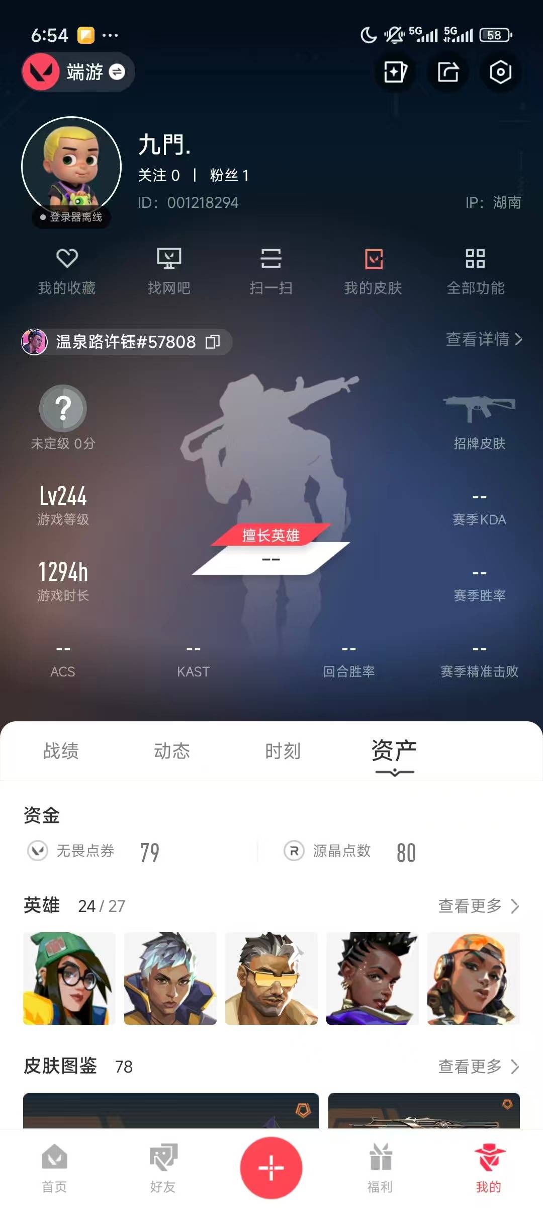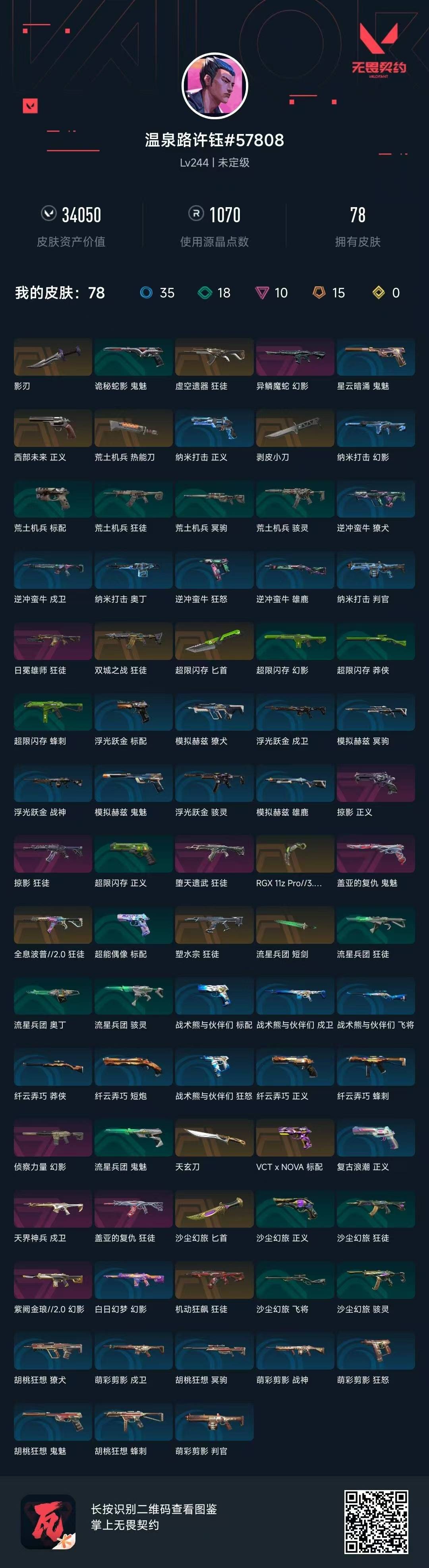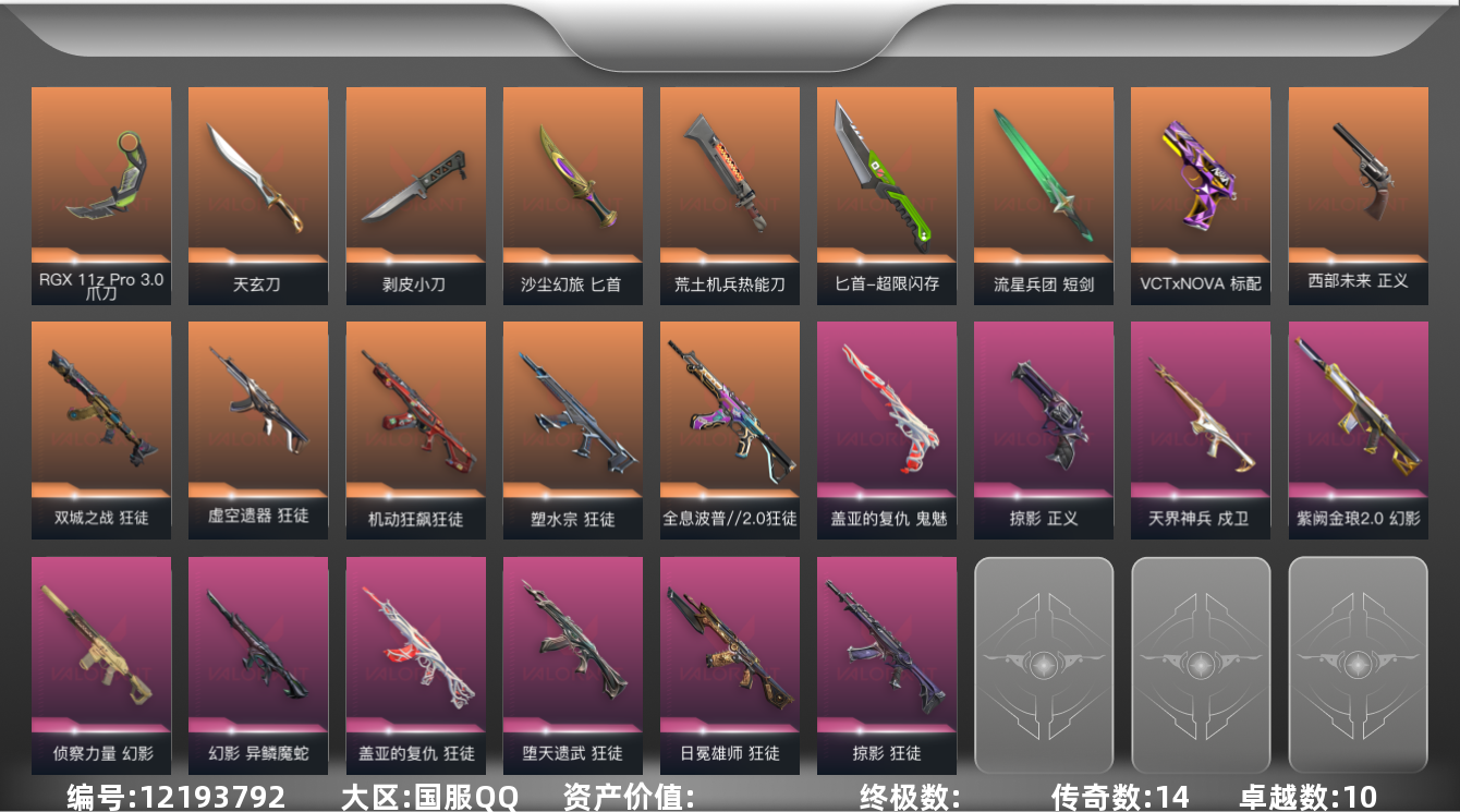 [12193792]14橙皮 10紫皮 77皮肤 24英雄 123卡面 1060已用源晶 铂金 佩枪皮肤:正义-掠影,鬼魅-盖亚的复仇,标配-VCTxNOVA 步枪皮肤:狂徒-双城之战,狂徒-掠影,狂徒-盖亚的复仇,狂徒-塑水宗,狂徒-机动狂飙,狂徒-全息波普//2.0,狂徒-堕天遗武,狂徒-日冕雄师,幻影-侦察力量,幻影-紫阙金琅2.0,戍卫-天界神兵 近战武器皮肤:荒土机兵热能刀,匕首-超限闪存,短剑-流星兵团,剥皮小刀,爪刀-RGX 11z Pro 3.0,天玄刀,匕首-沙尘幻旅