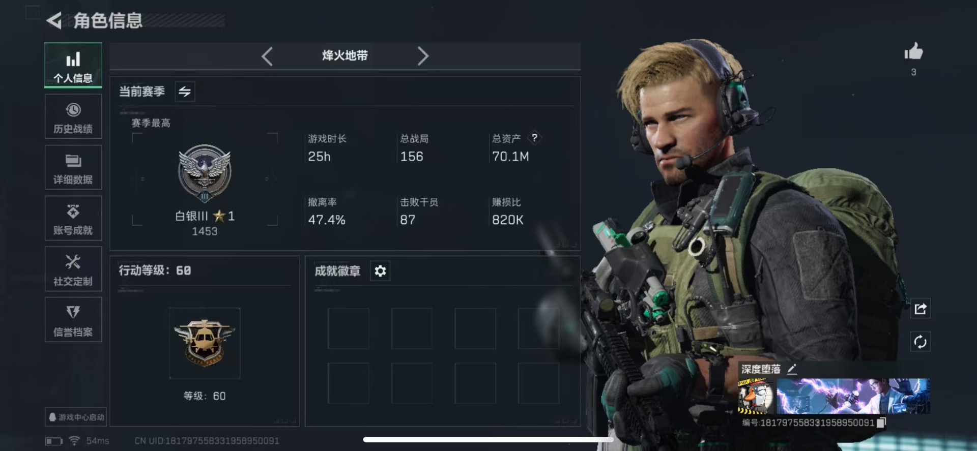 [12194028]总资产:70.1M 1传说枪械 哈夫币:20.218K 可二次 可修改实名 烽火地带段位:白银 全面战场段位:无段位 传说武器皮肤:M4A1突击步枪-阿米娅