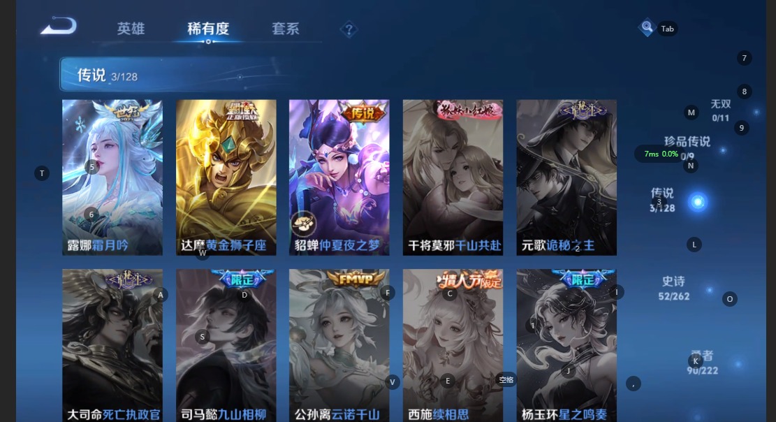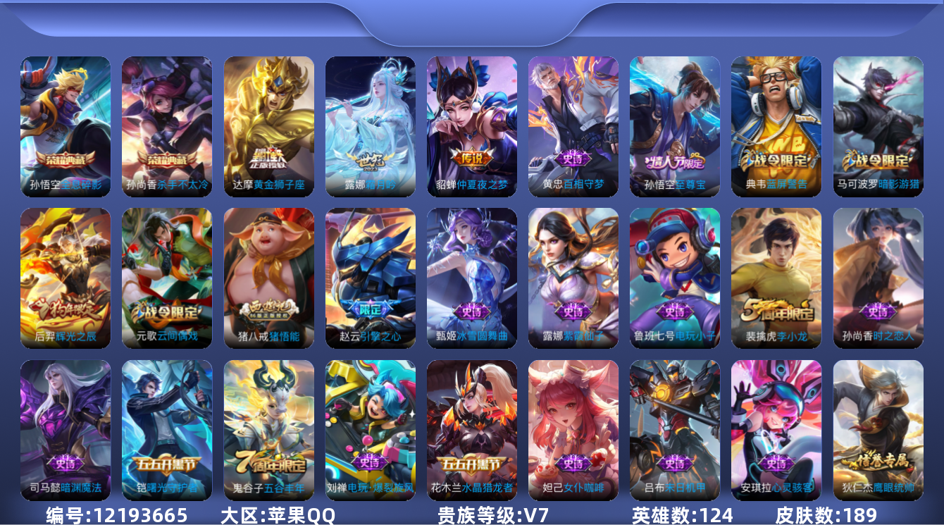 [12193665]V7 2典藏 3传说 124英雄 189皮肤 可修改实名 优质装备:杀手不太冷,全息碎影(猴子典藏),黄金狮子座,仲夏夜之梦(大飞蛾),霜月吟 珍宝阁皮:女武神,玩趣恶龙 限定皮:至尊宝,高山流水,五谷丰年,梁祝,李小龙,辉光之辰,猪悟能,引擎之心 史诗皮:茶境仙,百相守梦-黄忠,蒙犽顽岩魄,紫霞仙子,苍穹之光,电玩小子(小书包),白龙吟,特工魅影,冰冠公主,真我赫兹(百里守约),江河有灵,蒙恬荣光圣徽,电玩·爆裂旋风,末日机甲-吕布,时之恋人-孙尚香,乱世虎臣,节奏热浪,女仆咖啡,摇滚巨星,水果甜心,心灵骇客,暗隐猎兽者,鬼剑武藏,暗渊魔法,繁星吟游(呼啦呼啦),乘风破浪,逐浪之夏,水晶猎龙者,曙光守护者,箭羽风息,金属风暴,原初追逐者,圣诞狂欢,圣诞恋歌,鹰眼统帅,王者之锤,魅力维加斯