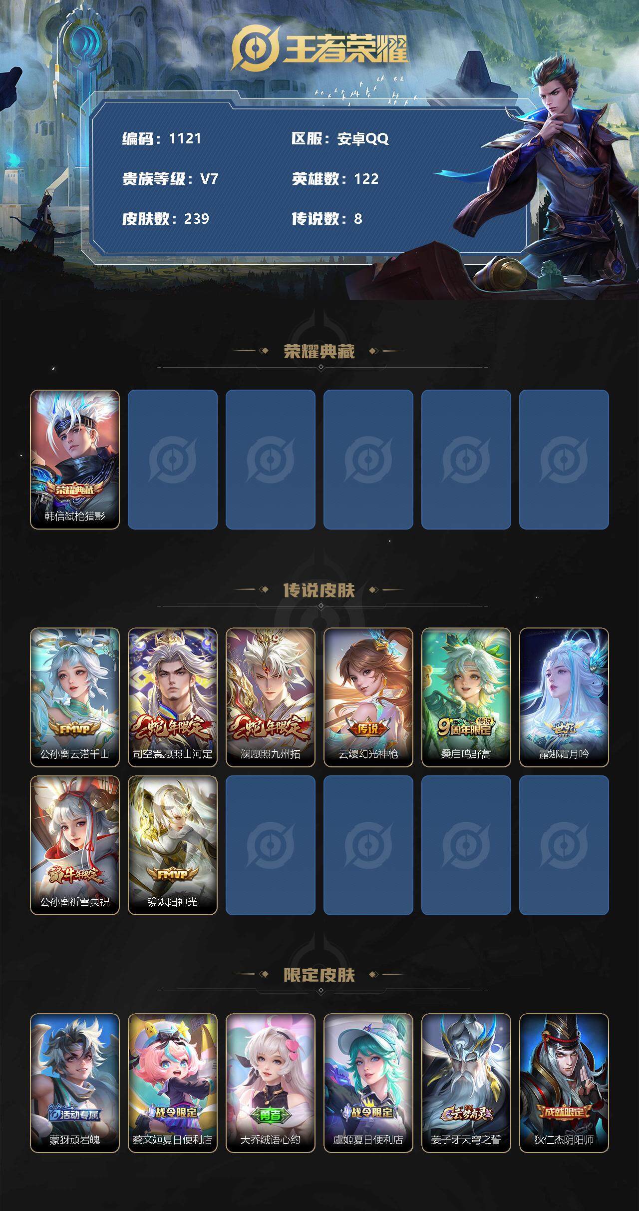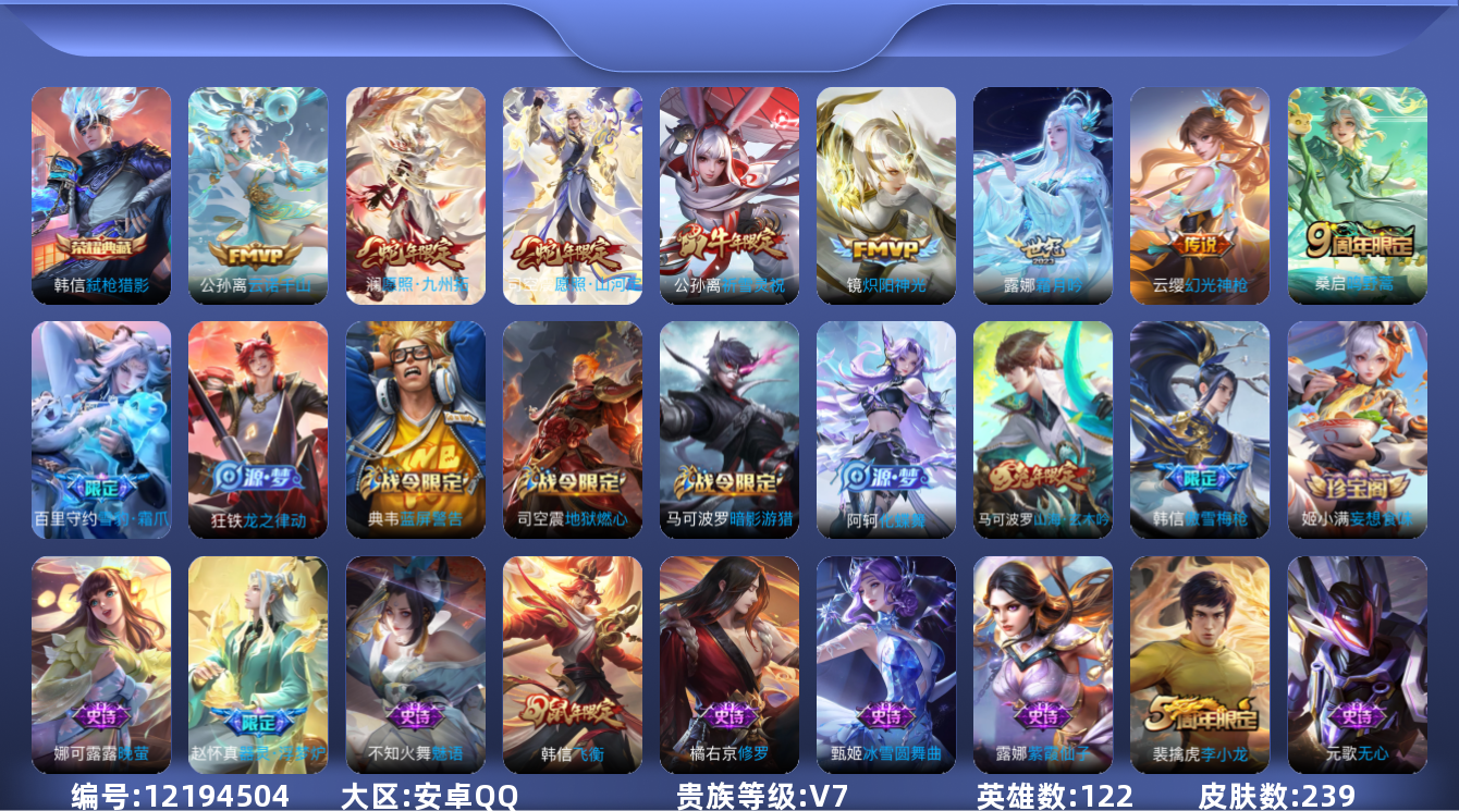 [12194504]【商品标题】:安卓Q-V4-尊贵铂金I段位-122英雄-239皮肤-1典藏-0珍品无双-0无双-0珍品传说-8传说-68史诗