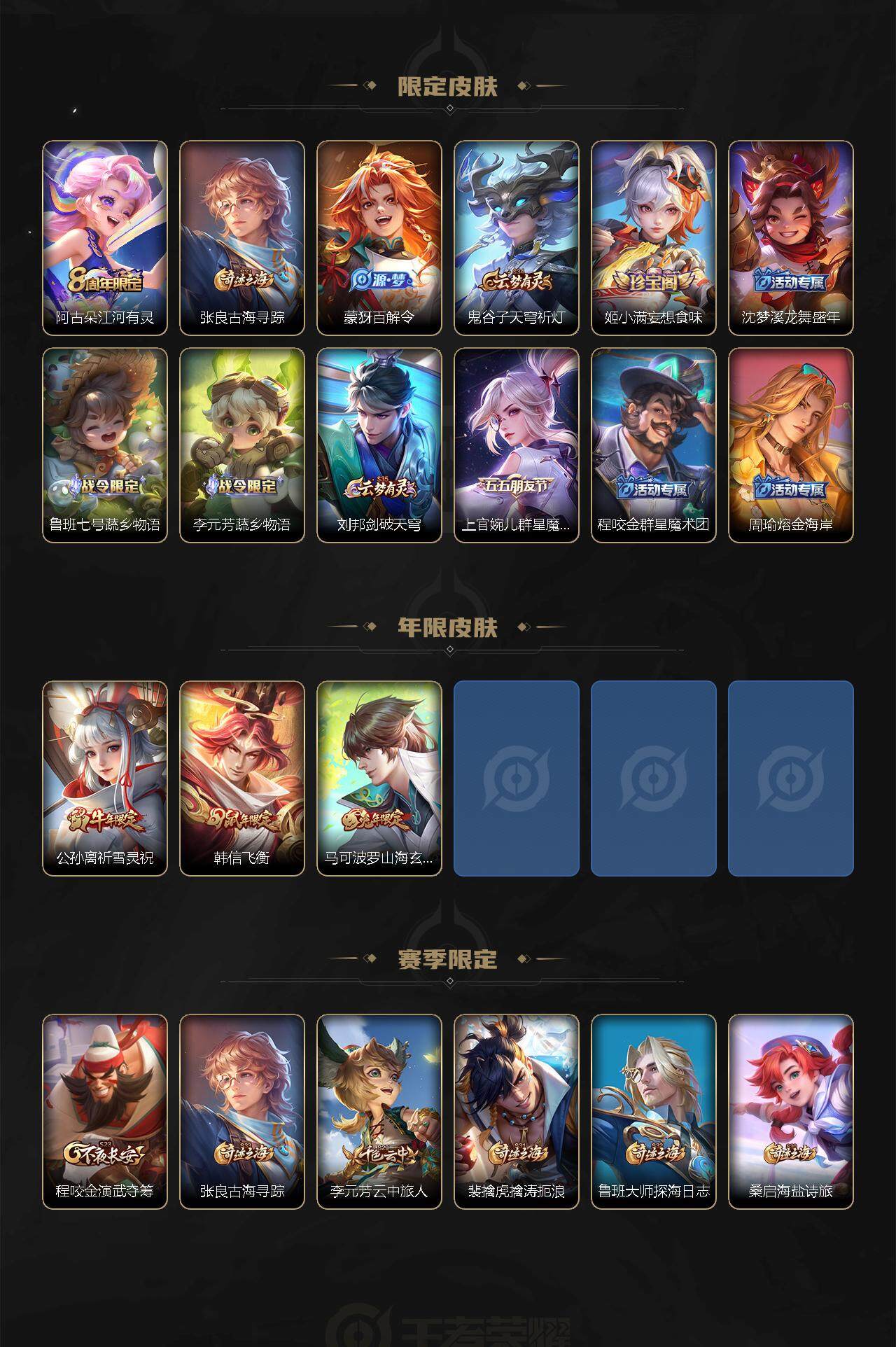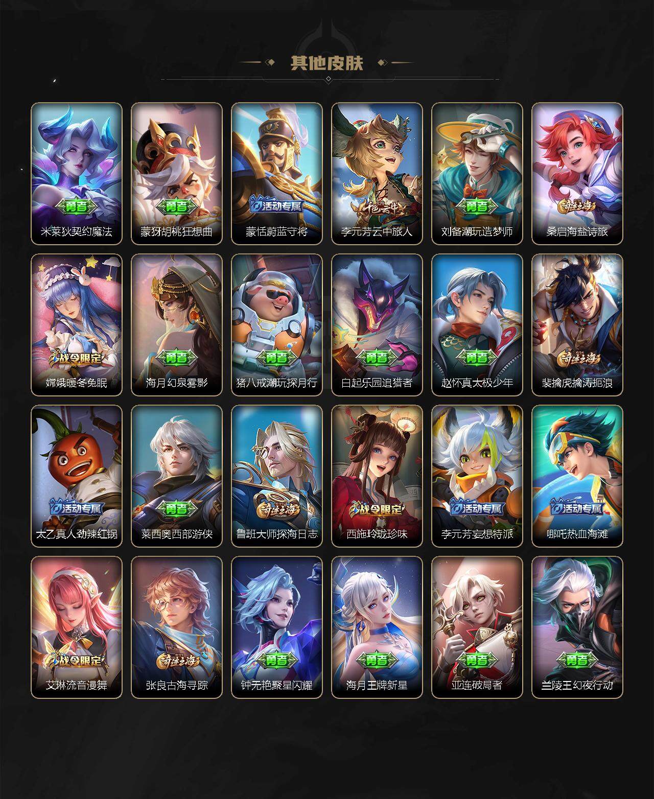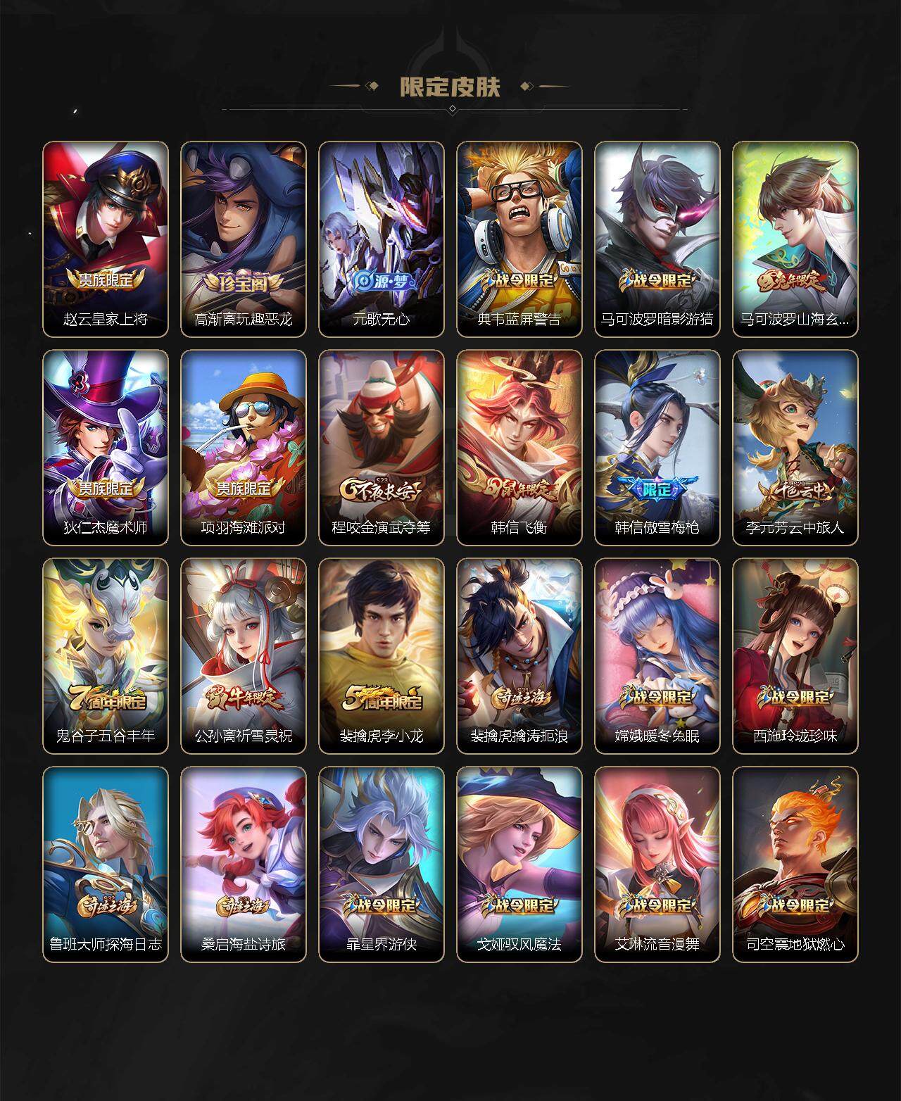 【限定皮肤】:蒙犽顽岩魄,蔡文姬夏日便利店,大乔绒语心约,虞姬夏日便利店,姜子牙天穹之誓,狄仁杰阴阳师,赵云皇家上将,高渐离玩趣恶龙,元歌无心,典韦蓝屏警告,马可波罗暗影游猎,马可波罗山海玄木吟,狄仁杰魔术师,项羽海滩派对,程咬金演武夺筹,韩信飞衡,韩信傲雪梅枪,李元芳云中旅人,鬼谷子五谷丰年,公孙离祈雪灵祝,裴擒虎李小龙,裴擒虎擒涛扼浪,嫦娥暖冬兔眠,西施玲珑珍味,鲁班大师探海日志,桑启海盐诗旅,暃星界游侠,戈娅驭风魔法,艾琳流音漫舞,司空震地狱燃心,阿古朵江河有灵,张良古海寻踪,蒙犽百解令,鬼谷子天穹祈灯,姬小满妄想食味,沈梦溪龙舞盛年,鲁班七号蔬乡物语,李元芳蔬乡物语,刘邦剑破天穹,上官婉儿群星魔术团,程咬金群星魔术团,周瑜熔金海岸