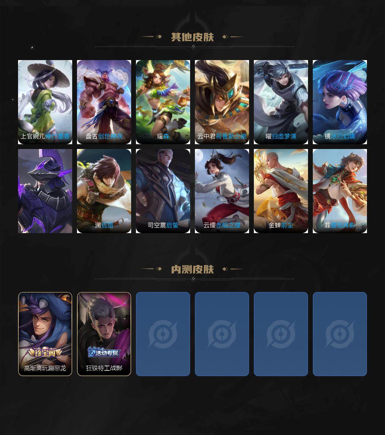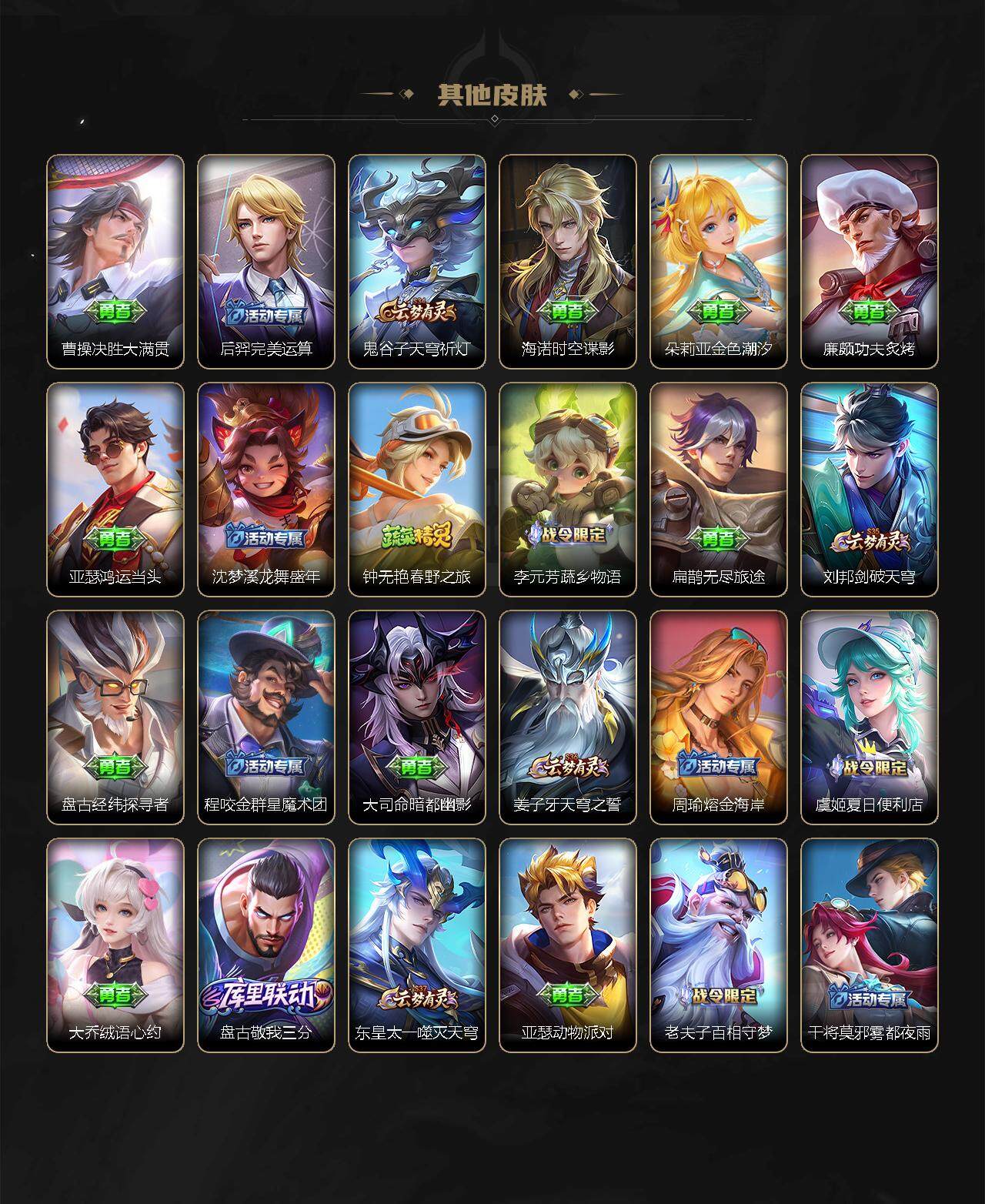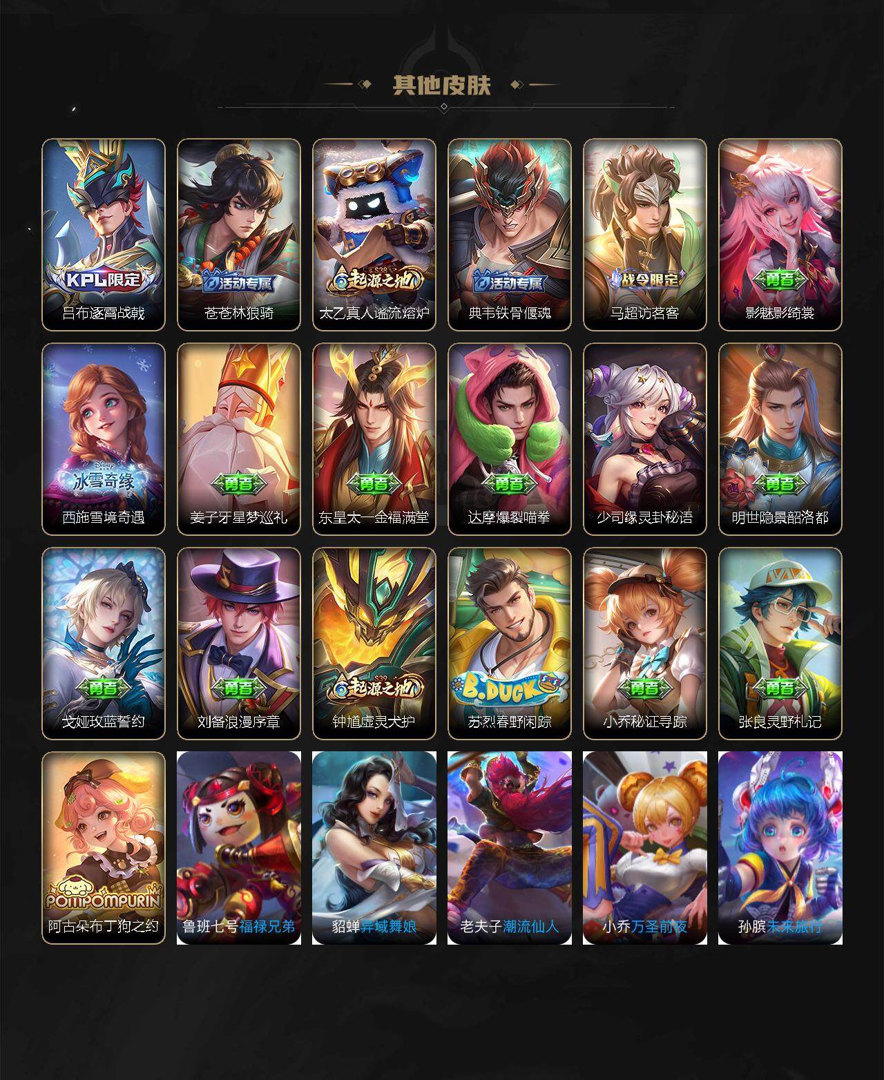 【限定皮肤】:蒙犽顽岩魄,蔡文姬夏日便利店,大乔绒语心约,虞姬夏日便利店,姜子牙天穹之誓,狄仁杰阴阳师,赵云皇家上将,高渐离玩趣恶龙,元歌无心,典韦蓝屏警告,马可波罗暗影游猎,马可波罗山海玄木吟,狄仁杰魔术师,项羽海滩派对,程咬金演武夺筹,韩信飞衡,韩信傲雪梅枪,李元芳云中旅人,鬼谷子五谷丰年,公孙离祈雪灵祝,裴擒虎李小龙,裴擒虎擒涛扼浪,嫦娥暖冬兔眠,西施玲珑珍味,鲁班大师探海日志,桑启海盐诗旅,暃星界游侠,戈娅驭风魔法,艾琳流音漫舞,司空震地狱燃心,阿古朵江河有灵,张良古海寻踪,蒙犽百解令,鬼谷子天穹祈灯,姬小满妄想食味,沈梦溪龙舞盛年,鲁班七号蔬乡物语,李元芳蔬乡物语,刘邦剑破天穹,上官婉儿群星魔术团,程咬金群星魔术团,周瑜熔金海岸