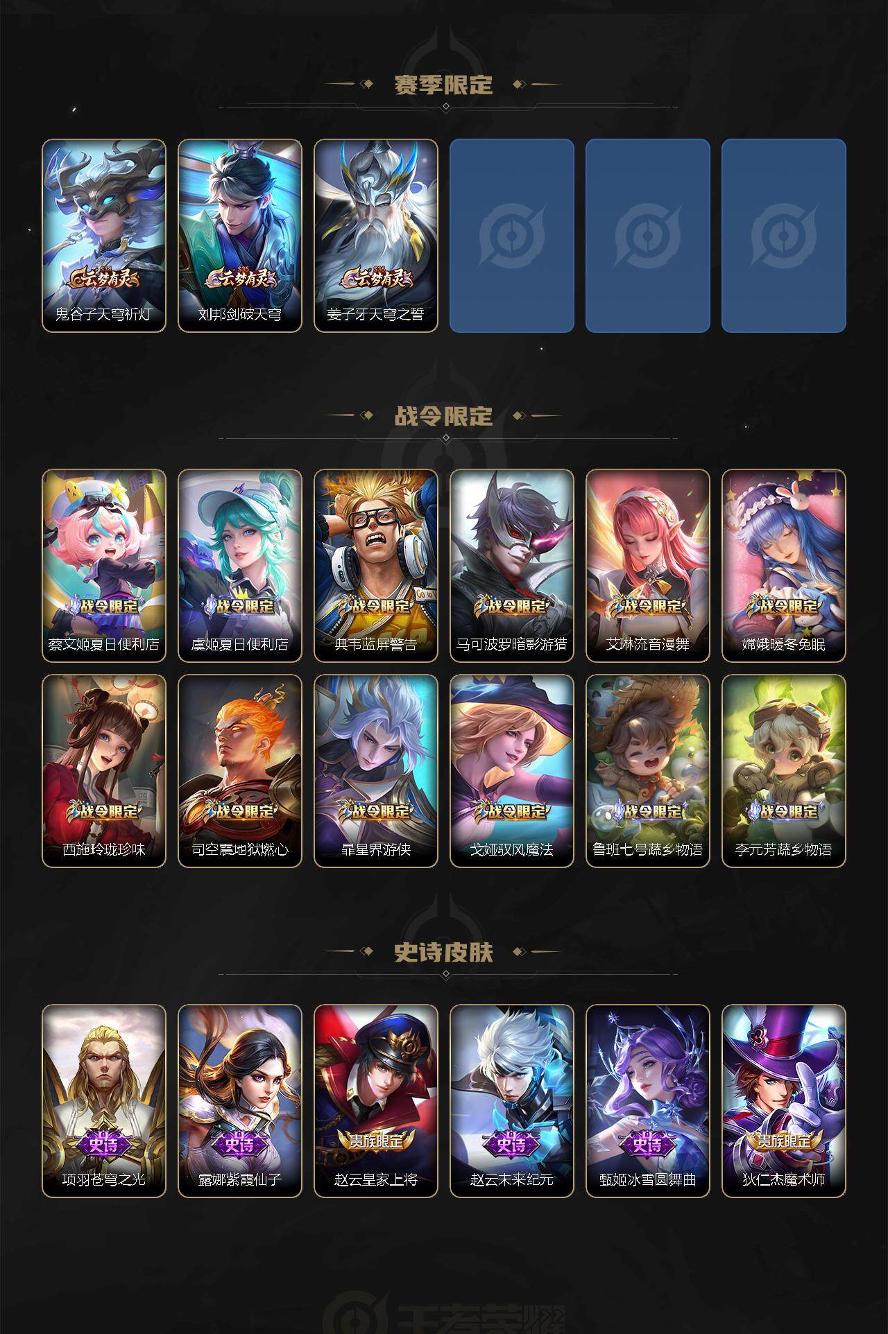 【赛季限定】:程咬金演武夺筹,张良古海寻踪,李元芳云中旅人,裴擒虎擒涛扼浪,鲁班大师探海日志,桑启海盐诗旅,鬼谷子天穹祈灯,刘邦剑破天穹,姜子牙天穹之誓