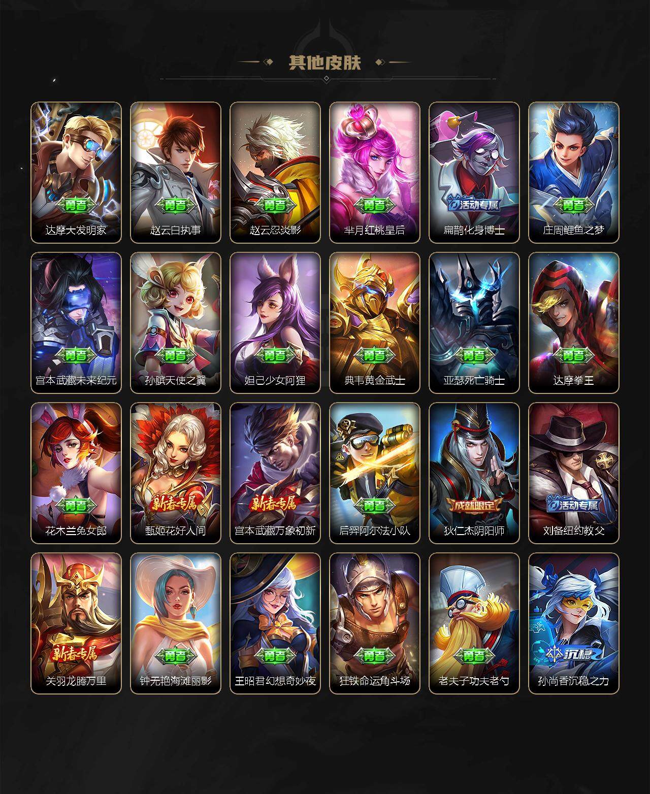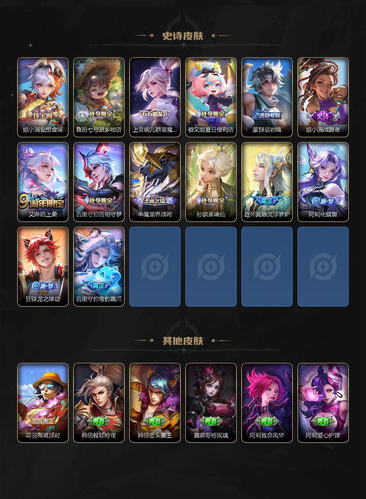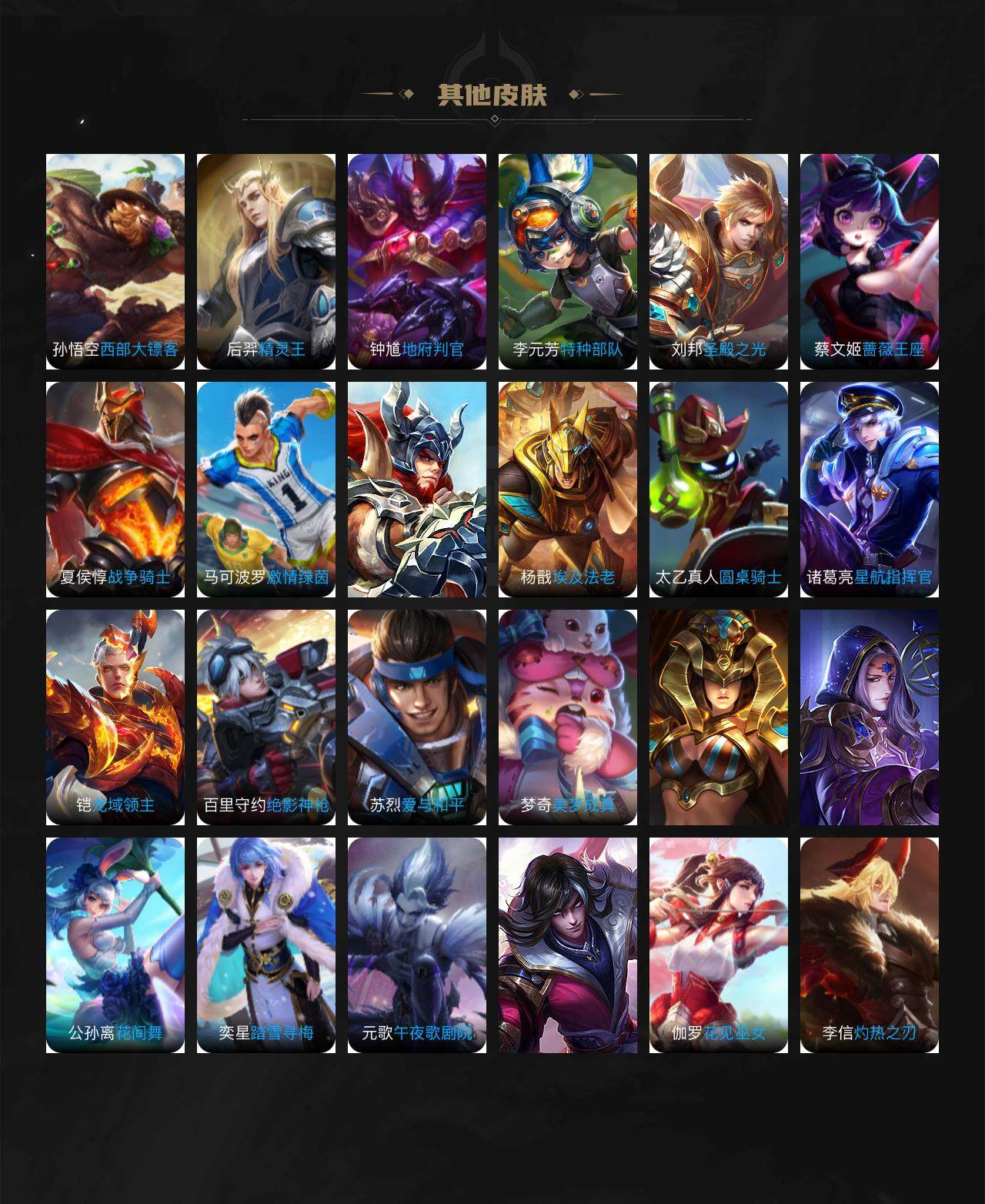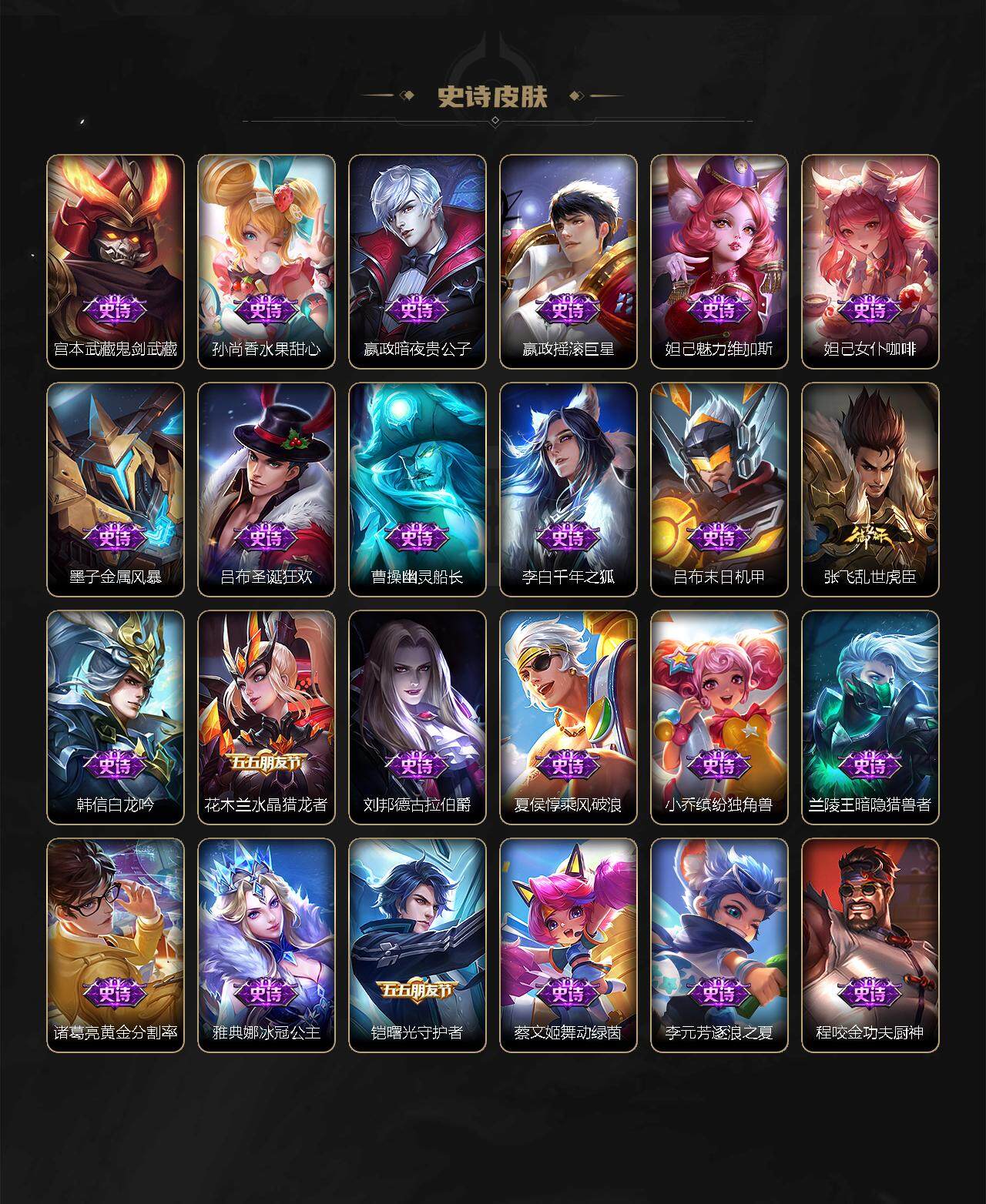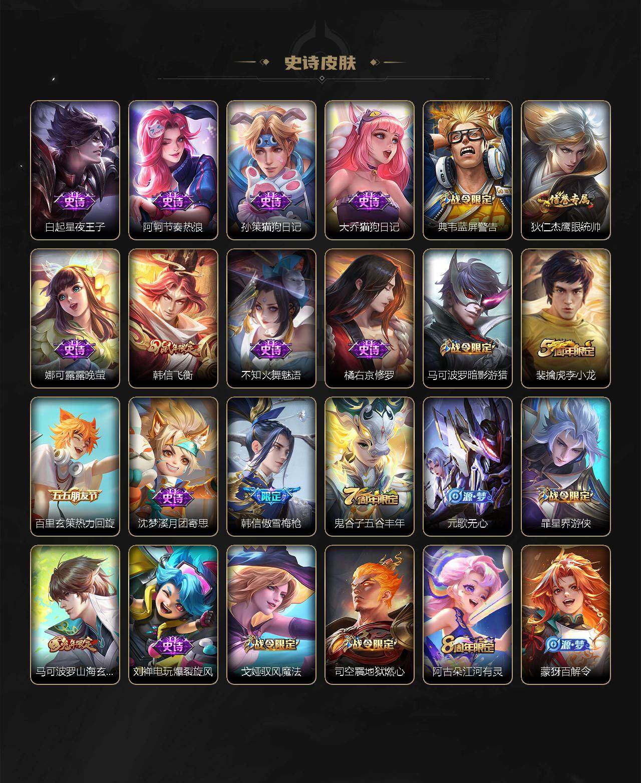 【史诗皮肤】:项羽苍穹之光,露娜紫霞仙子,赵云皇家上将,赵云未来纪元,甄姬冰雪圆舞曲,狄仁杰魔术师,宫本武藏鬼剑武藏,孙尚香水果甜心,嬴政暗夜贵公子,嬴政摇滚巨星,妲己魅力维加斯,妲己女仆咖啡,墨子金属风暴,吕布圣诞狂欢,曹操幽灵船长,李白千年之狐,吕布末日机甲,张飞乱世虎臣,韩信白龙吟,花木兰水晶猎龙者,刘邦德古拉伯爵,夏侯惇乘风破浪,小乔缤纷独角兽,兰陵王暗隐猎兽者,诸葛亮黄金分割率,雅典娜冰冠公主,铠曙光守护者,蔡文姬舞动绿茵,李元芳逐浪之夏,程咬金功夫厨神,白起星夜王子,阿轲节奏热浪,孙策猫狗日记,大乔猫狗日记,典韦蓝屏警告,狄仁杰鹰眼统帅,娜可露露晚萤,韩信飞衡,不知火舞魅语,橘右京修罗,马可波罗暗影游猎,裴擒虎李小龙,百里玄策热力回旋,