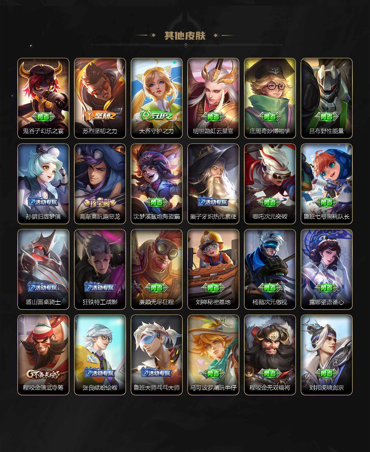 娜可露露晚萤,李元芳逐浪之夏,不知火舞魅语,大乔猫狗日记,孙策猫狗日记,阿轲节奏热浪,露娜紫霞仙子,诸葛亮黄金分割率,韩信白龙吟,项羽苍穹之光,雅典娜冰冠公主,吕布末日机甲,橘右京修罗,嬴政摇滚巨星,白起星夜王子,程咬金功夫厨神,刘邦德古拉伯爵,兰陵王暗隐猎兽者,曹操幽灵船长,宫本武藏鬼剑武藏,蔡文姬舞动绿茵,小乔缤纷独角兽,夏侯惇乘风破浪,花木兰水晶猎龙者,铠曙光守护者,百里玄策热力回旋,墨子金属风暴,吕布圣诞狂欢,嬴政暗夜贵公子,李白千年之狐,刘禅电玩·爆裂旋风,蒙犽百解令,上官婉儿群星魔术团,赵怀真器灵·浮梦炉