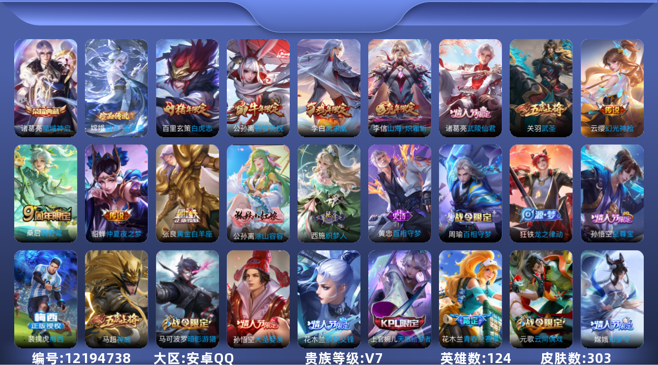 [12194738]V7 1典藏 1珍品传说 10传说 124英雄 303皮肤 可修改实名 优质装备:星域神启(倪克斯贼亮),器灵·落星盏,黄金白羊座,仲夏夜之梦(大飞蛾),山海·炽霜斩(李信年限),涂山容容 传说皮:幻光神枪 珍宝阁皮:胡桃夹子,万物之道,女武神 限定皮:鸣野蒿,至尊宝,白虎志(电光耗子),凤求凰(白切鸡),梅西,武陵仙君(小桃花),时之彼端,神威(电光马子),飞衡(韩信年限),遇见飞天,五谷丰年,武圣,梁祝,祈雪灵祝(雪兔子),天狼绘梦者,李小龙,朱雀志(守约年限),如梦令-嫦娥,默契交锋-花木兰,猪悟能,一生所爱,大圣娶亲,青春决赛季 史诗皮:星界战将,龙之律动,百相守梦-周瑜,琥珀纪元伽罗,百相守梦-黄忠,织梦人,苍穹之光,黄金分割率,永昼,江河有灵,蒙恬荣光圣徽,无限星赏官,冰冠公主,晚萤,电玩·爆裂旋风,龙骑士(小龙虾),末日机甲-吕布,猫狗日记-孙策,时之恋人-孙尚香,乱世虎臣,节奏热浪,修罗,女仆咖啡,摇滚巨星,水果甜心,绅士熊喵,天才门将,星夜王子,心灵骇客,功夫厨神,德古拉伯爵,暗隐猎兽者,幽灵船长,鬼剑武藏,心灵战警,舞动绿茵,地狱岩魂,纤云弄巧,繁星吟游(呼啦呼啦),拒霜思,缤纷独角兽,乘风破浪,逐浪之夏,月团寄思,水晶猎龙者,曙光守护者,箭羽风息,金属风暴,原初追逐者,圣诞狂欢,圣诞恋歌,鹰眼统帅,王者之锤,暗夜贵公子,魅力维加斯,黎明之约,赏金猎手,无心