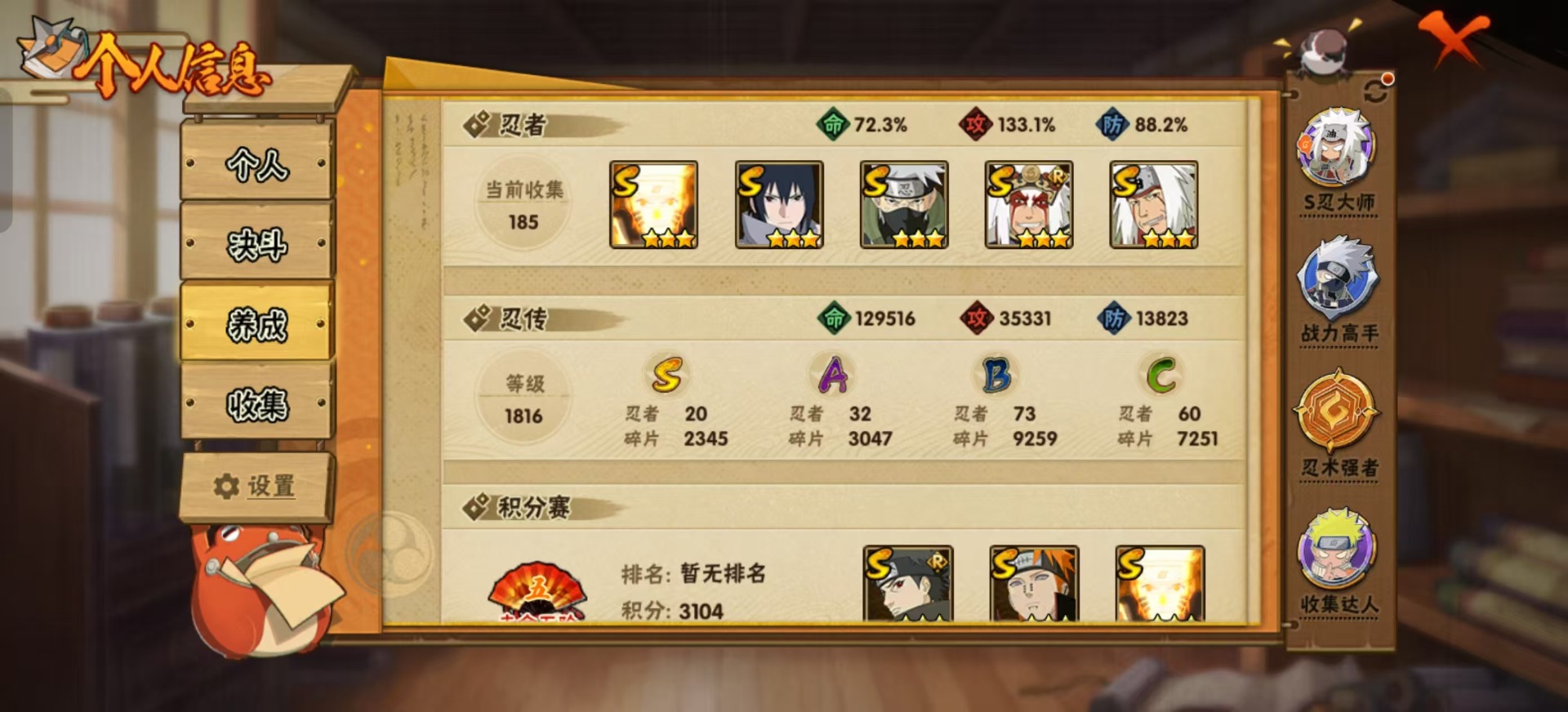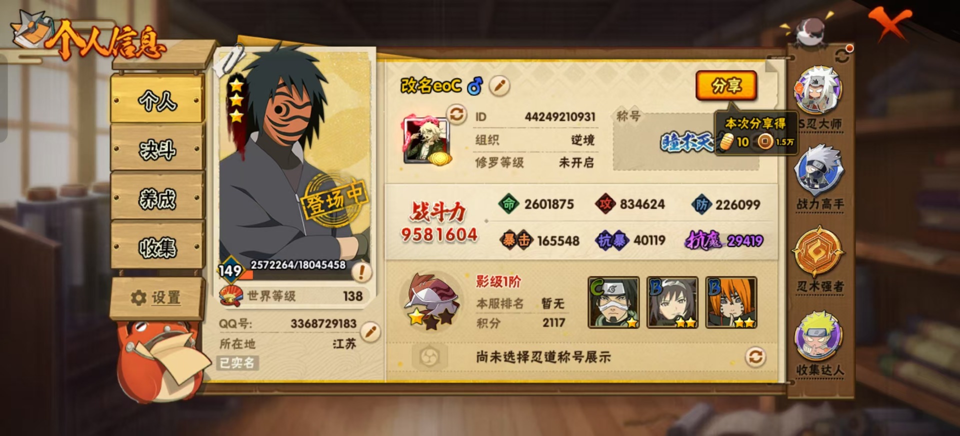 [12194465]V10 20S忍 32A忍 17通灵 958.1W战力 可二次 可修改实名 优质装备:千手柱间「秽土转生」,宇智波鼬「秽土转生」,长门「秽土转生」,漩涡鸣人 「九喇嘛连结」,大筒木金式「博人传」,神秘面具男 「红夜之刃」,宇智波佐助「永恒万花筒」,千手柱间·木叶创立,宇智波斑「秽土转生·解」,大筒木桃式,艾「忍界大战」,宇智波止水「须佐能乎」,旗木卡卡西「须佐能乎」,大筒木舍人 「最终章」,自来也 「传说中的三忍」 S级忍者:自来也 「舞之豪杰」,宇智波鼬 「须佐能乎」,佩恩「天道」,波风水门,大蛇丸