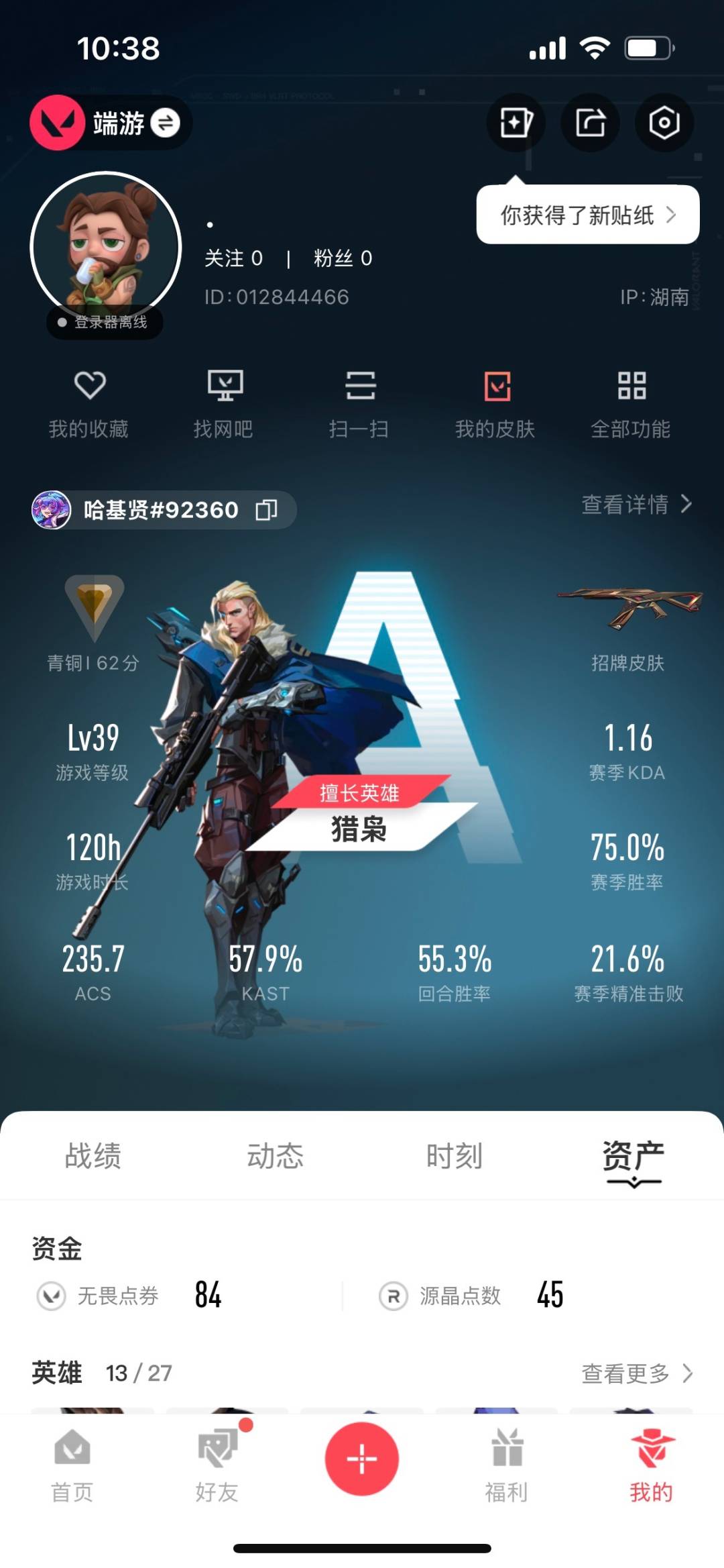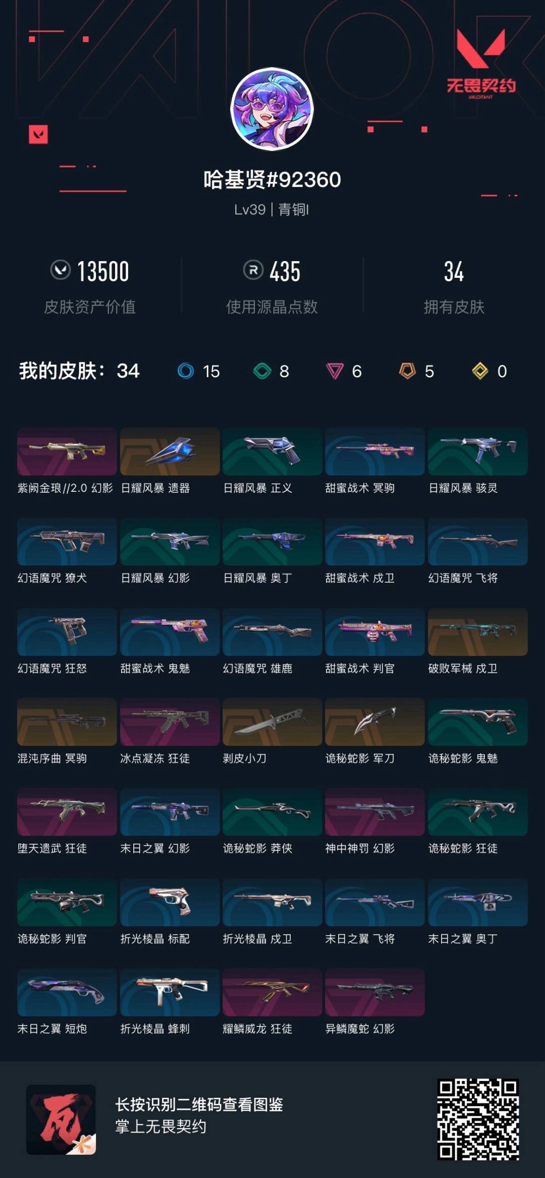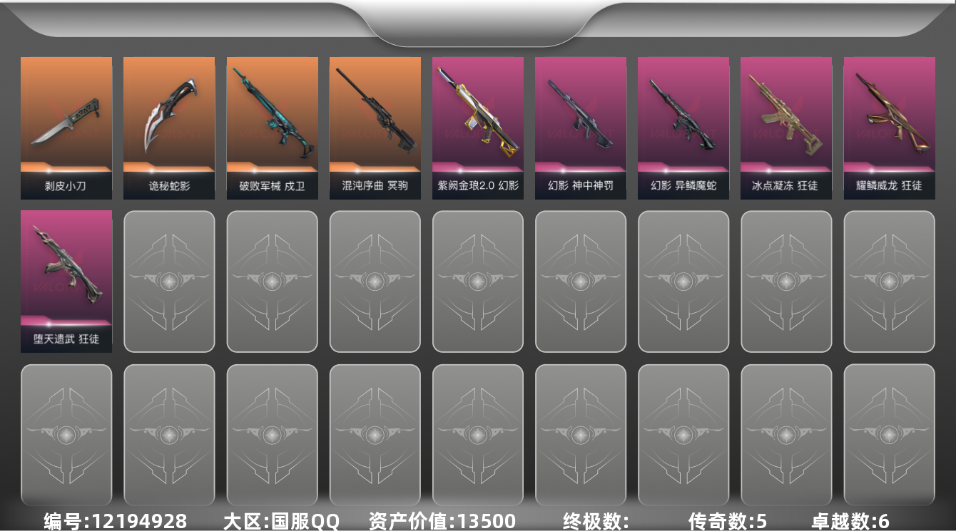 [12194928]5橙皮 6紫皮 34皮肤 13英雄 44卡面 435已用源晶 青铜 优质装备:冥驹-混沌序曲,幻影-紫阙金琅2.0,狂徒-冰点凝冻,剥皮小刀,戍卫-破败军械,狂徒-耀鳞威龙,诡秘蛇影 步枪皮肤:幻影-异鳞魔蛇,幻影-神中神罚,狂徒-堕天遗武