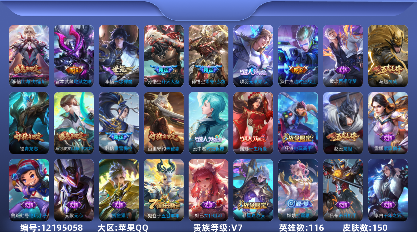 [12195058]V7 7传说 116英雄 150皮肤 可修改实名 优质装备:一念神魔,零号·赤焰,地狱之眼,超时空战士-狄仁杰,山海·炽霜斩(李信年限) 珍宝阁皮:优雅恋人 限定皮:傲雪梅枪,神威(电光马子),无限倾心-项羽,齐天大圣,匿光决锋者,五谷丰年,青龙志(铠年限),龙胆,朱雀志(守约年限),一生所爱,时之祈愿-云中君,神器·万象笔,山海·玄木吟(马可年限) 史诗皮:百相守梦-黄忠,紫霞仙子,电玩小子(小书包),黄金分割率,千年之狐,末日机甲-吕布,猫狗日记-孙策,乱世虎臣,节奏热浪,女仆咖啡,摇滚巨星,水果甜心,心灵骇客,鬼剑武藏,心灵战警,拒霜思,缤纷独角兽,逐浪之夏,唤灵魅影,金属风暴,鹰眼统帅,暗夜贵公子,魅力维加斯,黎明之约,赏金猎手,千筹问战,无心
