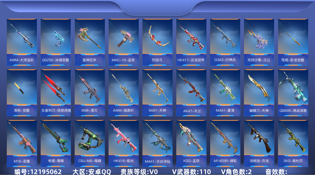 [12195062]V0 1王者武器 110英雄武器 2英雄角色 可二次 可修改实名 v武器:M14EBR-拂影,雌雄双股剑,SCAR-探星者,蝴蝶刀-天神,QBB95-再战涿鹿,M16-恶魔,电锯-毒蜂,KSG-孟获,CBJ-MS-毒蜂,HK416-极光,M4A1-太白诗仙,M4A1-夏清,丛林匕首-庆龙觉醒,USP-机械迷城,唐刀-大唐荣耀,加特林-堡垒,秋逸,QBB95-极光,M1216-血月,CZS2-血月,手斧-机械迷城,QSZ92-冰魂觉醒,蛮神巨斧,MAC-10-孟获,烈焰弓,HK417-炎龙铠甲,G3A3-衍神兵,AWM-大湾溢彩,双持沙鹰-元让,XM8-湮灭,AWM-指南针,9A91-天神,AK47-木兰,甩棍-卧龙觉醒,清刚-觉醒,女皇利刃-铁胆虎魄,AK47-火麒麟,M4A1-雷神,AK47-无影,AK12-天启,加特林-炼狱,AWM-天龙,巴雷特-毁灭,AWM-裁决,M14EBR-天神,SKS-美杜莎,M4A1-机械迷城,AK47-血武士,M4A1-冰锋觉醒,81式-光明之神,AUG-机械纪元,M4A1-心动次元,QBZ03-金色蔷薇,AK47-黑鲨,神罚战斧,马来剑-毁灭,屠龙,M4A1-运输船,贝雷塔-力拔山河,汤姆逊-烈龙,沙鹰-修罗,双持柯尔特-极光