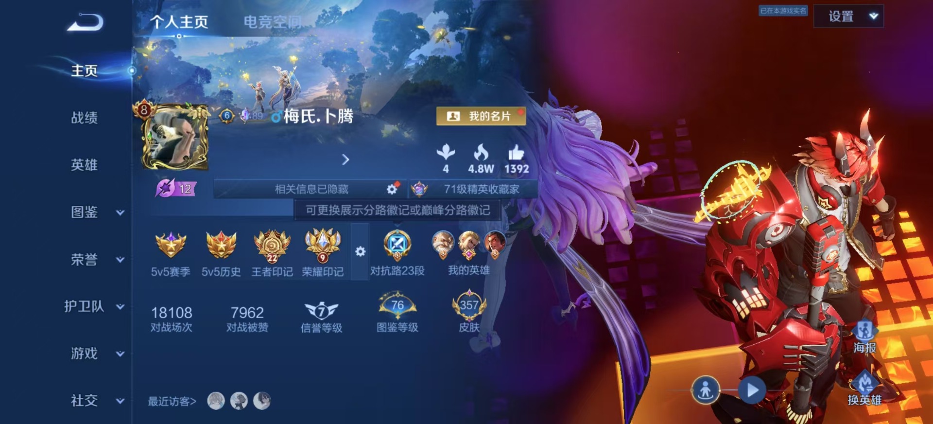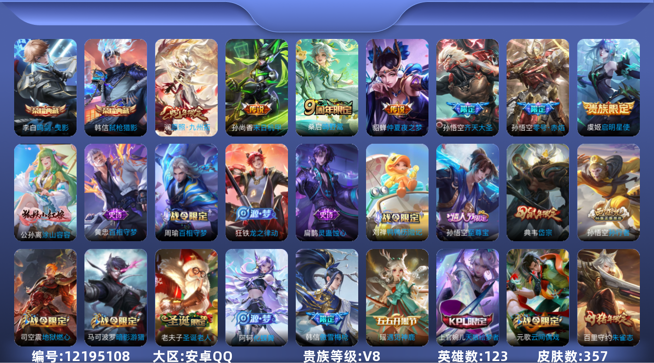 [12195108]V8 2典藏 7传说 123英雄 357皮肤 可修改实名 优质装备:鸣剑·曳影,弑枪猎影(韩信典藏),末日机甲-孙尚香(绿蚂蚱),仲夏夜之梦(大飞蛾),零号·赤焰,涂山容容 珍宝阁皮:妄想食味,蔷薇恋人,玩趣恶龙 限定皮:愿照·九州拓(澜年限),鸣野蒿,至尊宝,傲雪梅枪,白晶晶,高山流水,齐天大圣,五谷丰年,幽恒(沐浴露),游园惊梦,梁祝,御风骁将(吕布年限),岱宗(典韦年限),天狼绘梦者,李小龙,朱雀志(守约年限),如梦令-后羿,圣诞老人,孙行者 史诗皮:鸭鸭历险记-刘禅,化蝶舞,灵蛊蚀心,星界战将,龙之律动,百相守梦-周瑜,蒙犽顽岩魄,百相守梦-黄忠,遇见神鹿,紫霞仙子,电玩小子(小书包),白龙吟,黄金分割率,特工魅影,千年之狐,江河有灵,魅语,蒙恬荣光圣徽,无限星赏官,冰冠公主,青蛇,暗夜猫娘,末日机甲-吕布,猫狗日记-孙策,猫狗日记-大乔,乱世虎臣,节奏热浪,修罗,女仆咖啡,摇滚巨星,水果甜心,绅士熊喵,天才门将,星夜王子,心灵骇客,功夫厨神,德古拉伯爵,暗隐猎兽者,幽灵船长,鬼剑武藏,心灵战警,天秀·启明,舞动绿茵,地狱岩魂,纤云弄巧,繁星吟游(呼啦呼啦),拒霜思,缤纷独角兽,乘风破浪,逐浪之夏,水晶猎龙者,曙光守护者,箭羽风息,金属风暴,原初追逐者,圣诞狂欢,圣诞恋歌,鹰眼统帅,魅力维加斯,黎明之约,赏金猎手,无心,未来纪元-赵云
