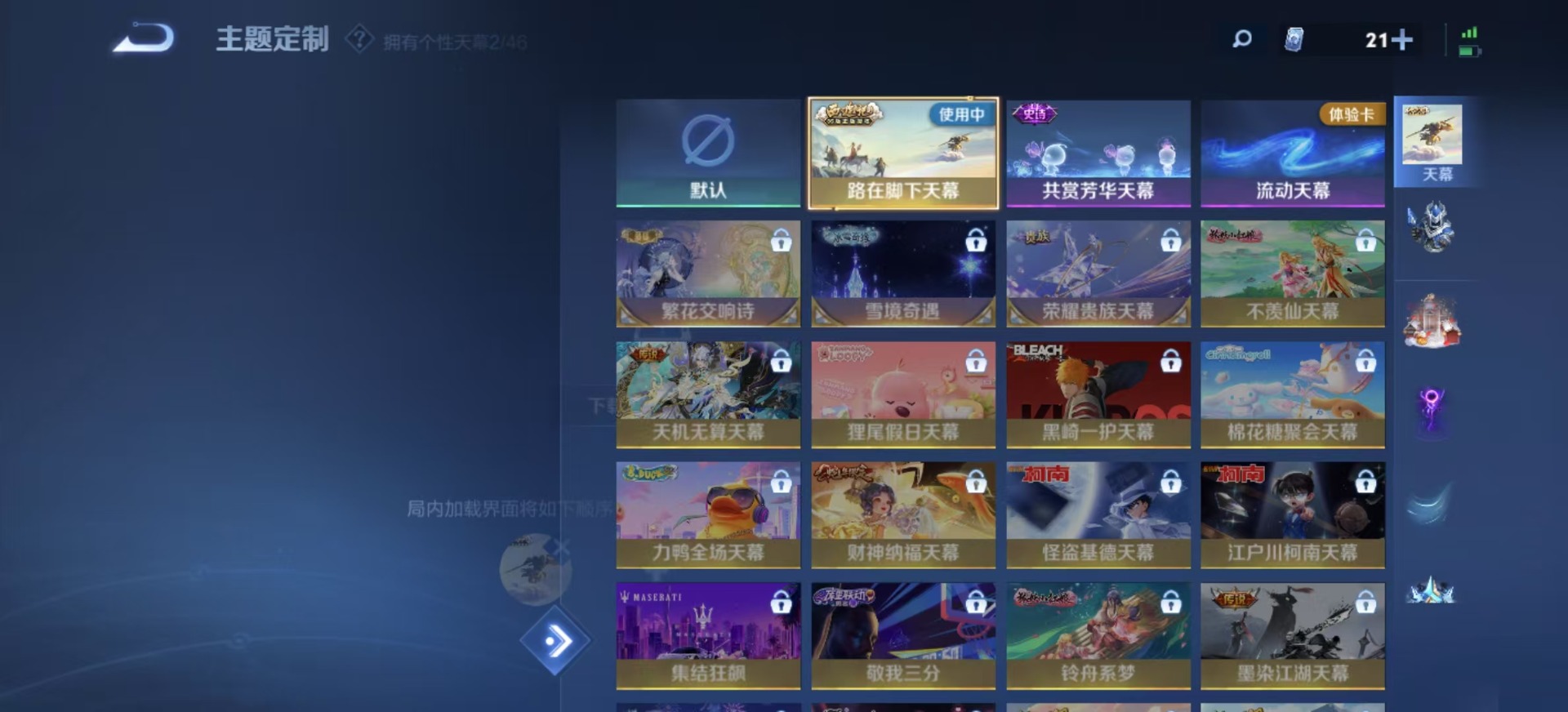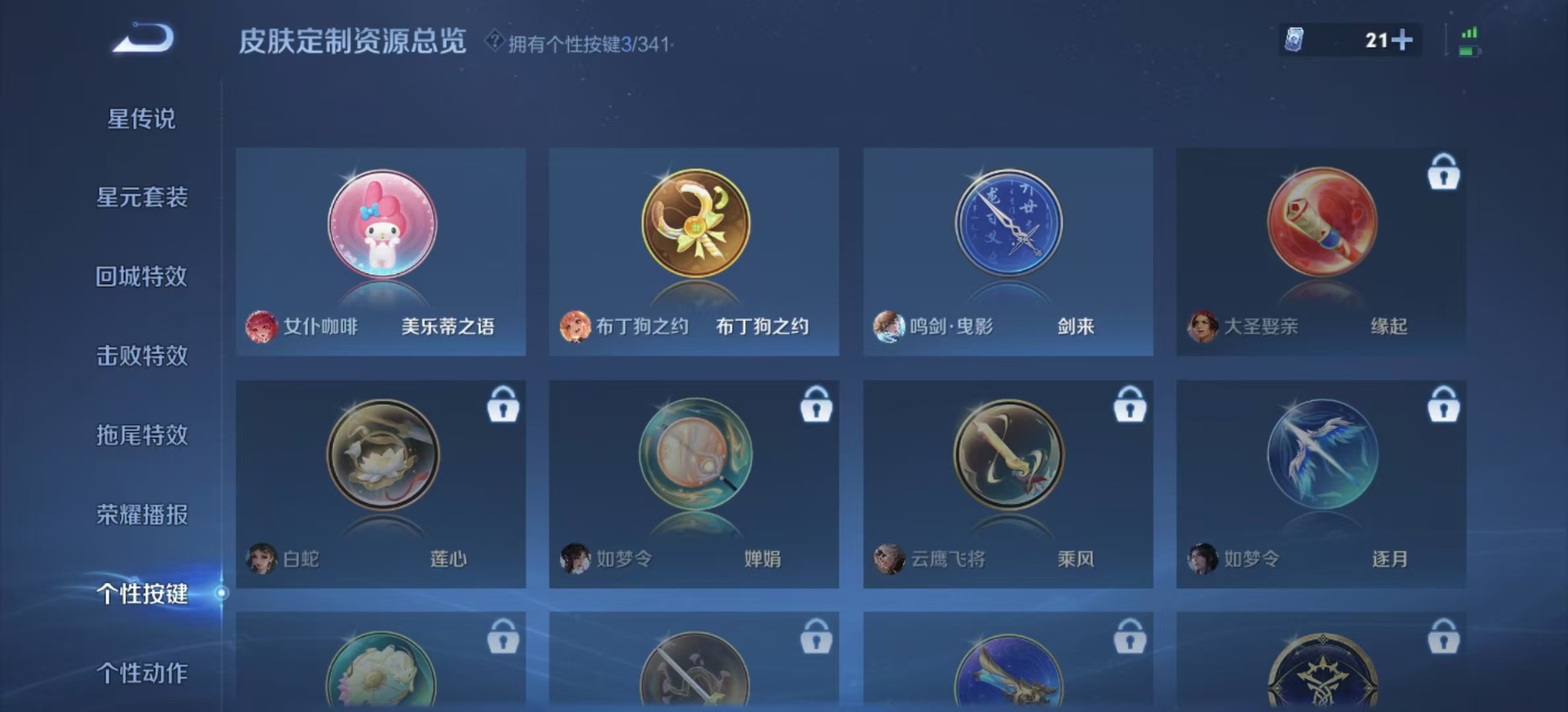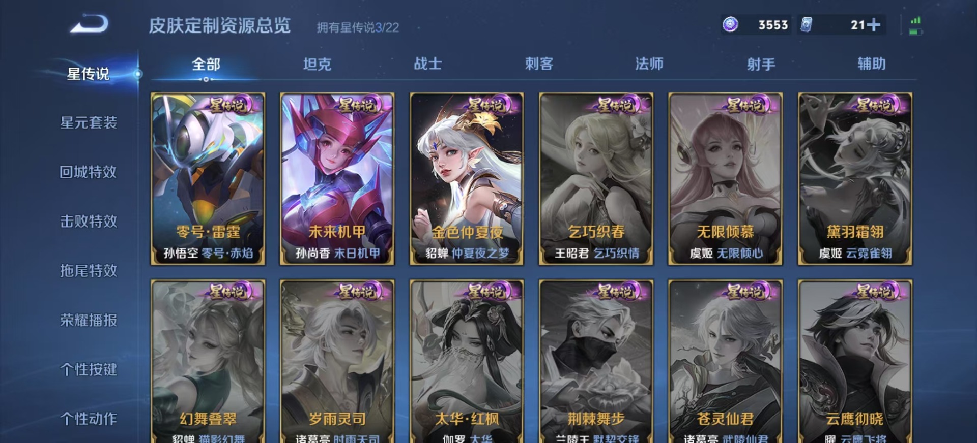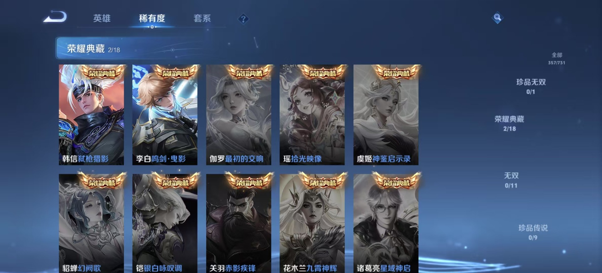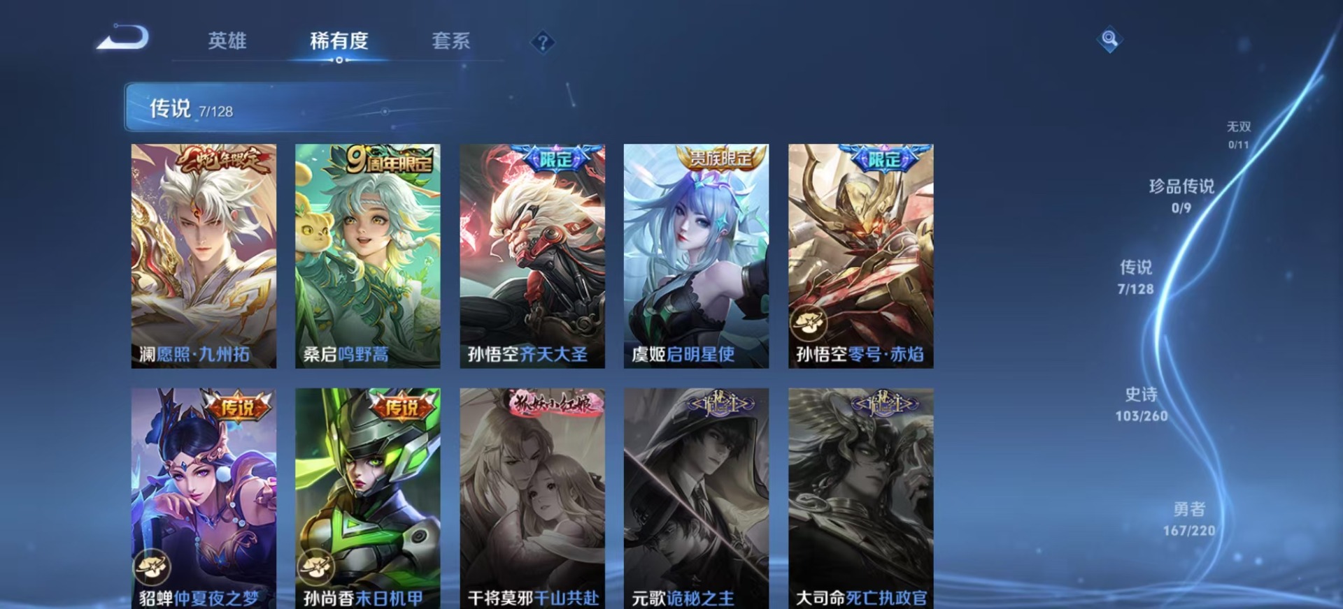 刘邦夺宝奇兵,夏侯惇朔风刀,老夫子醍醐杖,沈梦溪星空之诺,沈梦溪大漠名商,盾山御銮,苏烈千军破阵,达摩沙漠行僧,项羽苍威无极,吕布猎兽之王,镜青焰无极,元歌云间偶戏,兰陵王金庭之子,裴擒虎擒涛扼浪,鲁班大师探海日志,明世隐疑决卦,蒙犽狂想玩偶喵,马可波罗暗影游猎,鬼谷子原初探秘者,张良古海寻踪,桑启海盐诗旅,狄仁杰万华元夜,程咬金演武夺筹,李元芳银河之约,李元芳云中旅人,弈星混沌棋,钟馗驱傩正仪