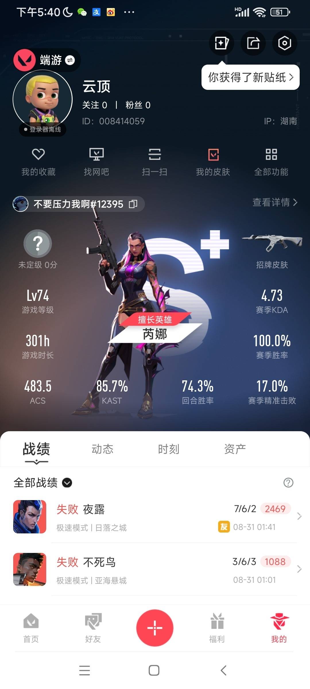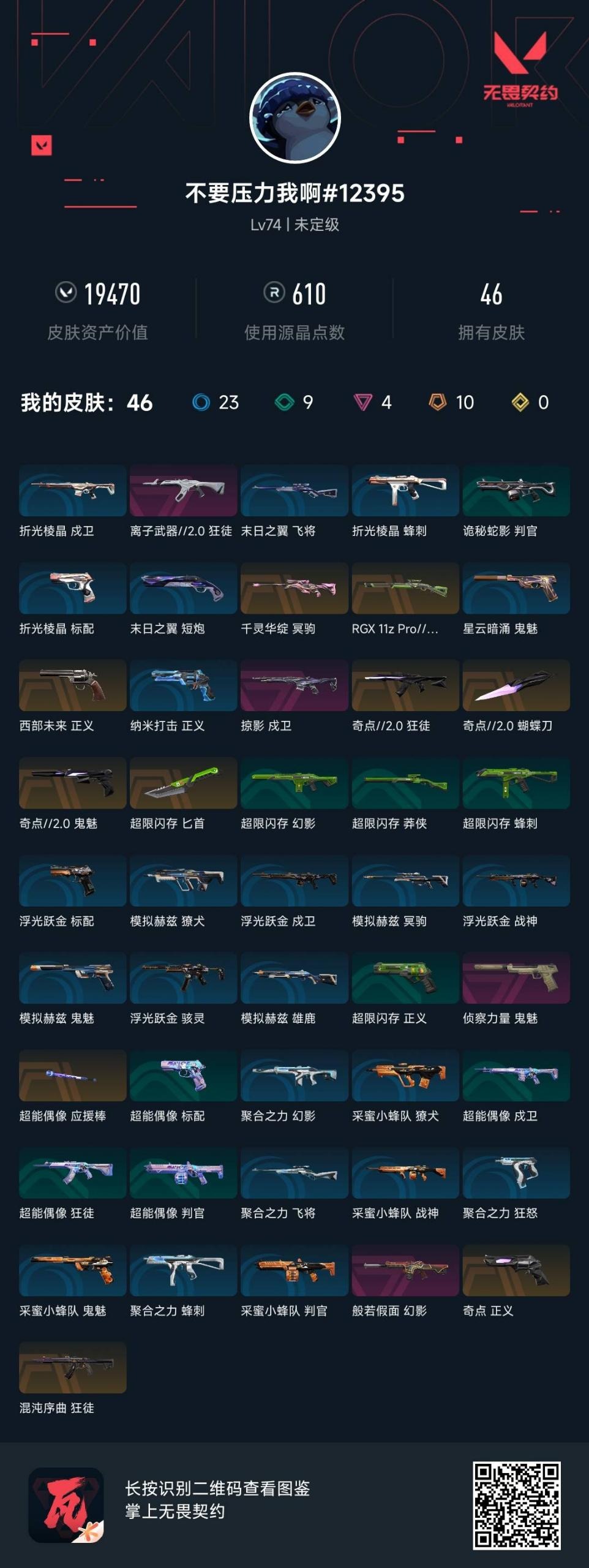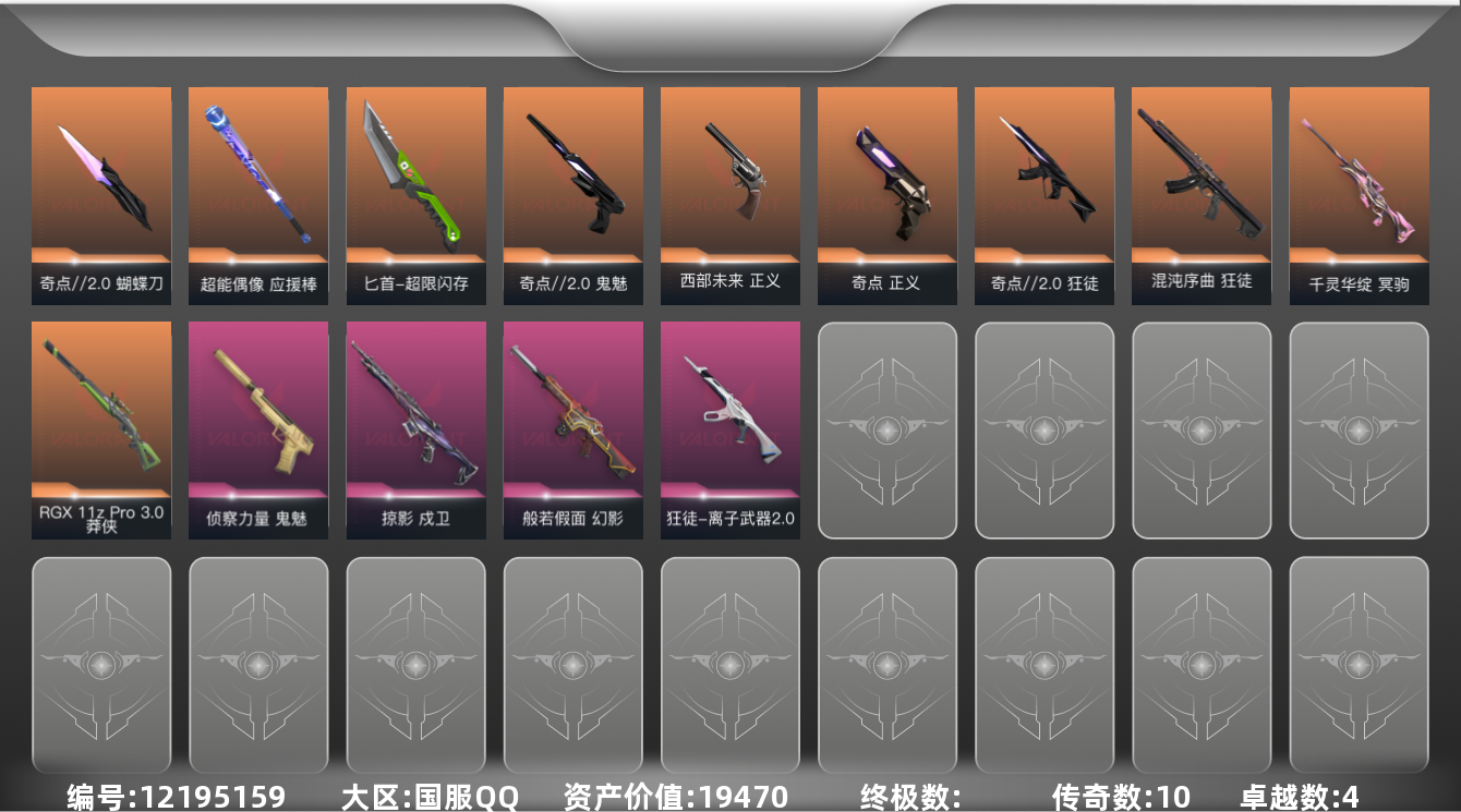 [12195159]10橙皮 4紫皮 46皮肤 23英雄 64卡面 610已用源晶 未定级 优质装备:奇点//2.0套装,正义-奇点,冥驹-千灵华绽,狂徒-混沌序曲,幻影-般若假面,狂徒-奇点//2.0,戍卫-掠影,鬼魅-侦察力量,匕首-超限闪存,鬼魅-奇点//2.0,蝴蝶刀-奇点//2.0 佩枪皮肤:正义-西部未来 步枪皮肤:狂徒-离子武器2.0 狙击枪皮肤:莽侠-RGX 11z Pro 3.0 近战武器皮肤:超能偶像 应援棒