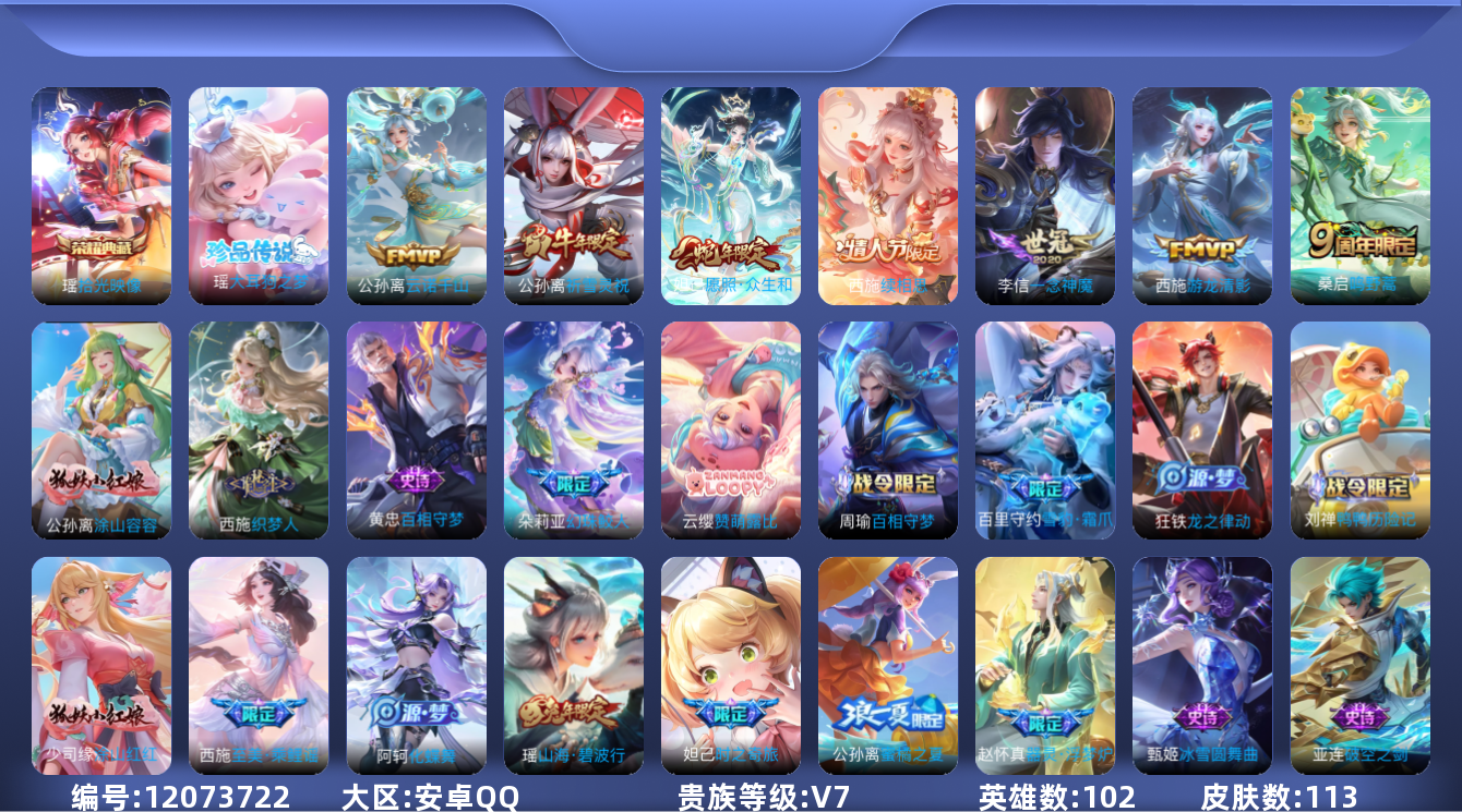 [12073722]V7 1典藏 1珍品传说 7传说 102英雄 113皮肤 可修改实名 优质装备:拾光映像(瑶典藏),大耳狗之梦,一念神魔,游龙清影(小青龙),涂山容容 传说皮:云诺千山,续相思 限定皮:愿照·众生和(妲己年限),鸣野蒿,山海·碧波行(瑶年限),至美·乘鲤谣,祈雪灵祝(雪兔子),蜜橘之夏,时之奇旅-妲己 史诗皮:赞萌露比,鸭鸭历险记-刘禅,器灵·浮梦炉,化蝶舞,龙之律动,雪豹·霜爪,百相守梦-周瑜,百相守梦-黄忠,破空之剑,涂山红红,幻珠鲛人,百相守梦-百里守约,织梦人,黄金分割率,千年之狐,白蛇,真我赫兹(百里守约),青蛇,无限星赏官,偶像歌手,末日机甲-吕布,女仆咖啡,水果甜心,绅士熊喵,心灵骇客,功夫厨神,德古拉伯爵,缤纷独角兽,逐浪之夏,箭羽风息,圣诞恋歌,魅力维加斯