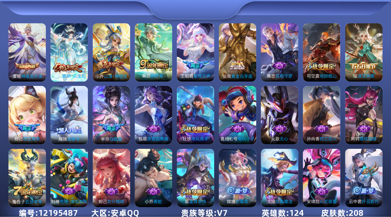 [12195487]V7 1典藏 5传说 124英雄 208皮肤 可修改实名 优质装备:神鉴启示录,黄金白羊座,山海·琳琅生(小乔年限) 珍宝阁皮:胡桃夹子,蔷薇恋人 限定皮:愿照·众生和(妲己年限),鸣野蒿,寅虎·展翼(孙膑年限),星穹之声,白晶晶,遇见飞天,高山流水,五谷丰年,如梦令-嫦娥,时之奇旅-妲己 史诗皮:蔬乡物语(鲁班七号),百相守梦-黄忠,遇见神鹿,电玩小子(小书包),黄金分割率,特工魅影,江河有灵,百解令(蒙犽),高渐离燃音魔法,青蛇,偶像歌手,电玩·爆裂旋风,暗夜猫娘,猫狗日记-孙策,猫狗日记-大乔,时之恋人-孙尚香,节奏热浪,女仆咖啡,摇滚巨星,水果甜心,天才门将,星夜王子,心灵骇客,功夫厨神,鬼剑武藏,心灵战警,舞动绿茵,地狱岩魂,纤云弄巧,繁星吟游(呼啦呼啦),拒霜思,缤纷独角兽,逐浪之夏,箭羽风息,金属风暴,圣诞恋歌,鹰眼统帅,暗夜贵公子,魅力维加斯,无心