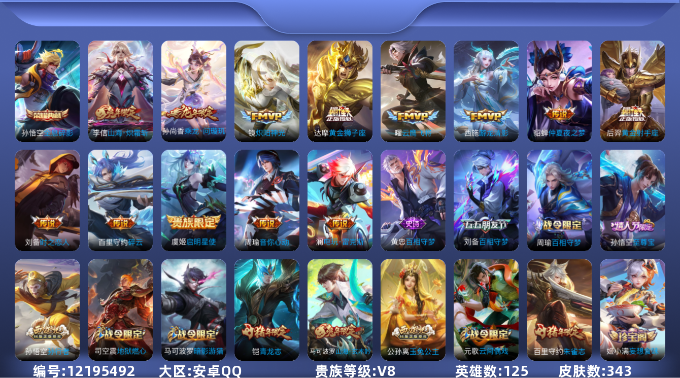 [12195492]V8 1典藏 13传说 125英雄 343皮肤 可修改实名 优质装备:全息碎影(猴子典藏),黄金狮子座,黄金射手座,云鹰飞将(小将军),炽阳神光,仲夏夜之梦(大飞蛾),音你心动-周瑜,时之恋人-刘备(电焊工),游龙清影(小青龙),碎云,山海·炽霜斩(李信年限),电玩·雷克斯 传说皮:乘龙·问璇玑(孙尚香年限) 珍宝阁皮:妄想食味,蔷薇恋人,女武神 限定皮:至尊宝,飞衡(韩信年限),遇见飞天,高山流水,五谷丰年,青龙志(铠年限),梁祝,天狼溯光者,李小龙,逐梦之光,朱雀志(守约年限),真爱至上,孙行者,时之祈愿-云中君,玉兔公主,山海·玄木吟(马可年限) 史诗皮:星界战将,百相守梦-周瑜,蒙犽顽岩魄,琥珀纪元伽罗,百相守梦-黄忠,紫霞仙子,苍穹之光,白龙吟,黄金分割率,特工魅影,千年之狐,永昼,江河有灵,雪夜绮愿(周瑜),真我赫兹(百里守约),魅语,蒙恬荣光圣徽,无限星赏官,冰冠公主,偶像歌手,电玩·兔顽号,电玩·爆裂旋风,百相守梦(刘备),暗夜猫娘,龙骑士(小龙虾),末日机甲-吕布,猫狗日记-孙策,猫狗日记-大乔,时之恋人-孙尚香,乱世虎臣,节奏热浪,修罗,女仆咖啡,摇滚巨星,水果甜心,绅士熊喵,天才门将,星夜王子,心灵骇客,时之奇旅-安琪拉,功夫厨神,德古拉伯爵,暗隐猎兽者,幽灵船长,鬼剑武藏,心灵战警,地狱岩魂,诗语江南,纤云弄巧,繁星吟游(呼啦呼啦),拒霜思,缤纷独角兽,乘风破浪,逐浪之夏,水晶猎龙者,曙光守护者,热力回旋,金属风暴,原初追逐者,圣诞狂欢,圣诞恋歌,鹰眼统帅,暗夜贵公子,魅力维加斯,黎明之约,赏金猎手,滕王阁序,无心,未来纪元-赵云