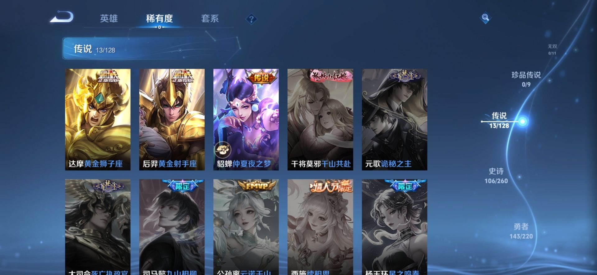 - [12226306]V7 10传说 124英雄 238皮肤 可修改实名 优质装备:黄金射手座,黄金白羊座,久胜战神,一念神魔,末日机甲-孙尚香(绿蚂蚱),地狱火,仲夏夜之梦(大飞蛾),淬星耀世,超时空战士-狄仁杰,末日机甲-孙策,涂山容容 珍宝阁皮:女武神,玩趣恶龙 限定皮:至尊宝,傲雪梅枪,遇见飞天,五谷丰年,梁祝,李小龙,朱雀志(守约年限),青春决赛季,美猴王,匿光追影者 史诗皮:百相守梦-黄忠,黄金分割率,特工魅影,千年之狐,魅语,冰冠公主,青蛇,晚萤,末日机甲-吕布,猫狗日记-孙策,乱世虎臣,节奏热浪,修罗,女仆咖啡,水果甜心,星夜王子,心灵骇客,功夫厨神,德古拉伯爵,暗隐猎兽者,鬼剑武藏,心灵战警,舞动绿茵,地狱岩魂,纤云弄巧,繁星吟游(呼啦呼啦),缤纷独角兽,乘风破浪,逐浪之夏,水晶猎龙者,曙光守护者,箭羽风息,金属风暴,圣诞狂欢,圣诞恋歌,鹰眼统帅,暗夜贵公子,魅力维加斯,黎明之约,未来纪元-赵云
