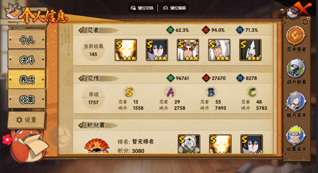[12090799]V10 13S忍 29A忍 16通灵 794.4W战力 可二次 可修改实名 优质装备:宇智波鼬「秽土转生」,迈特凯「死门」,“宇智波斑” 「白面具」,漩涡鸣人 「九喇嘛连结」,宇智波佐助「永恒万花筒」,千手柱间·木叶创立,宇智波斑「秽土转生·解」,大筒木桃式,自来也 「传说中的三忍」 S级忍者:自来也 「舞之豪杰」,佩恩「天道」,波风水门,大蛇丸