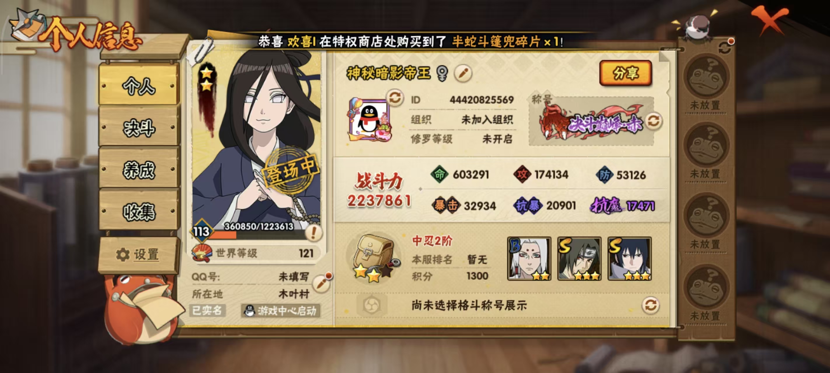 [12195776]安卓Q区 113级 223万战斗力 V1 4名S忍 万花筒佐助 豪杰自来也 须佐能乎鼬 天道佩恩 4名A忍 8名B忍 25名C忍