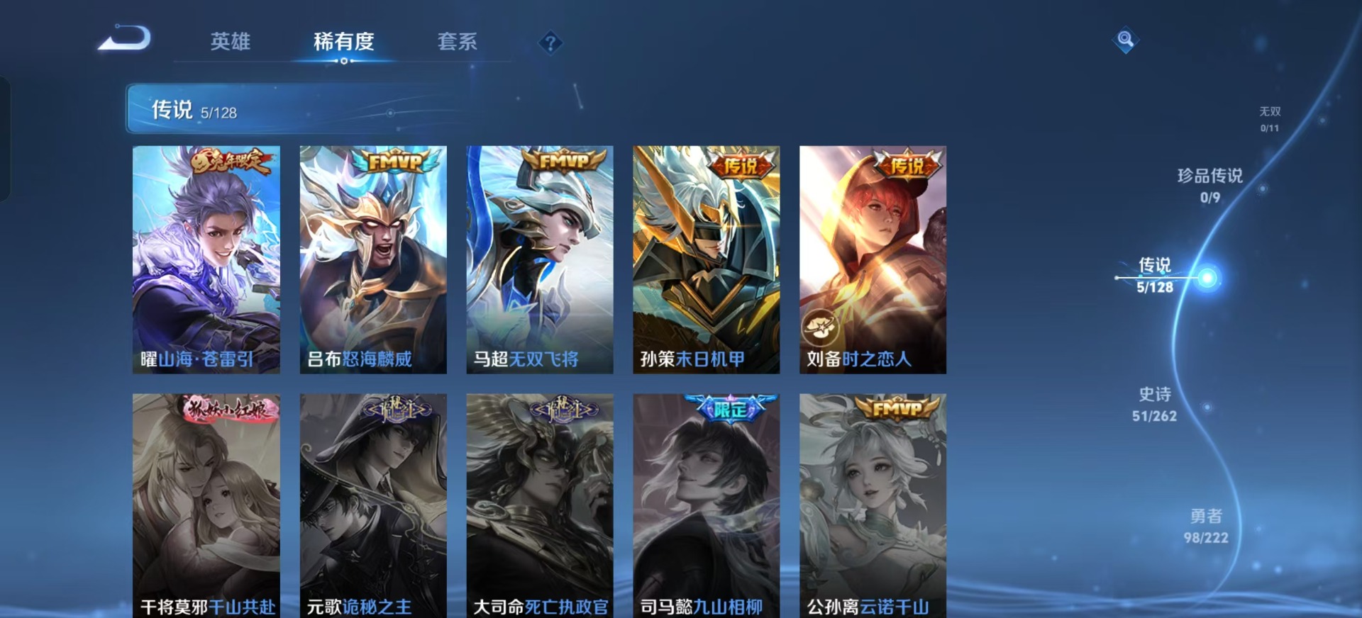 - PX_2095109-实名: 不可修改 性别: 男号 贵族等级: V7 英雄数: 122 皮肤数: 198 传说皮: 末日机甲-孙尚香,淬星耀世,无双飞将,山海·炽霜斩,幻光神枪,祥瑞亨通 限定皮: 游园惊梦,梁祝,高山流水,孙行者,傲雪梅枪,五谷丰年,山海·玄木吟,鸣野蒿,陌上桑,愿照·九州拓 亮点: 【店长推荐精品号】小号!13王者印记,8传说皮,马超无双飞将,云缨幻光神枪,裴擒虎祥瑞亨通,8