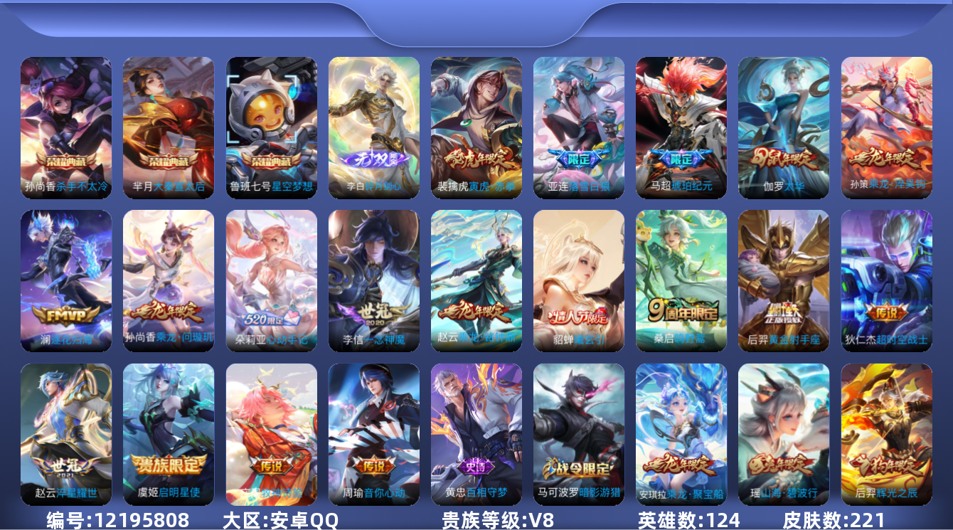 [12195808]皇冠等级 安卓QQ 贵族8 荣耀典藏3 无双1 传说皮肤17 史诗皮肤56 皮肤数量221 皮肤价值:211072 英雄124 尊贵铂金II【荣耀皮肤】3 鲁班七号_星空梦想 芈月_大秦宣太后 孙尚香_杀手不太冷 【无双皮肤】1 李白_碎月剑心【传说皮肤】17 庄周_牧神诗旅 桑启_鸣野蒿 朵莉亚_心动手记 孙策_乘龙淬吴钩 孙尚香_乘龙问璇玑 赵云_乘龙铭钟鼎 裴擒虎_寅虎赤拳 貂蝉_曦玄引 虞姬_启明星使 周瑜_音你心动 狄仁杰_超时空战士 亚连_落雪白狼 马超_琥珀纪元 澜_逐花归海 赵云_淬星耀世 李信_一念神魔 后羿_黄金射手座 【史诗皮肤】56 黄忠_百相守梦 亚连_破空之剑 蔡文姬_夏日便利店 明世隐_夜落电台 狄仁杰_魔术师 赵云_皇家上将 安琪拉_乘龙聚宝船 瑶_山海碧波行 后羿_辉光之辰 嫦娥_如梦令 铠_曙光守护者 花木兰_水晶猎龙者 鬼谷子_五谷丰年 上官婉儿_梁祝 鲁班七号_蔬乡物语 马可波罗_暗影游猎 兰陵王_驯魔猎人 杨玉环_银翎春语 夏洛特_永昼 不知火舞_魅语 大乔_白蛇 娜可露露_晚萤 白起_星夜王子 程咬金_功夫厨神 李元芳_逐浪之夏 刘禅_天才门将 蔡文姬_舞动绿茵 百里守约_特工魅影 安琪拉_心灵骇客 亚瑟_心灵战警 兰陵王_暗隐猎兽者 小乔_缤纷独角兽 夏侯惇_乘风破浪 刘邦_德古拉伯爵 李白_千年之狐 曹操_幽灵船长 妲己_女仆咖啡 妲己_魅力维加斯 宫本武藏_鬼剑武藏 露娜_紫霞仙子 吕布_圣诞狂欢 墨子_金属风暴 孙尚香_水果甜心 王昭君_偶像歌手 项羽_苍穹之光 嬴政_摇滚巨星 嬴政_暗夜贵公子 赵云_未来纪元 甄姬_冰雪圆舞曲 蒙犽_百解令 嫦娥_拒霜思 云中君_纤云弄巧 蔡文姬_繁星吟游 张飞_乱世虎臣 狄仁杰_鹰眼统帅