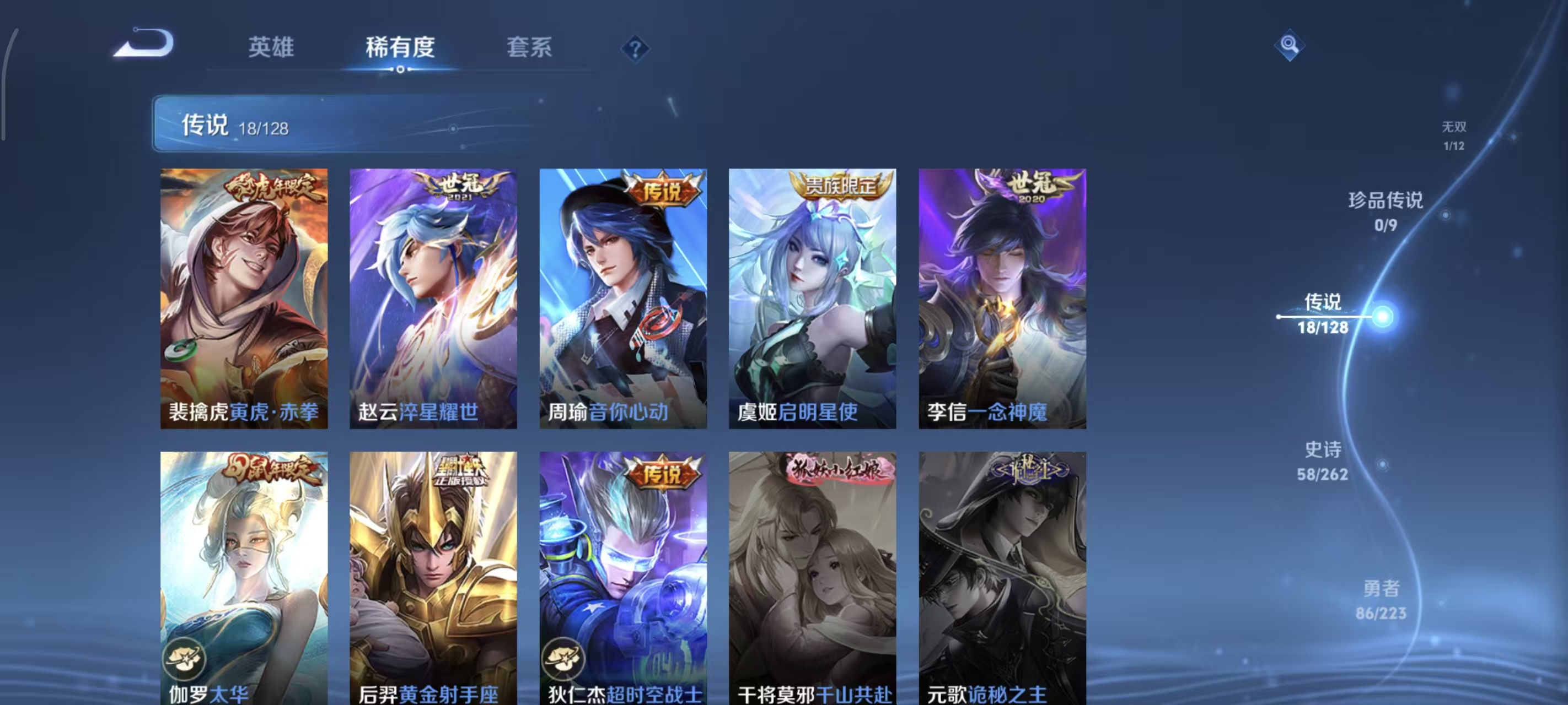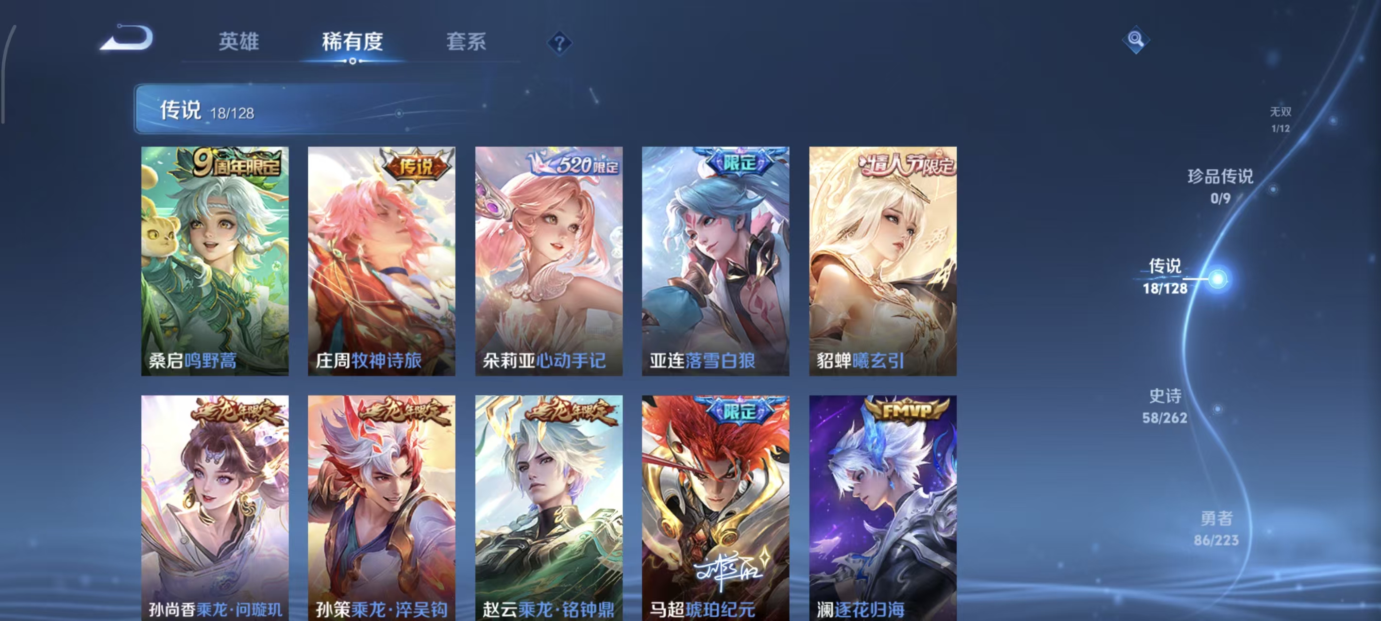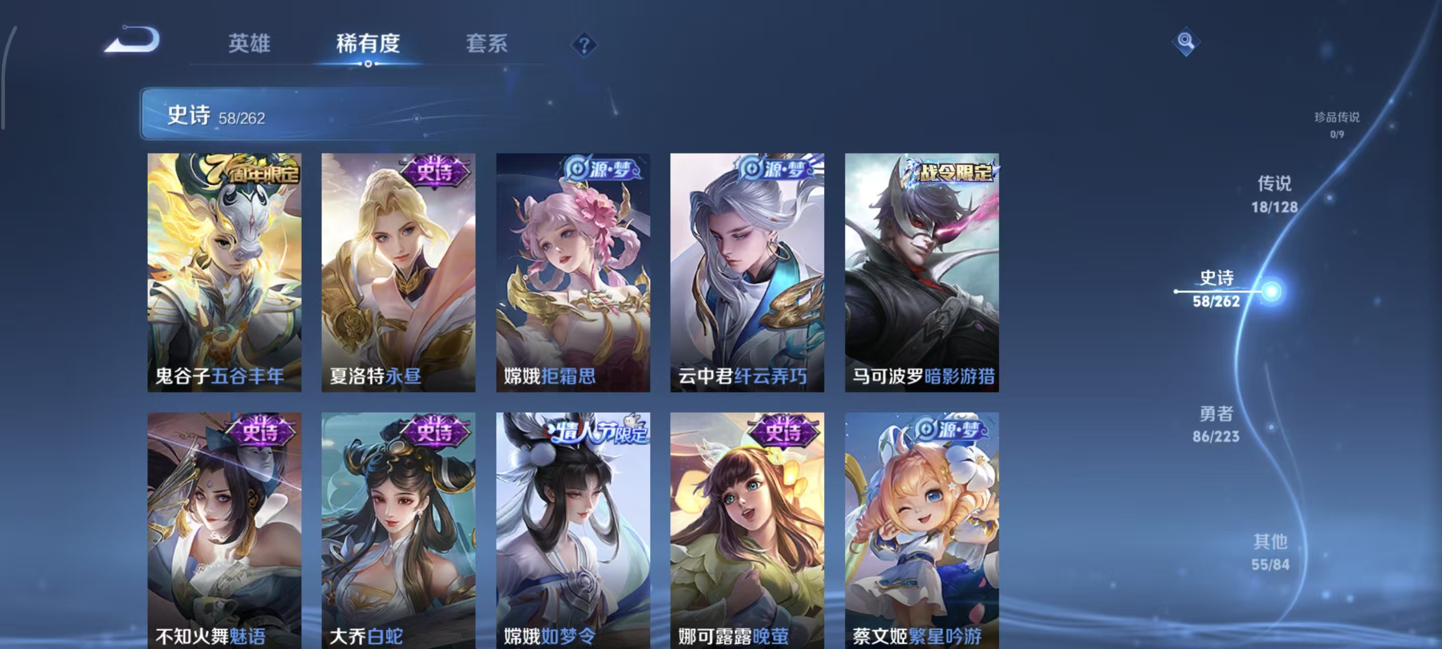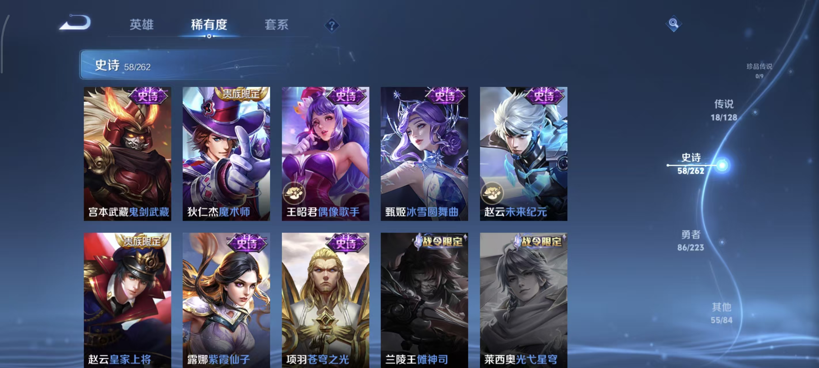- PX_2085982-贵族8/皮肤302/典藏1/传说18/史诗95/英雄123/鸣剑曳影/优雅恋人/特工战影/胡桃夹子/末日机甲女/白虎志/云鹰飞将/启明星使/炽阳神光/时雨天司/碎云/诗剑行/鹤羽星尊/妄想实况/鹤归松栖女/惊梅引/遇见神鼓/桑启鸣野蒿/嬴政玄雷天君/云缨幻光神枪/虞姬愿照岁时盈/女娲愿照千秋盛/狰/姜子牙天穹之誓/杨戬破阵退雄兵/狄仁杰阴阳师/凯尔特女王/赵云皇家上将/引擎之